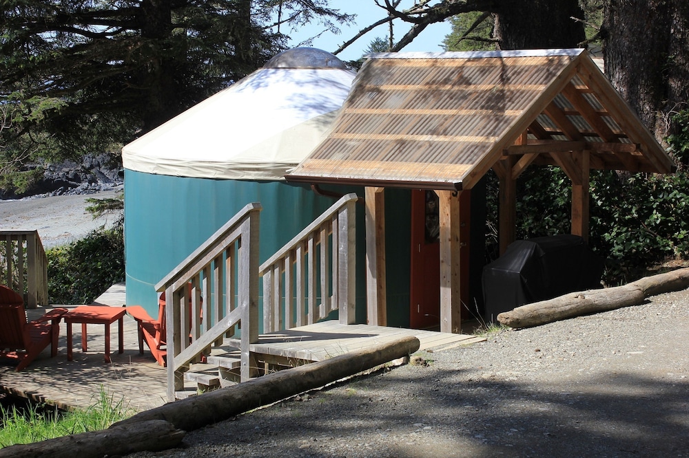 The draw of the yurts are to have the pleasure of waking up right next to the ocean with a little more comfort and warmth. The yurts are ideal for mid-season stays in Pacific Rim when it’s just too cold to camp, as they have a propane stove. They also have a BBQ, plates and warm, comfortable bedding.