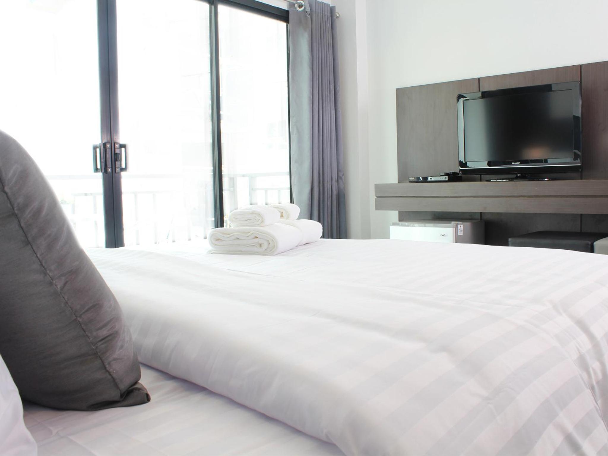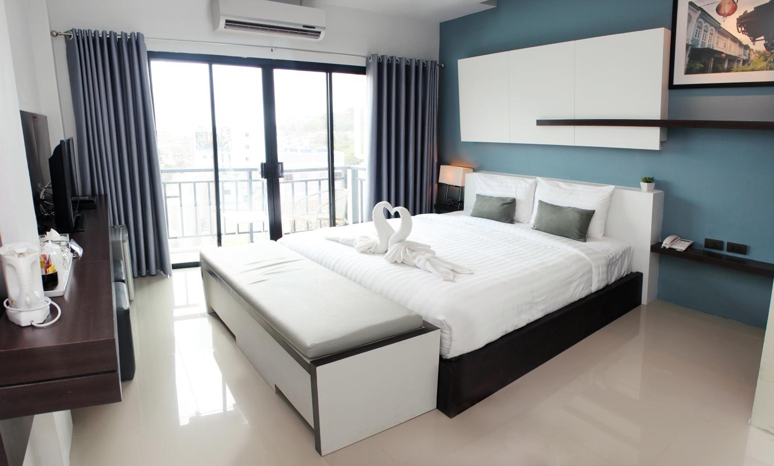 The hotel features modern rooms with floor-to-ceiling glass doors opening to private balconies, ensuring a bright and airy atmosphere. Guests can enjoy amenities such as air conditioning, flat-screen TVs, and fridge in each room, along with en suite bathrooms equipped with shower facilities.