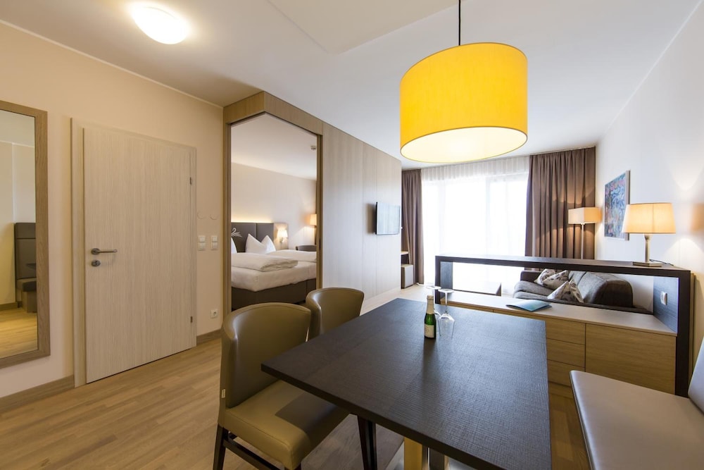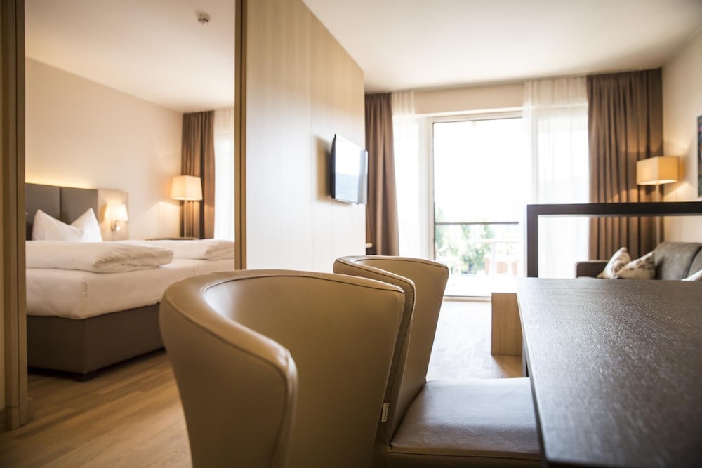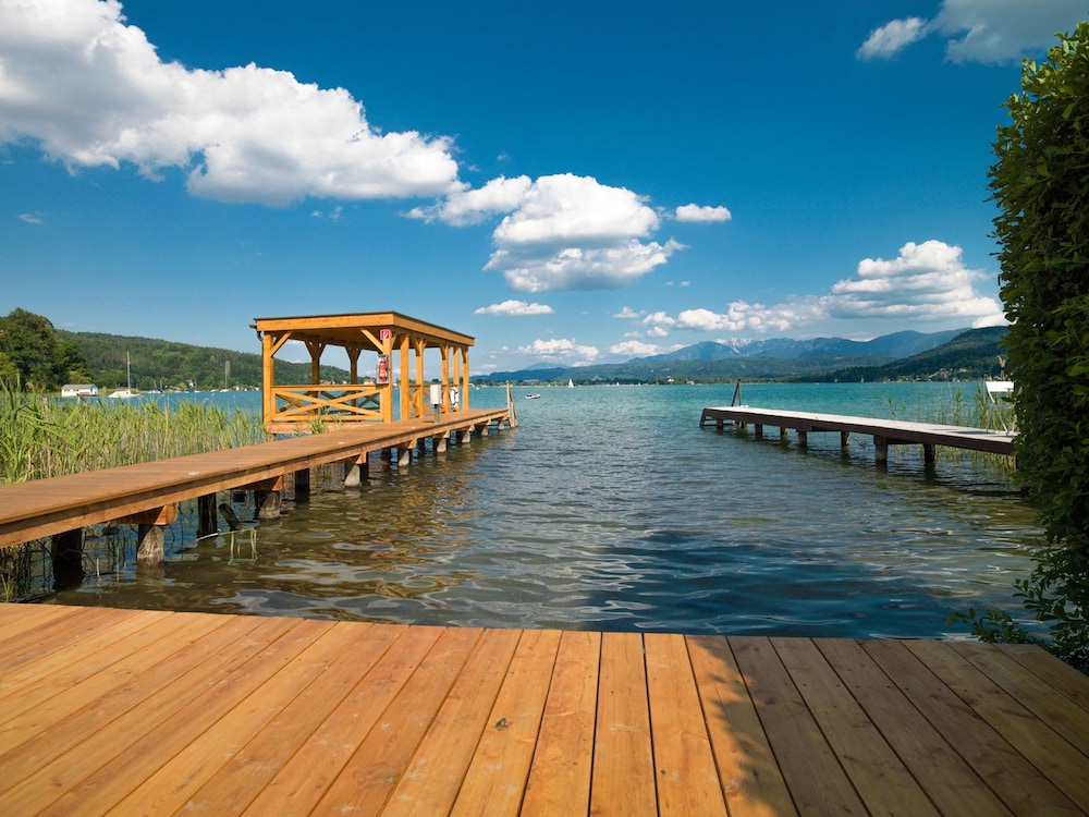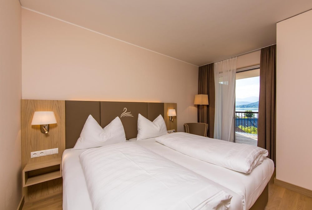 Sehr großzügige Suiten, top sauber und modern auch das Bad. Wir haben toll in dem riesigen Bett mit den herrlichen Matratzen geschlafen. Kaffeemaschine, Eiskasten und Mikrowelle mit Geschirr vorhanden. Tägliche Zimmerreinigung und Austausch der Handtücher. Strandzugang mit nur 96 Schritten ein Traum, auch der beheizte Außenpool ladet zum Schwimmen ein. Genügend Parkplätze vor dem Hoteleingang. Mit dem Auto ist man in 20min. in Velden.