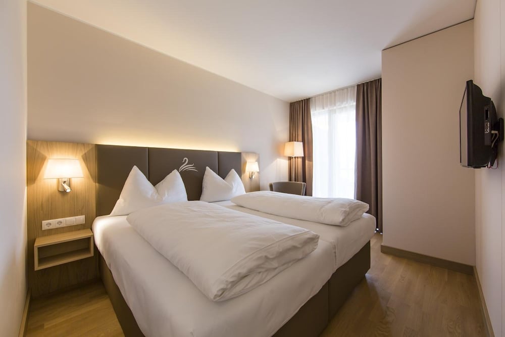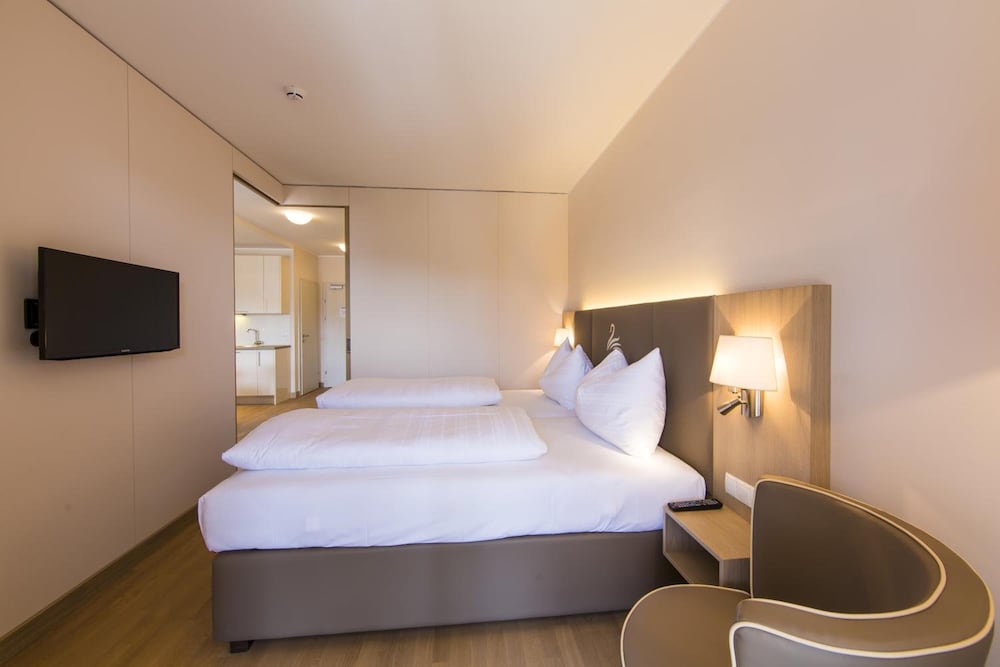 Die gesamte Anlage ist sehr sauber und gepflegt, das Frühstücksbuffet überaus vielfältig und von hervorragender Qualität. Der beheizte Pool war sogar Ende Oktober noch in Betrieb, das zugehörige Seebad machte ebenfalls einen gepflegten Eindruck. Das Hotel liegt nahe am See und direkt beim Bahnhof, die Züge stören aber nicht, wril sie auf der Rückseite vorbeifahren und alle Zimmer zum See hin ausgerichtet sind. Die Zimmer sind modern und großzügig möbliert sowie mit einem praktischen Küchenbereich ausgestattet.