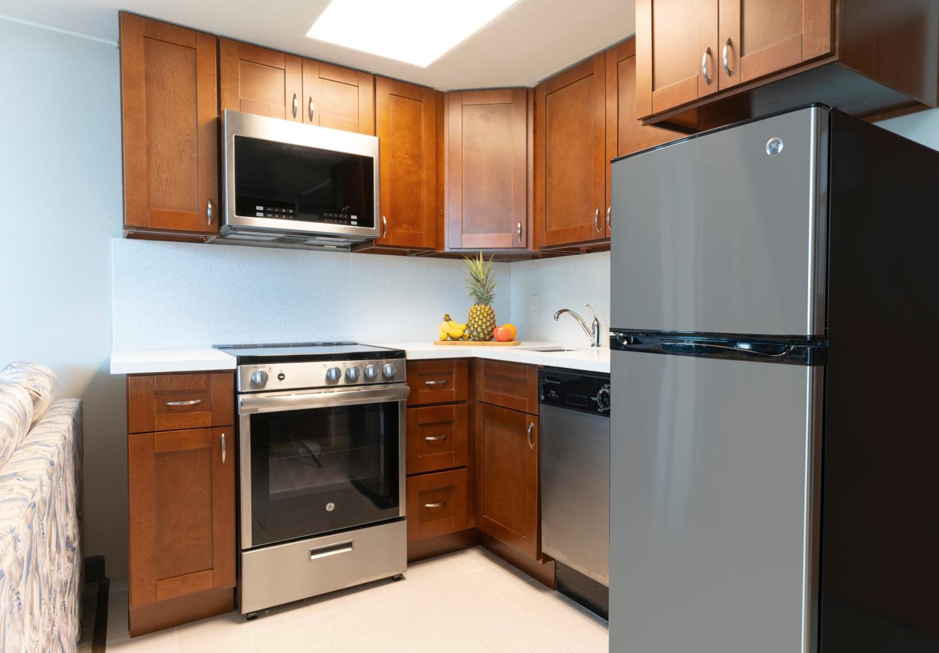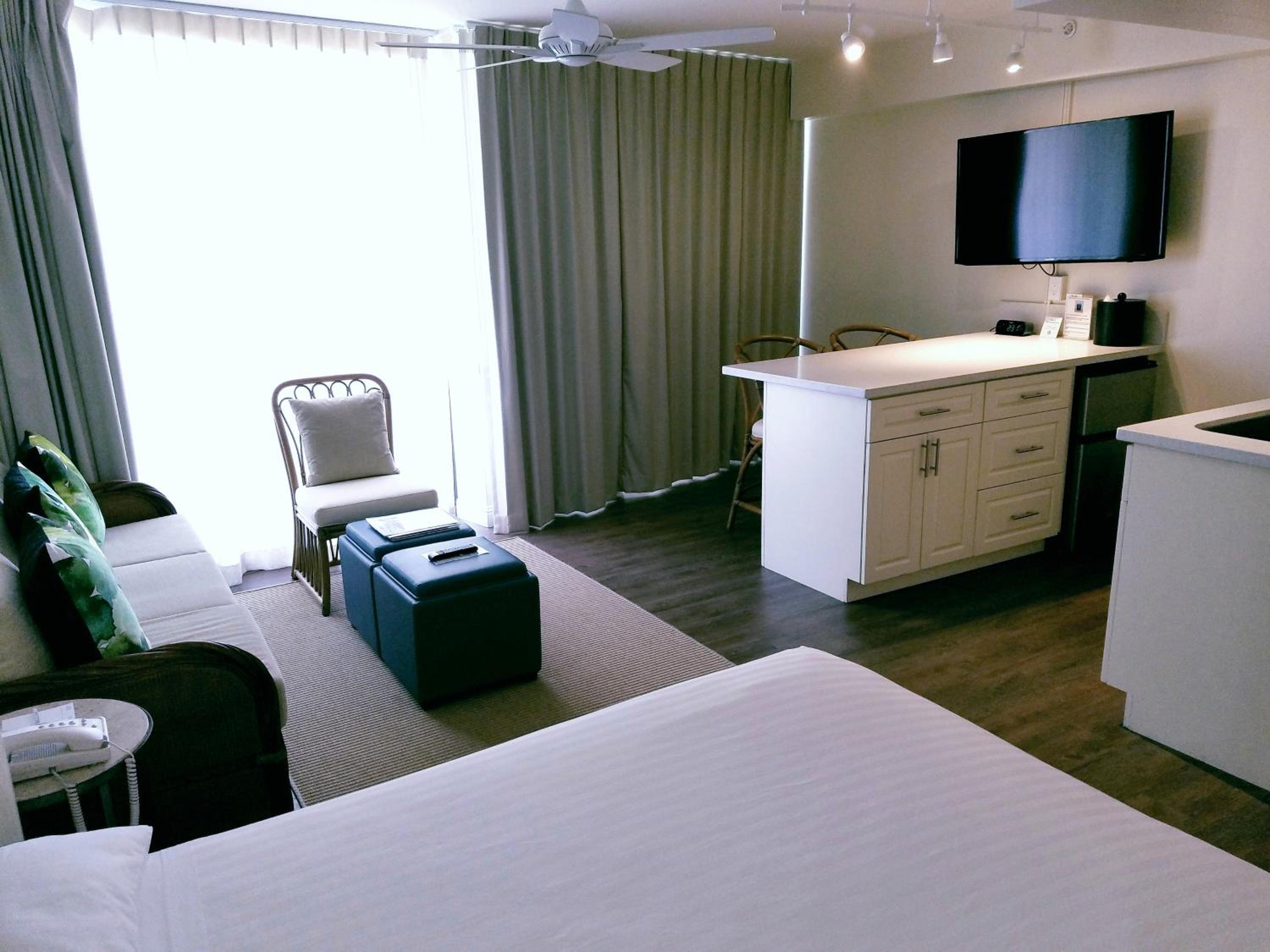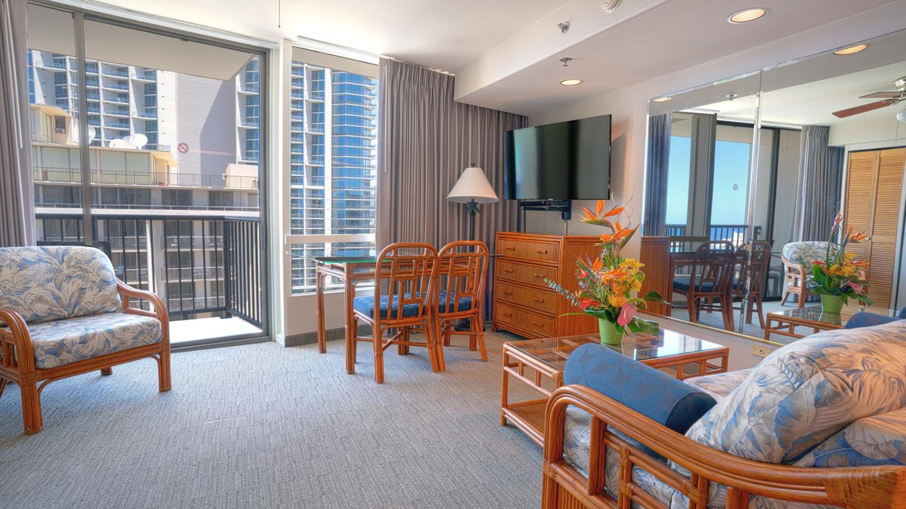 It has an excellent location at the north end of the Royal Hawaiian Centre, with ABC Stores and Denny's restaurant conveniently located just below, next to the lobby. The kitchenette is useful and well equipped with a sink, microwave, fridge and cutlery. The living and dining area is spacious. We arrived early for check-in due to our early flight and were offered a room on the sixth floor (not high enough to offer nice beach views, as they were obscured by surrounding buildings). We accepted this room as we wanted an earlier check-in time.