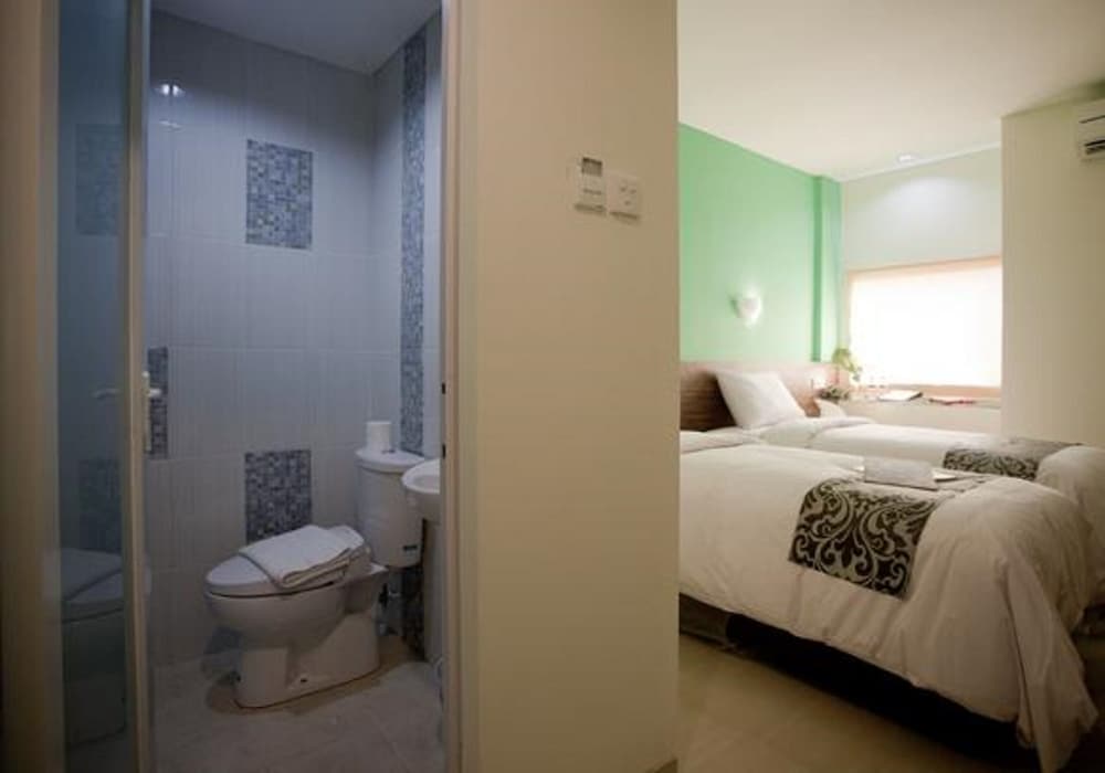 I guess it's cheap, tiles are old and worn stain on sheets hair on the floor air con very weak. We only used it for shower and luggage store.