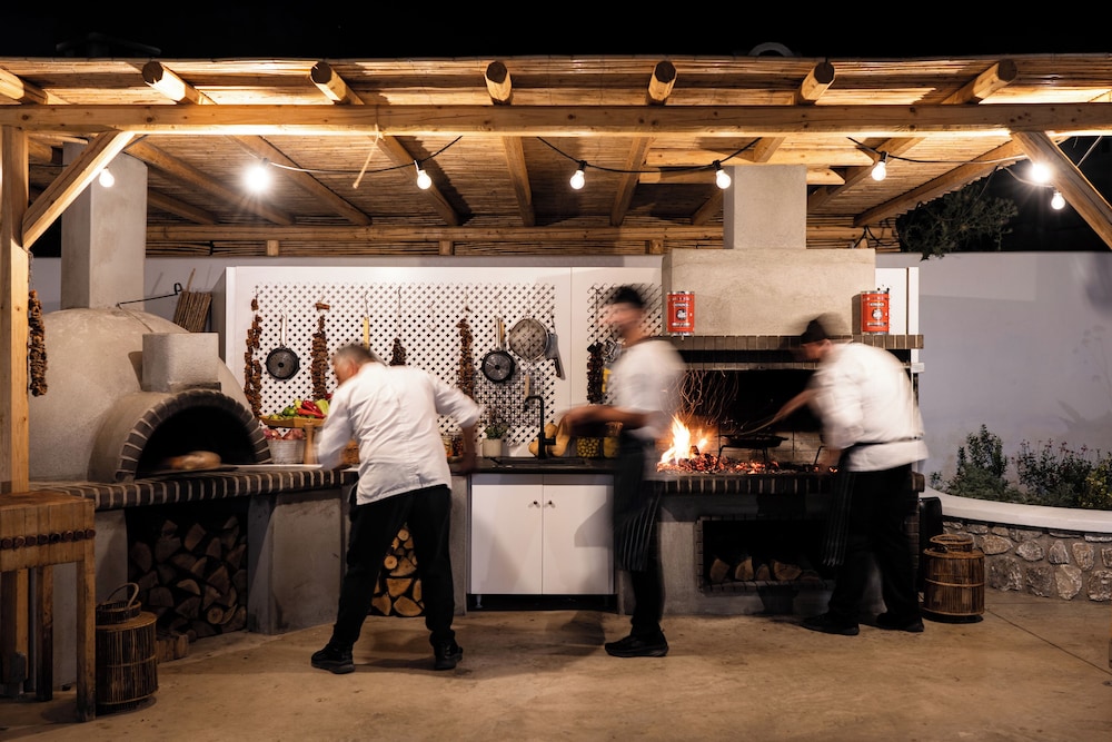 No restaurants within walking distance but The hotel offered a free shuttle both ways to the capital town of Fira (2miles away) where there were plenty of eateries. The concierge booked us 2 incredible excursions - the first was a private guided tour by car around the island (5 hours). The second was a day/sunset catamaran cruise.