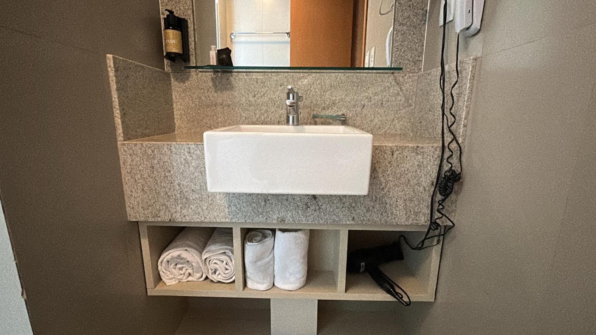 O banheiro é um pouco apertado, mas nada que prejudique.