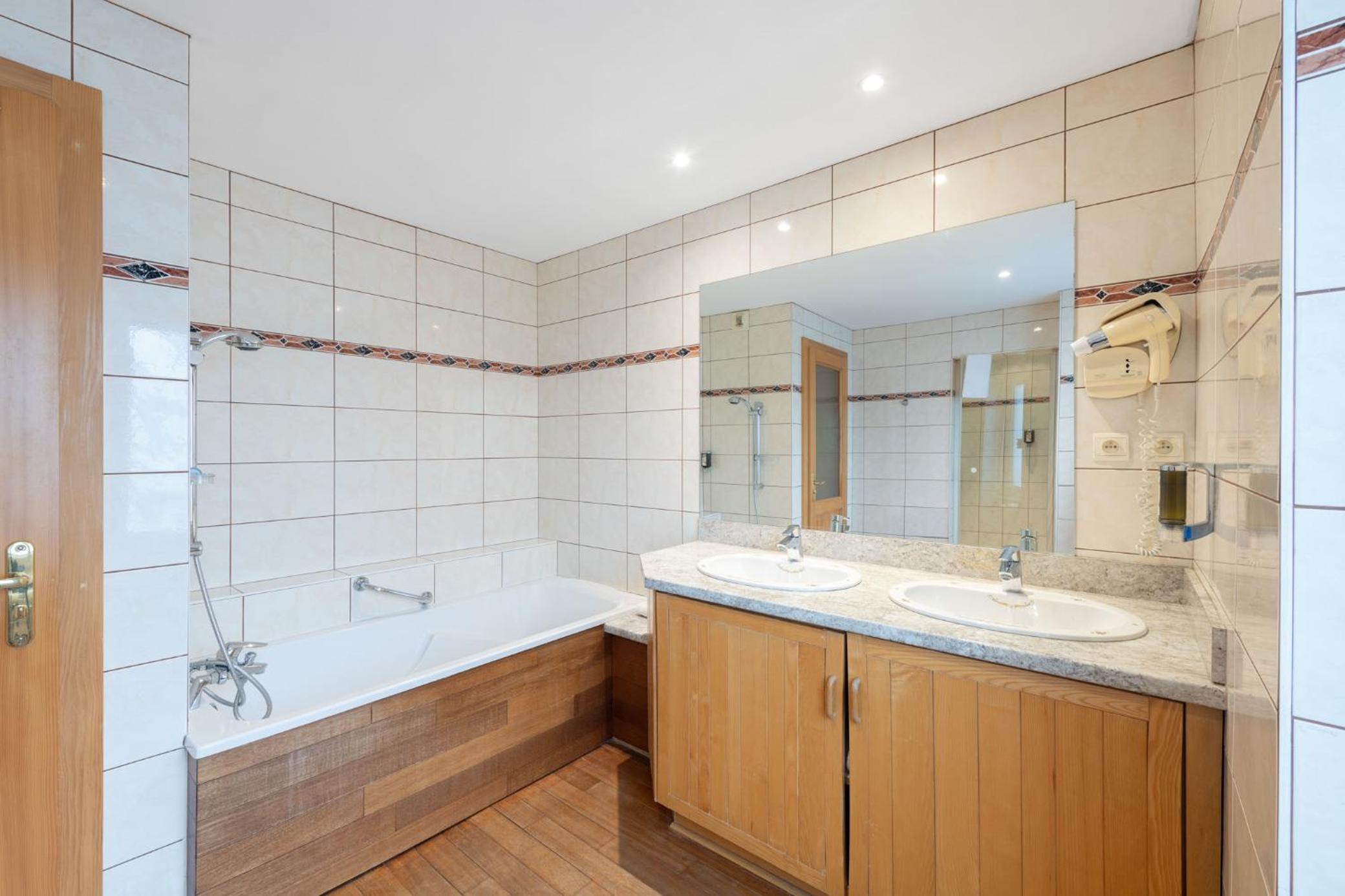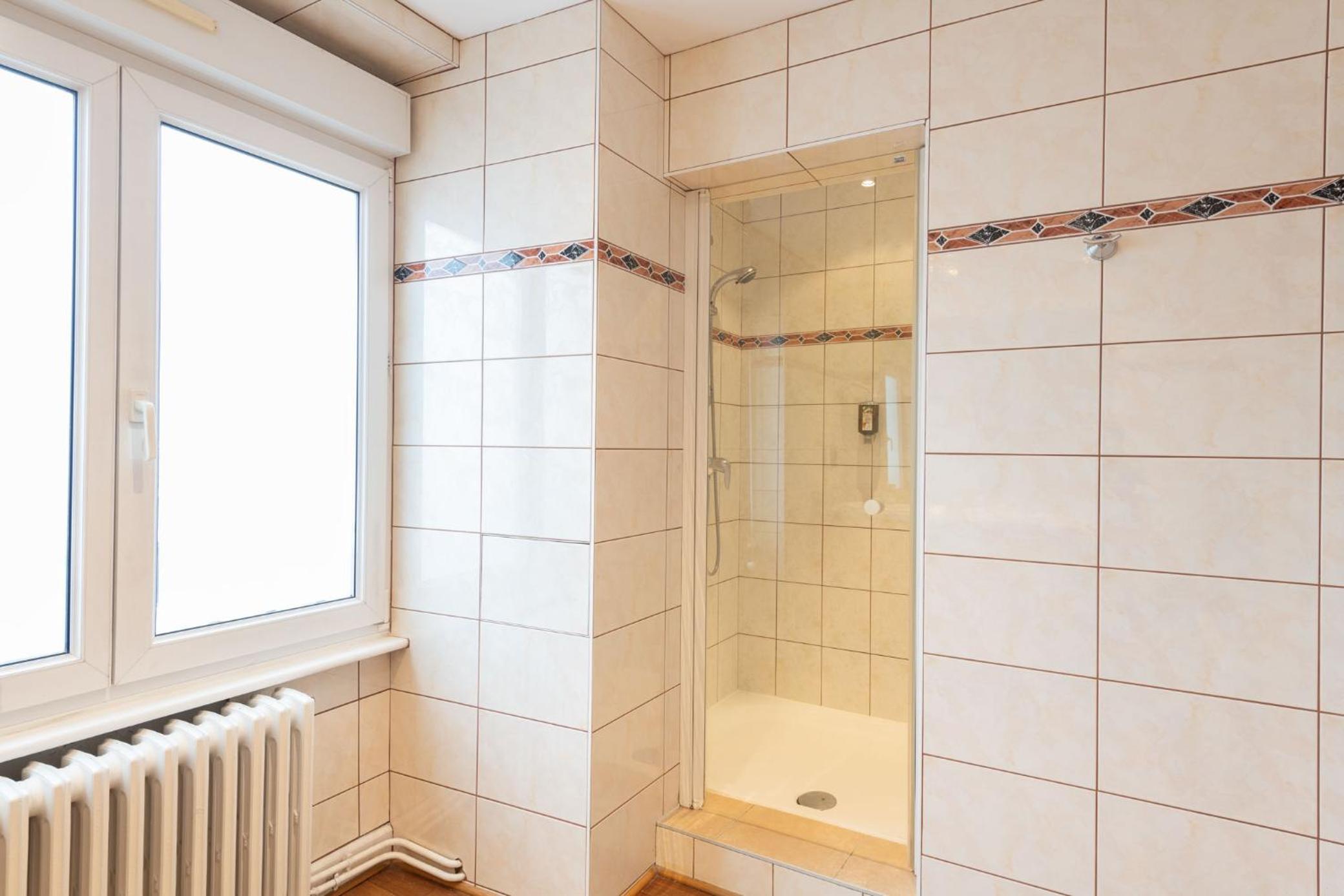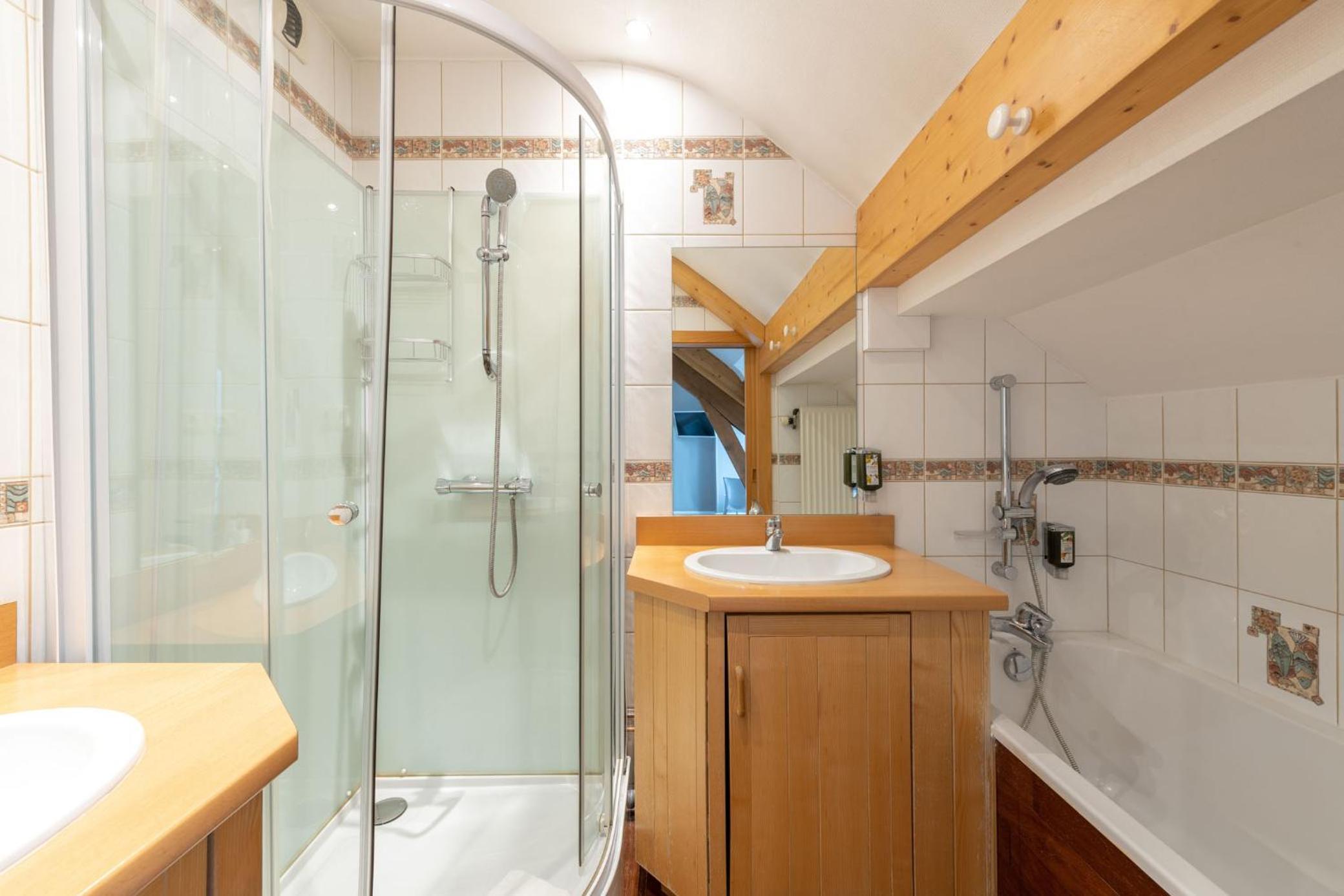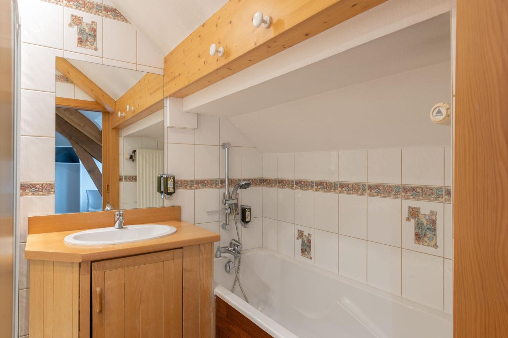Salle de bain un peu vieillote. Impossible de prendre une douche dans la baignoire. Pièce trop mansardée.