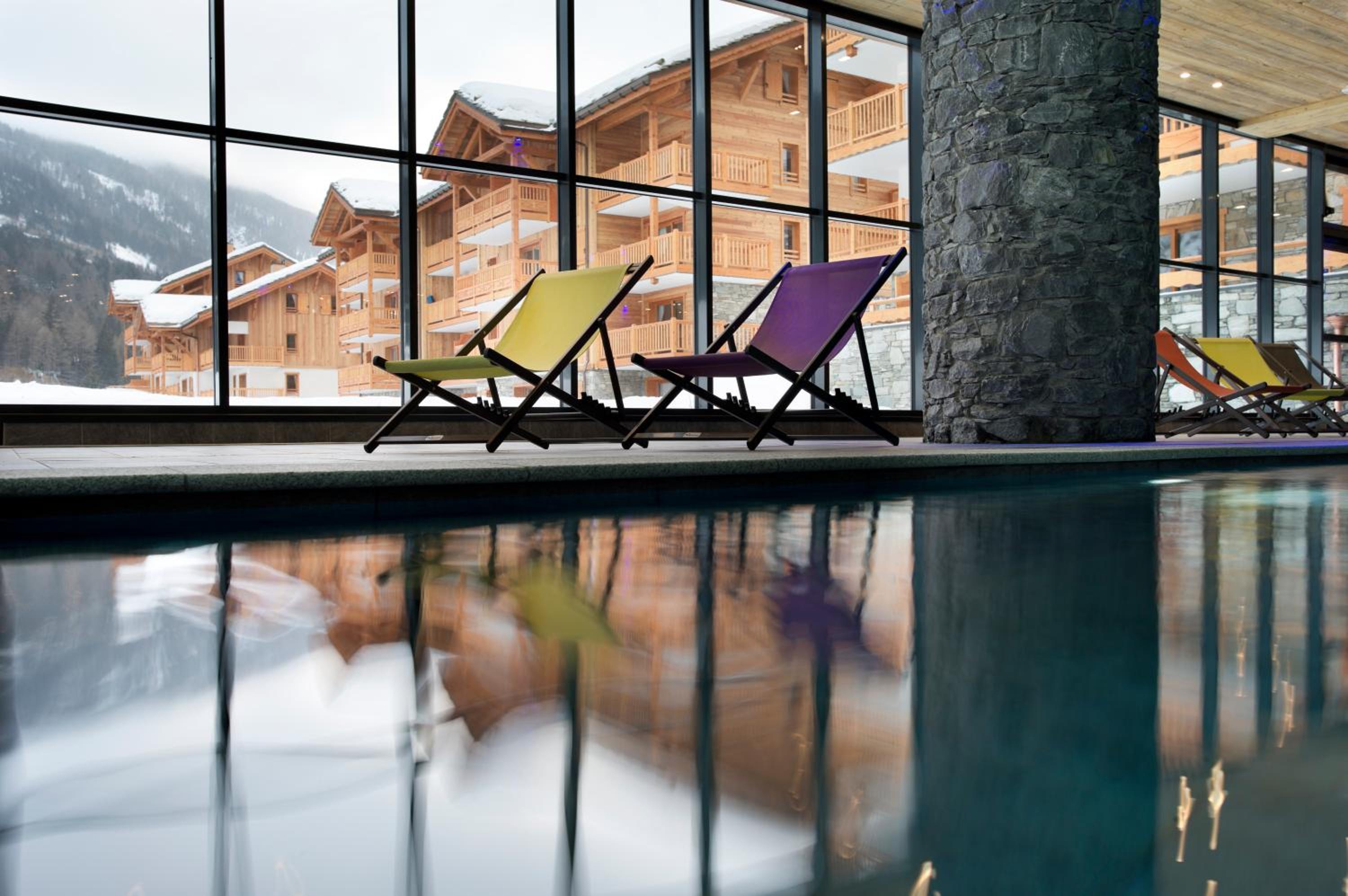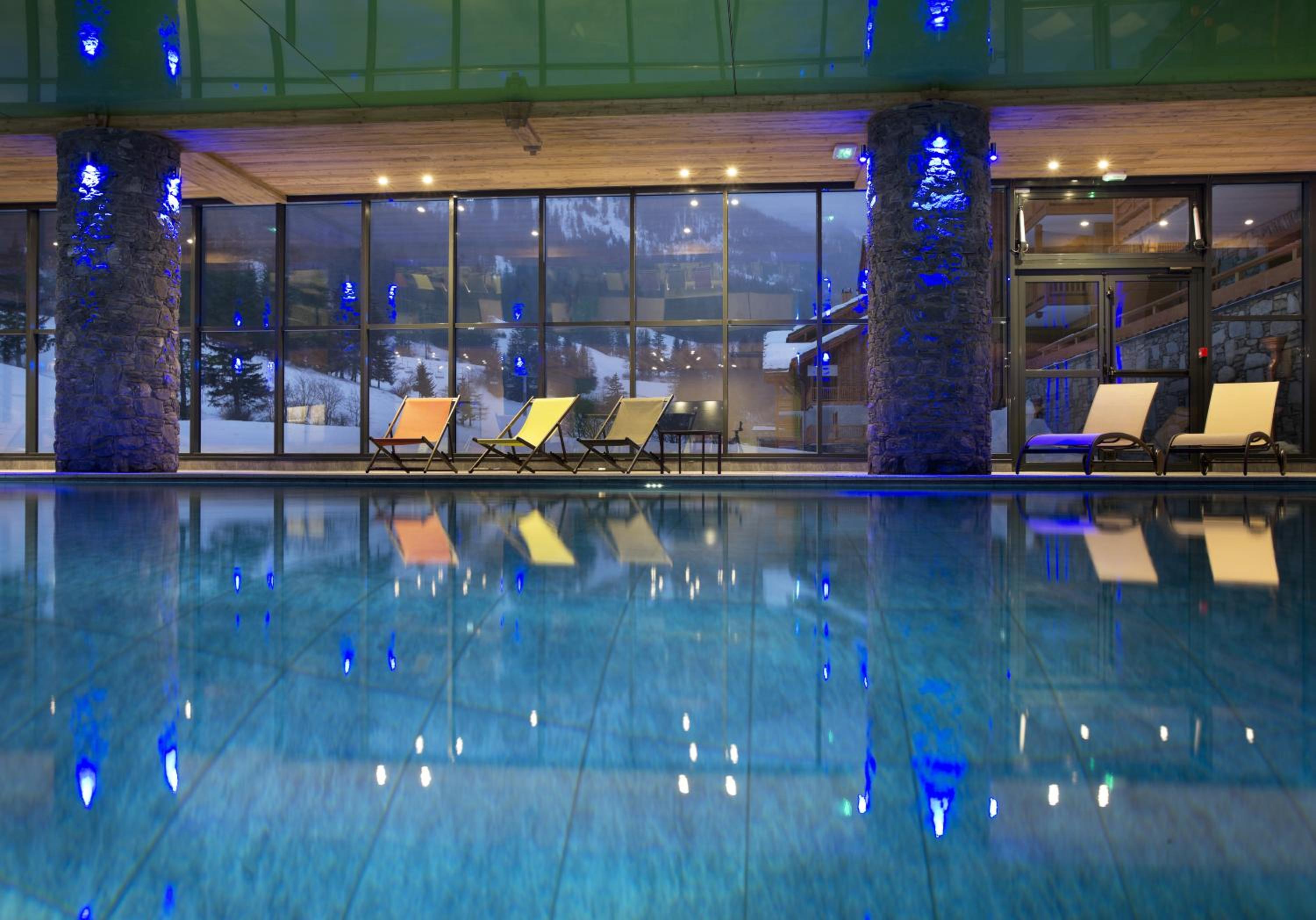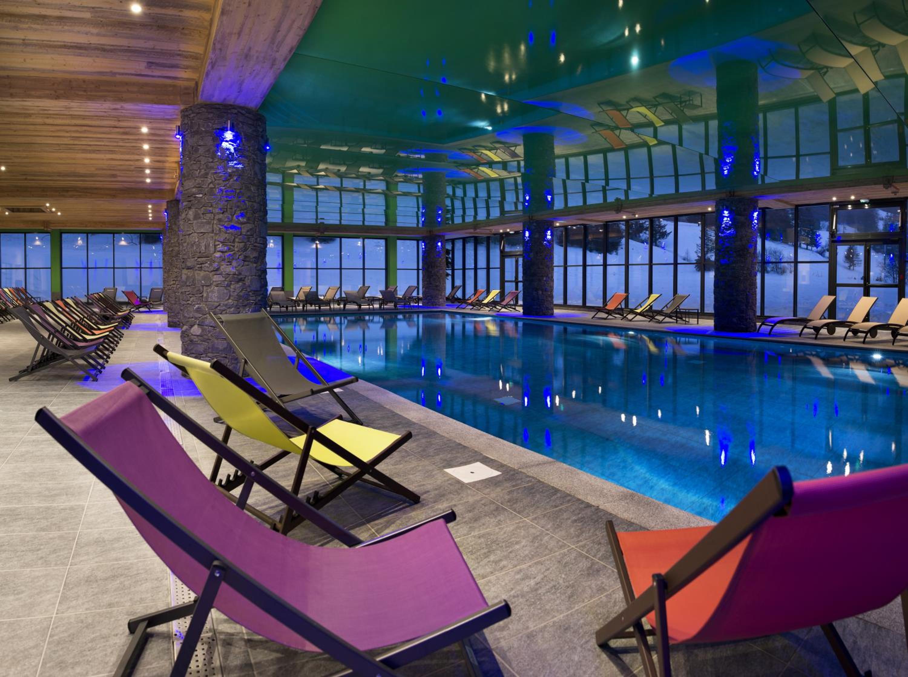 The pool and spa area is big, with plenty of deck chairs, 2 hot tubs, 2 saunas and 2 steam rooms! Again this looks out onto the slopes!