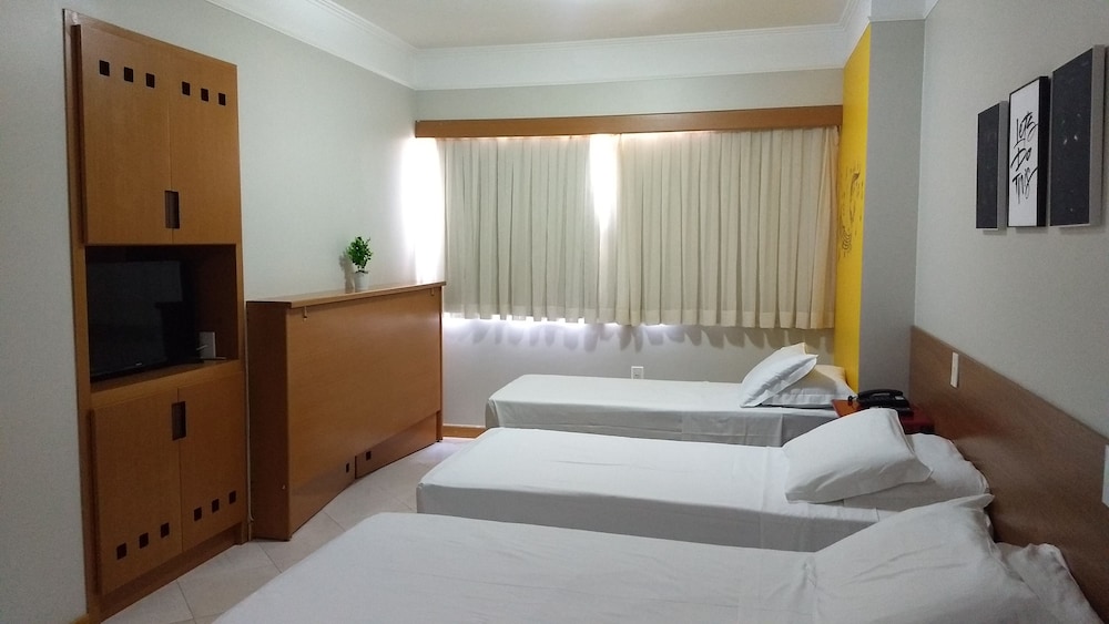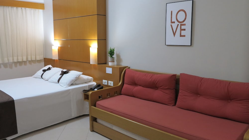 A hospedagem é boa, bem localizada, quarto confortável, limpo, bom tamanho, banheiro com toalhas limpas, porem não são macias, tem sabonete, mas não tem shampoo, janelas sem telas de proteção, achei muito perigoso, eu fiquei no nono andar, três piscinas, sauna, hidro, etc. cafe da manha excelente, funcionários educados,
