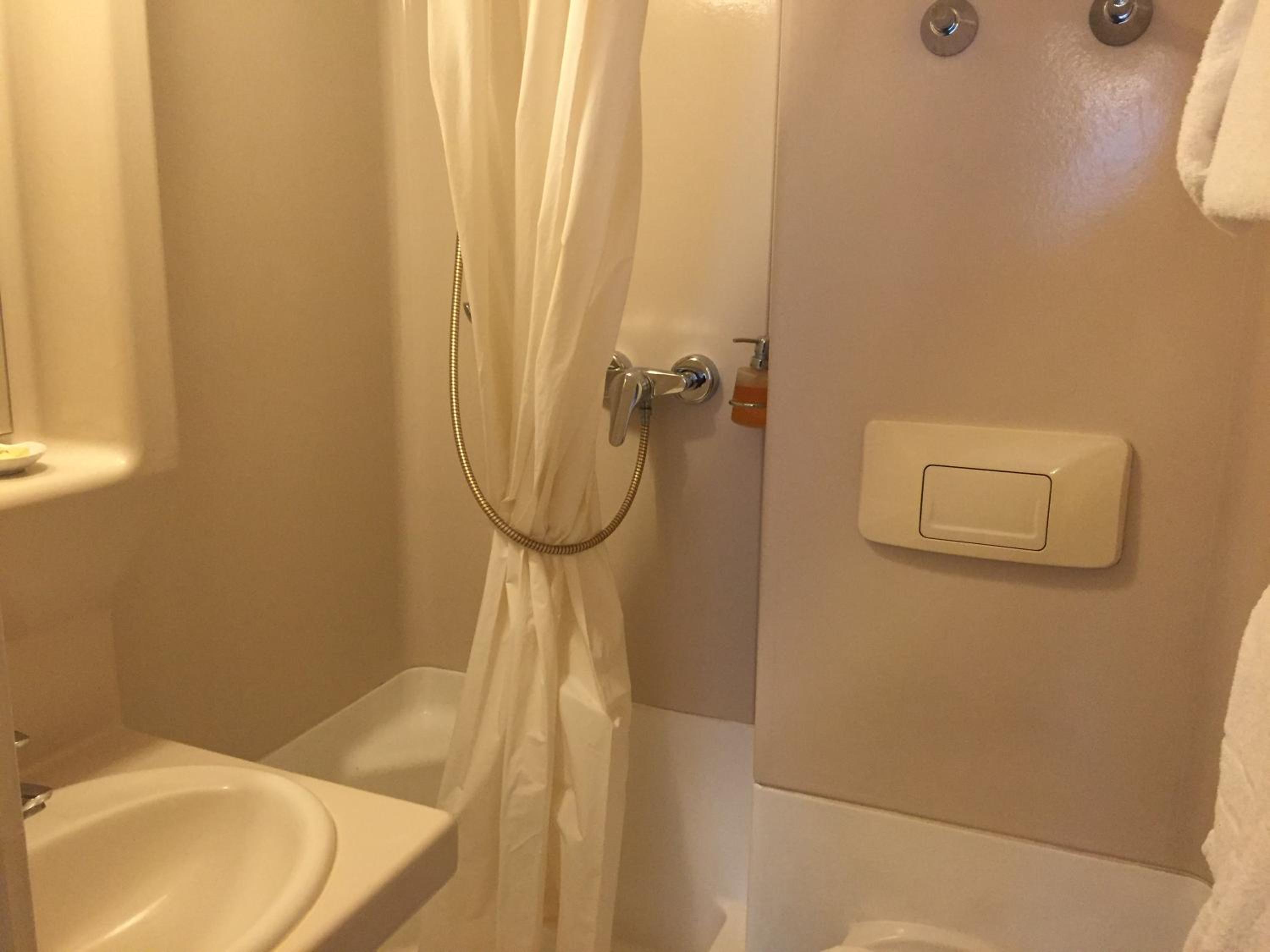 The bathroom was very old. One door of the shower was missing. Below thw mirrow you could not put anything. It would glide down because it was broken…