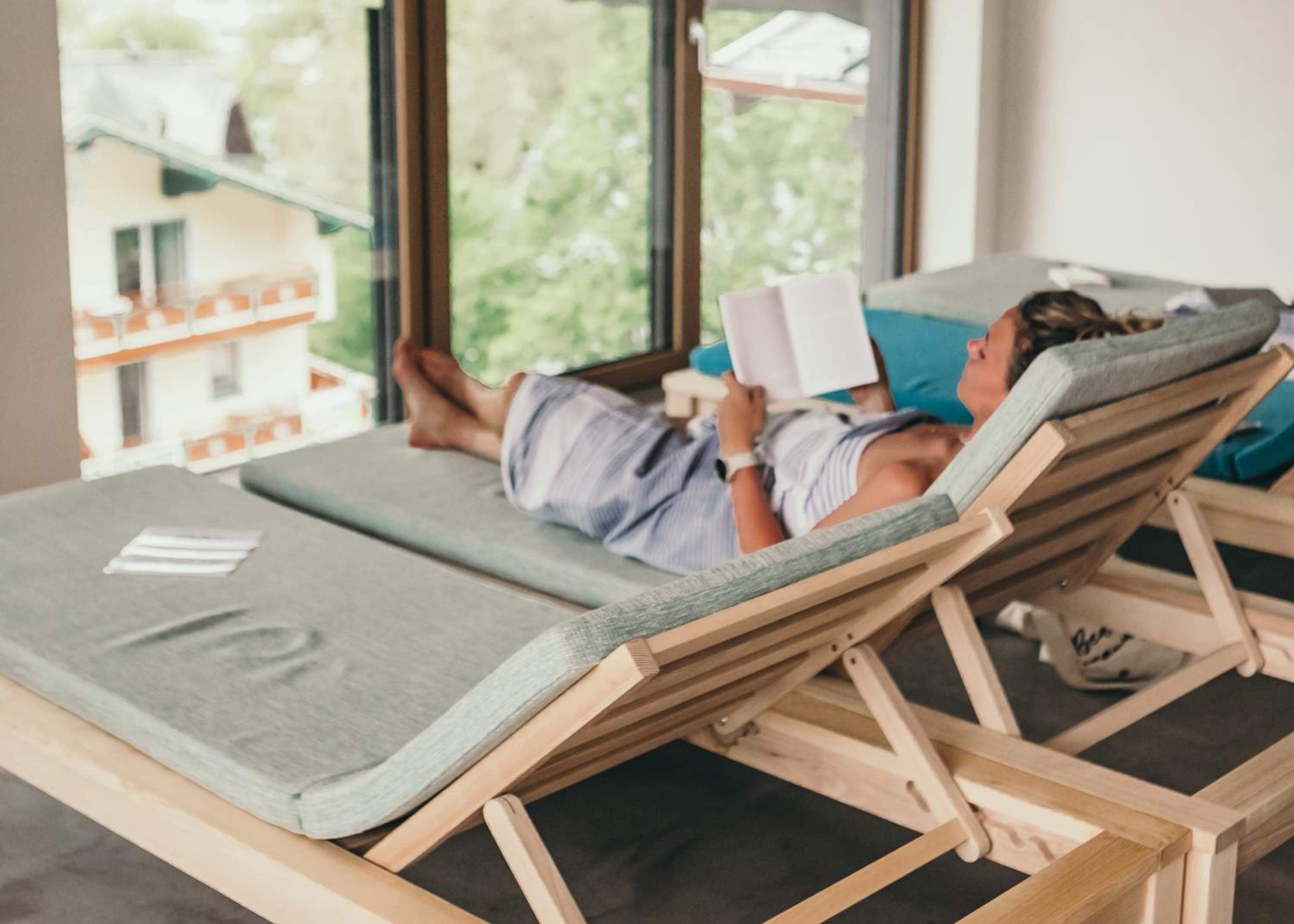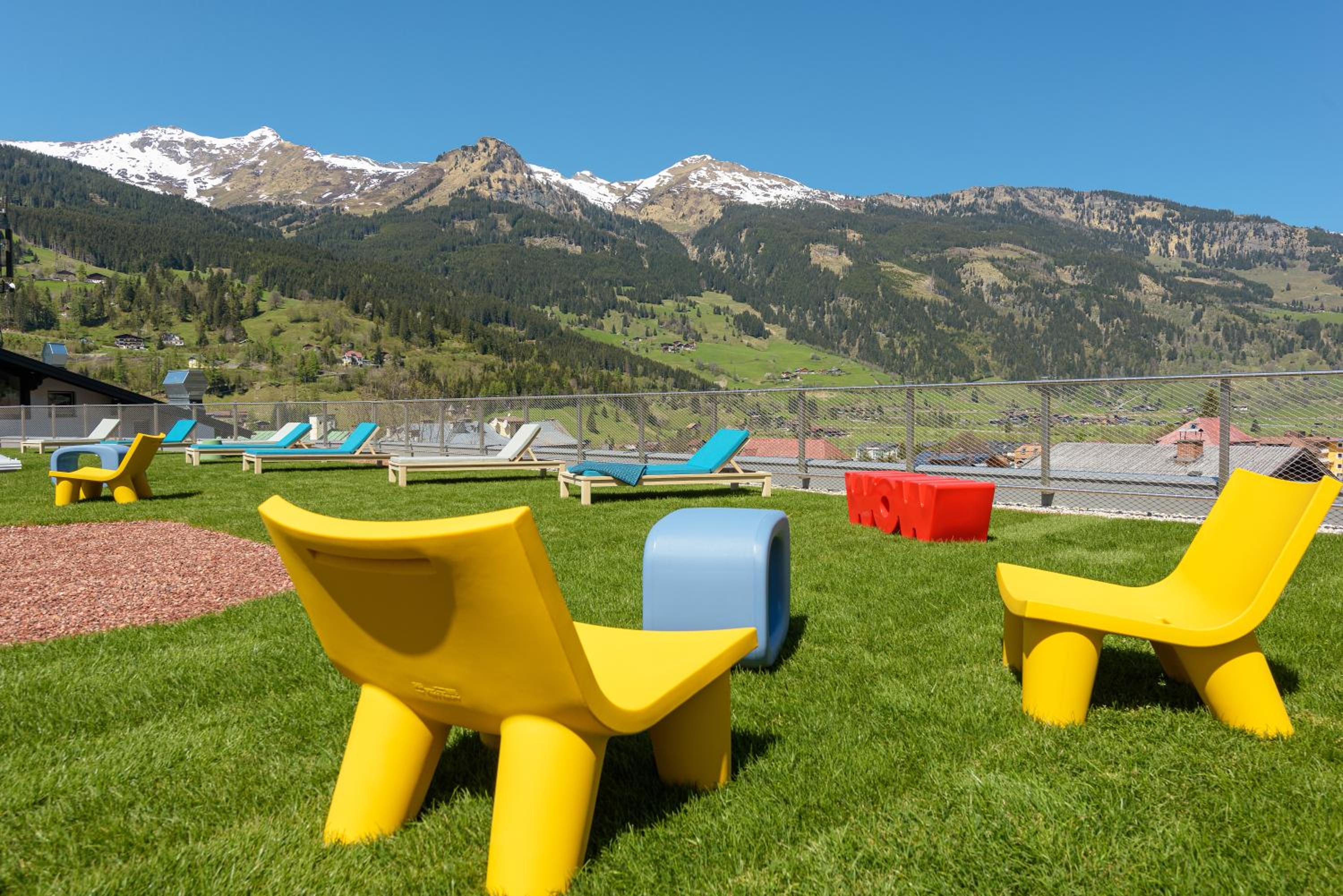 Relax and rejuvenate at our Himmelblü Spa on the rooftop, featuring stunning mountain views, saunas, a yoga room, and a serene roof garden. Additional amenities include a fitness area, library, seminar room, and storage for sports equipment.