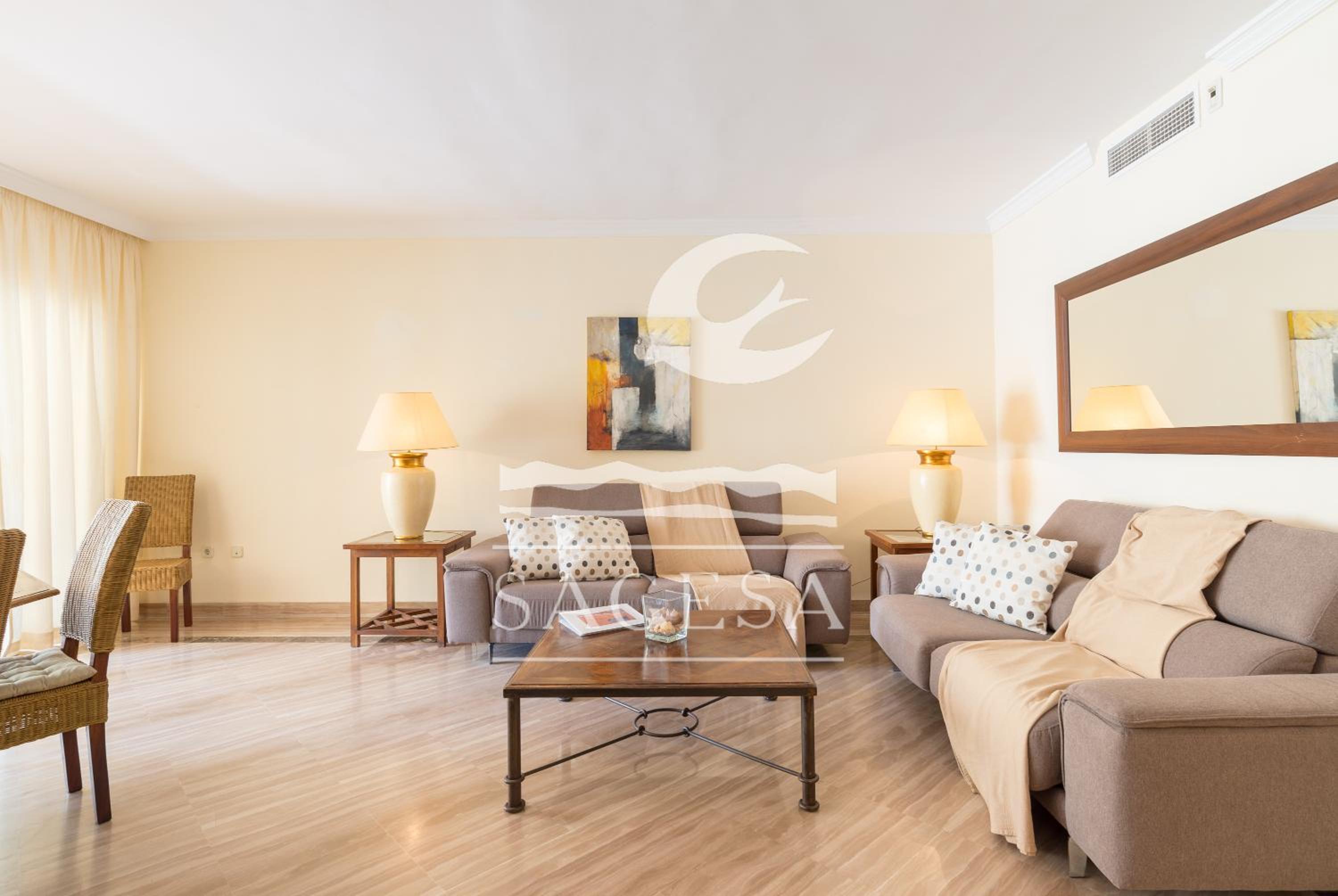 De locatie is super. vlak bij het strand en de verschillende chiringuito's. De ondergrondse binnenparking is ook een pluspunt. Het complex Haciënda Playa heeft mooi en groot zwembad. De kamers waren ruim en de twee badkamers netjes. Hele ruime living met toegang tot het terras.