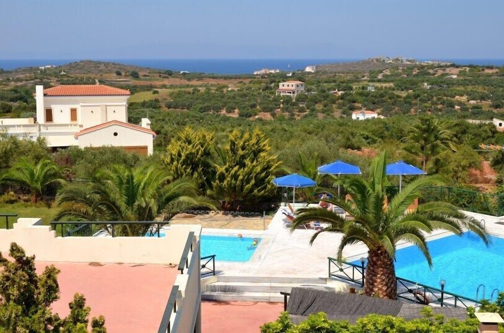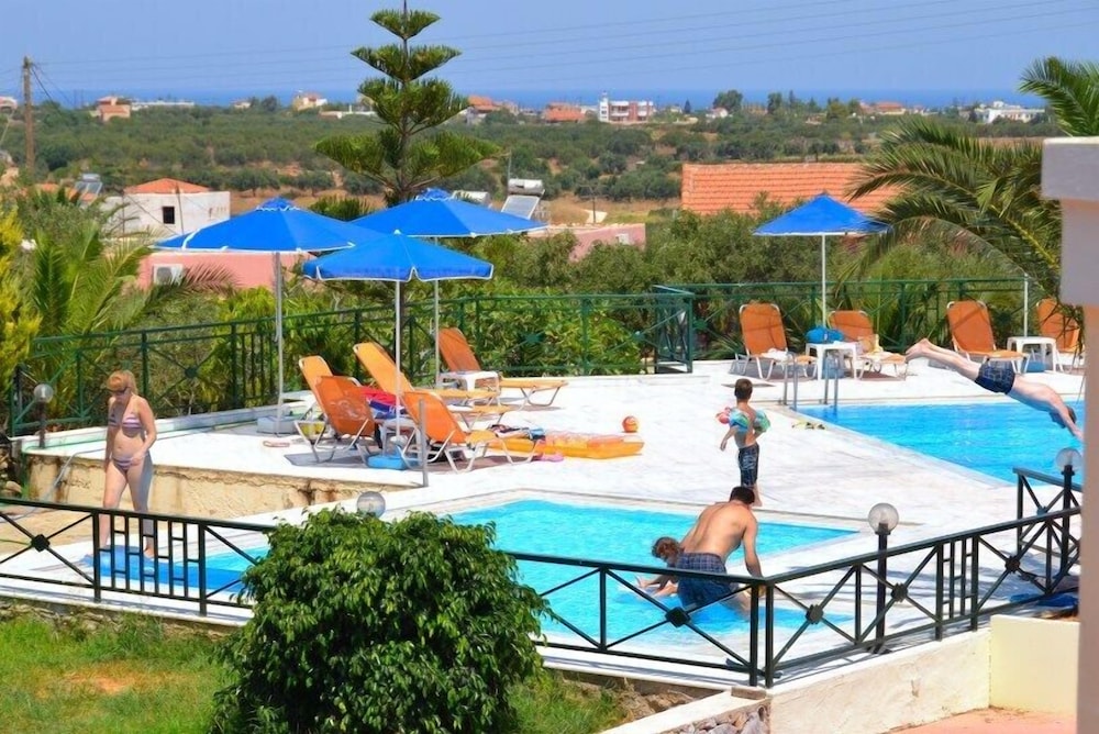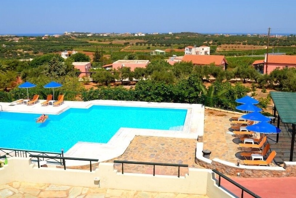 Excellent location set back from the road, lovely views out to the sea in the distance. Rooms huge and cleaned daily. Lovely helpful lady in the bar/cafe area. Huge pool. Tranquil oasis near Chania