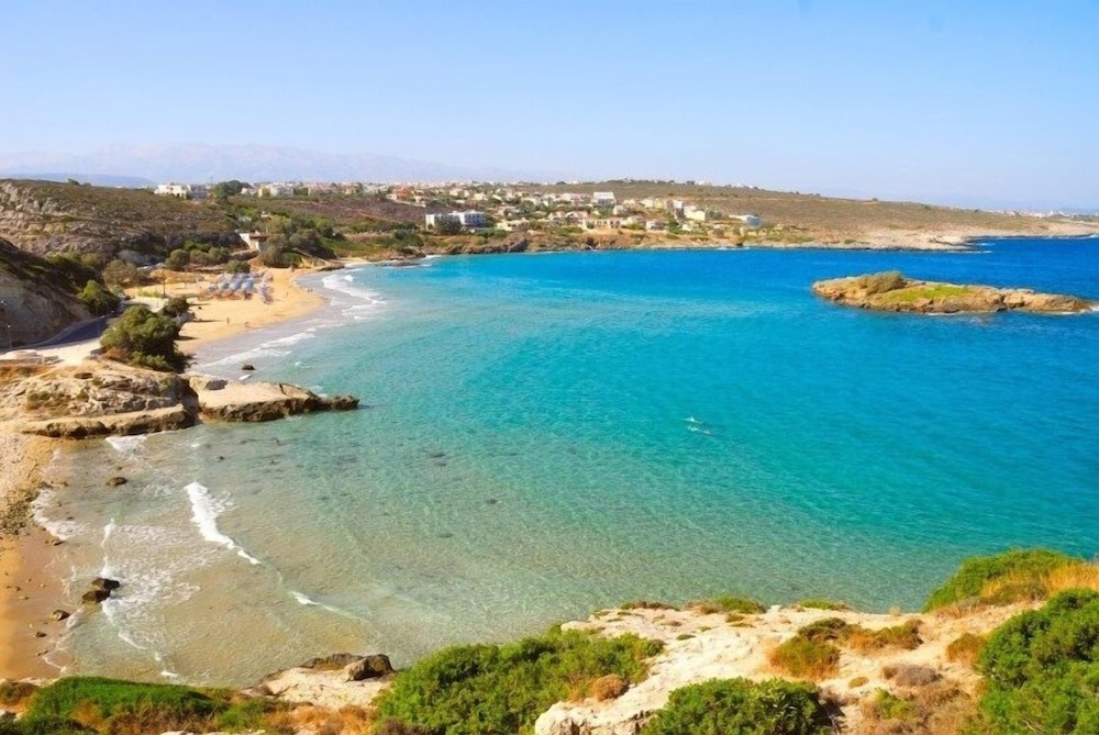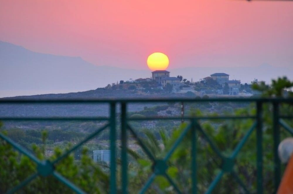 Great property with amazing sunset view over the sea and distant peninsula mountains. Car necessary although lovely and busy taverna perhaps 15 mins walk. Everywhere clean and strong WiFi in apartment and by pool. Vasia and others working in cafe super friendly and helpful with my many questions! Nearest beach 5 mins drive, Kalathas, small but lovely sand and turquoise sea colour - kayaks and SUP available. Only 15 mins from airport but noise not an issue.
