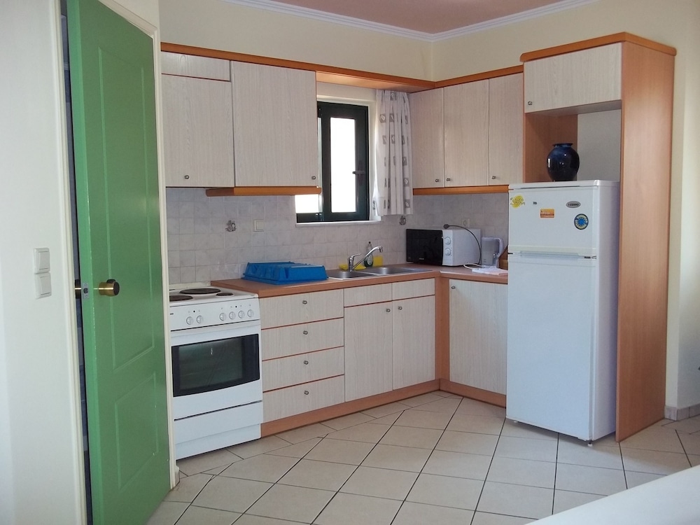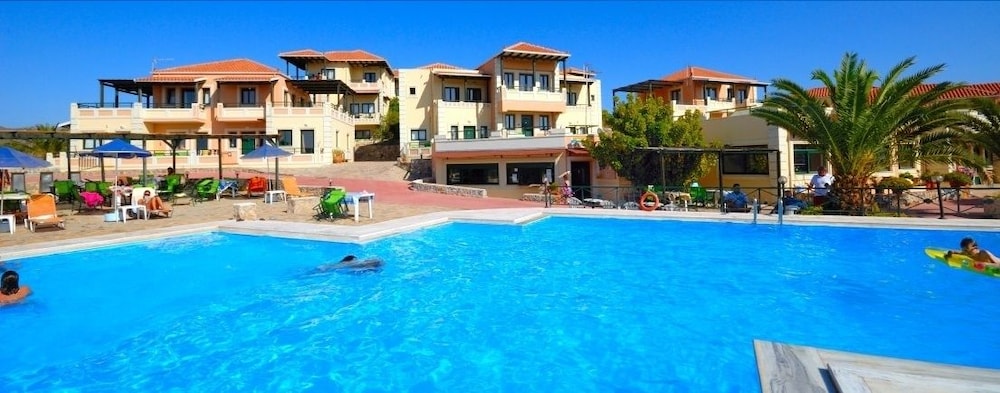 Nice property with 2 good swimming pools equipped with plenty of sun beds, barbecue, car park, bar next to the swimming pool. The rooms are spacious as well as the living room where you can find a Smart TV. The kitchen is equipped with all necessary kitchenware, fridge, microwave, toaster, oven and kettle. Balcony with a view. It's located close to supermarket, different restaurant options and a lovely beach (Golden beach =famous Zorba' s beach) which is just 5 minutes by car. The communication with the hotel staff was very good and they promptly helped us when we needed something. Thanks for the nice stay!