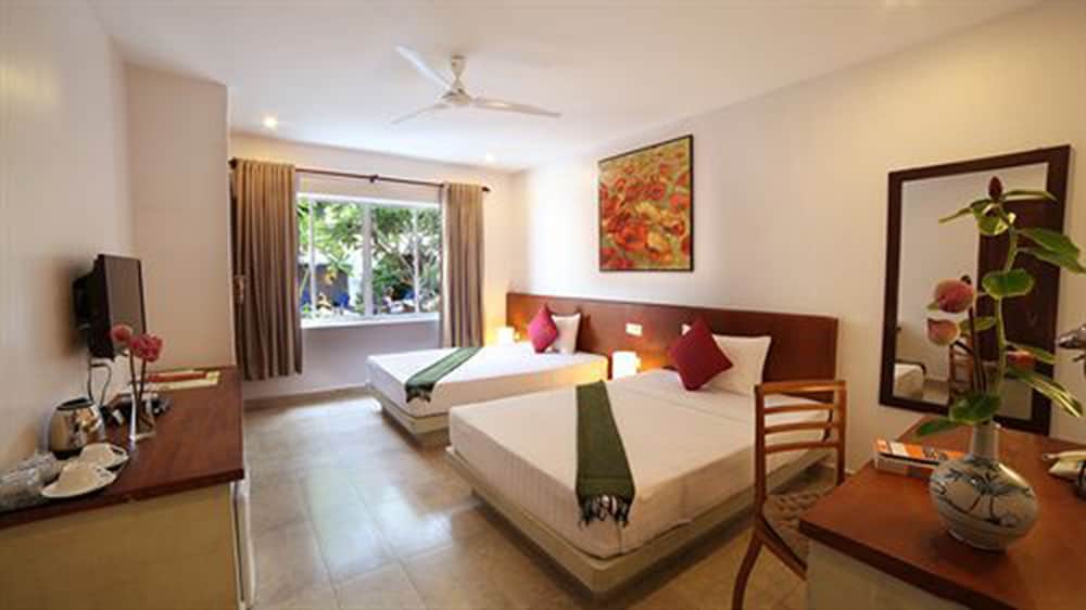 It is an old style, charming hotel. The staff are excellent at helping out tourists. They went out of their way to help me with various issues. There are numerous geckos which are good for pest control and chirp lullabies to sing the patrons to sleep. The menu is simple with both Asian and European choices. There is a small pool for kids and adults. There is a guard watching the front entrance who also picks mangoes from the trees during the day. Dining is open air. Although, there is a meeting room that could be used as a dining area during the stormy parts of the monsoon season. The rooms are cleaned everyday and the hotel encourages patrons to conserve water. Reasonable laundry is free.
