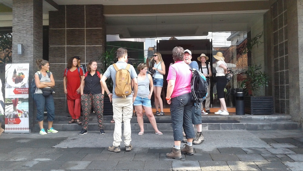 The neighborhood is a bit touristy, but that means several choices for tour operators,mrestaurants and antique shops. Turn to the right exiting the hotel, walk the length of that bloack and croos the busy street there. The nxt block has several good antique shops with batik, masks, carvings and so on, and several good restaurants serving French and Italian, as well as good local cuisine. Pedicabs abound. Hire a bicycle tour, and you are 15 minutes by bicycoe from the countryside, with lovely backroad tours of villages, ruce fields and local life.