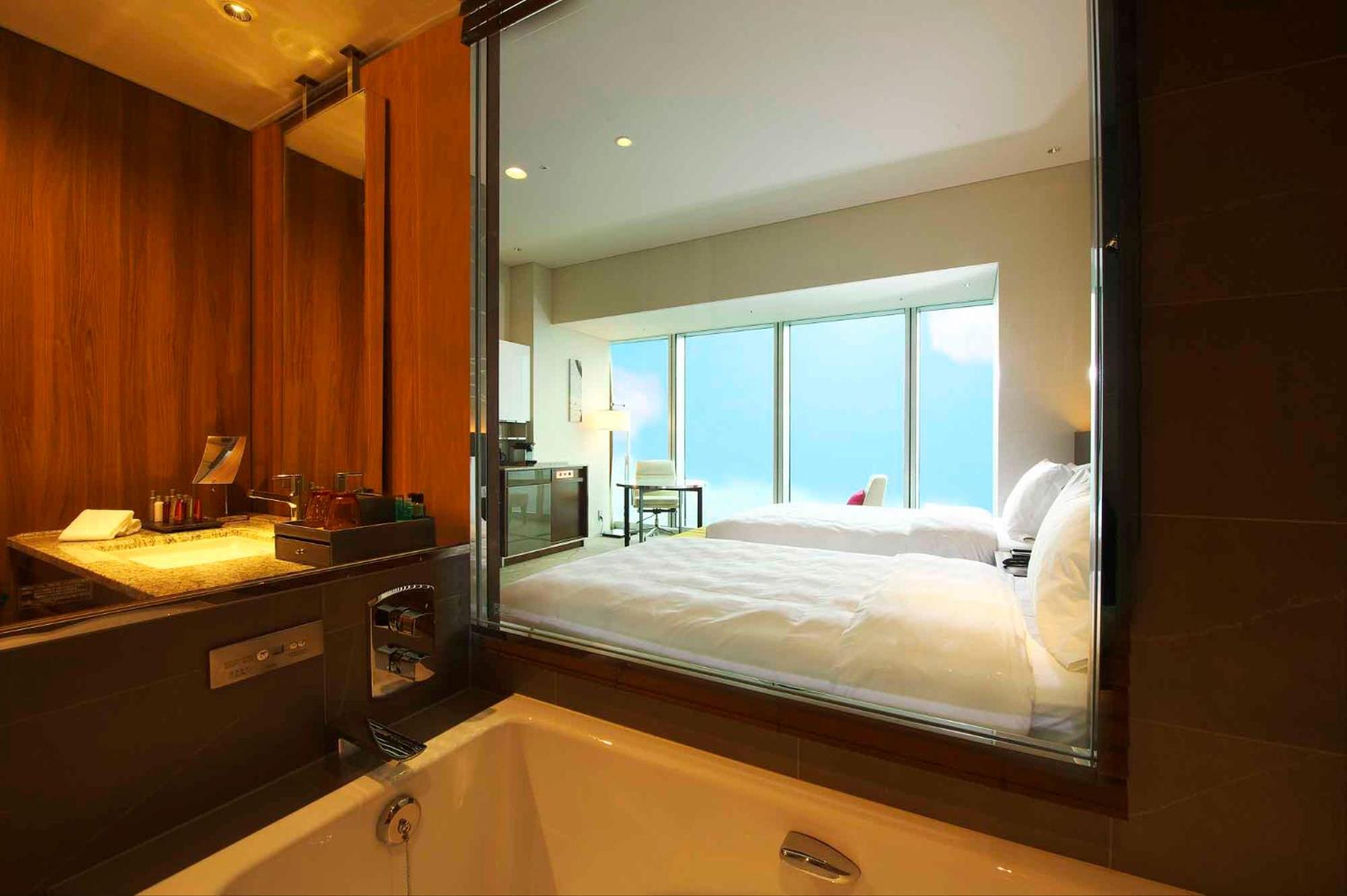 4509号室からの眺めは圧巻でした。客室自体も上質で、贅沢なつくりです。洗面台と浴室を切り替えるスライド式の壁があり、どちらを使っていても景色を楽しめる設計になっています。顔を洗いながら大阪の景色を眺められる、というわけです。