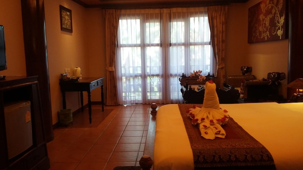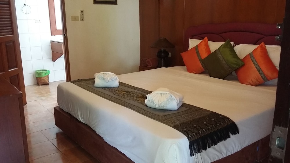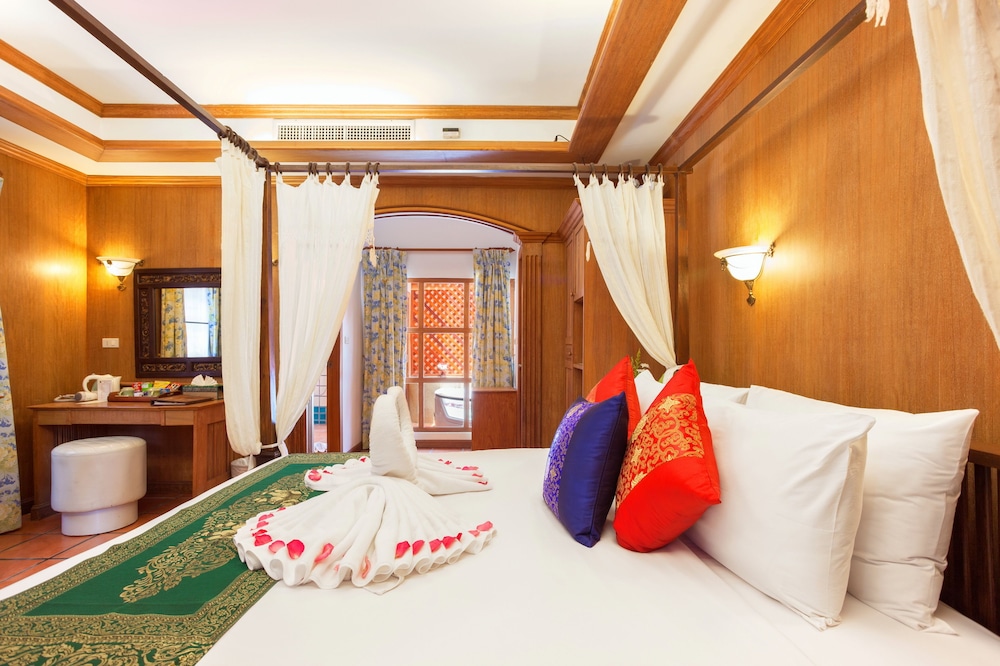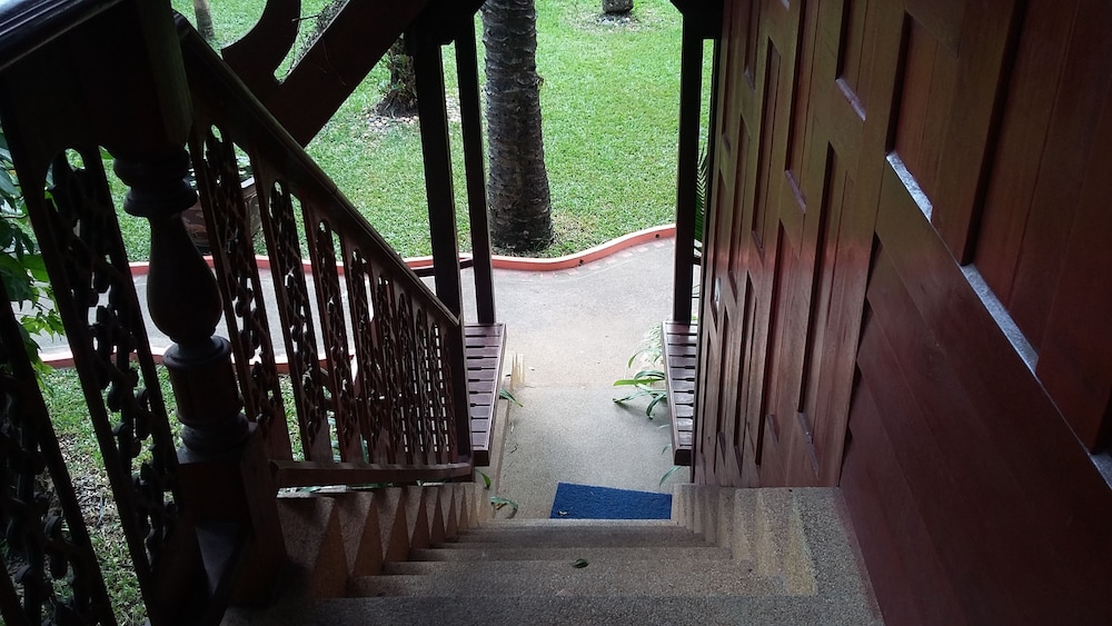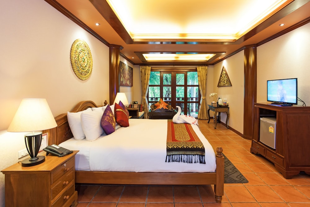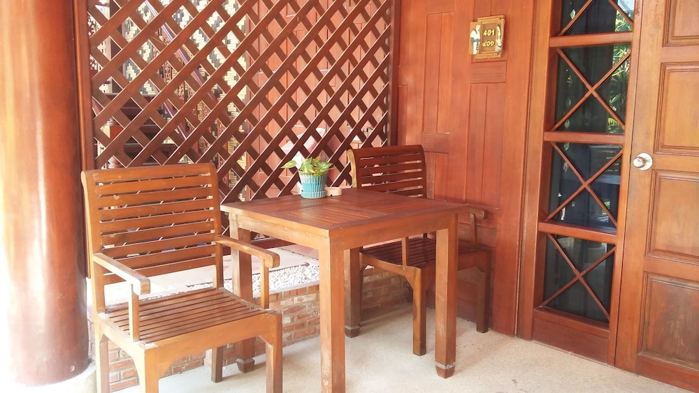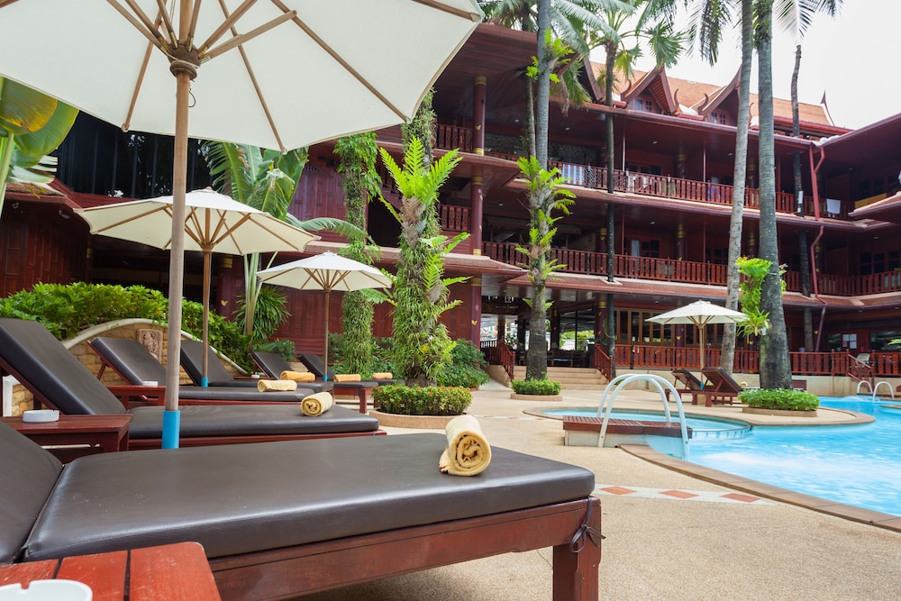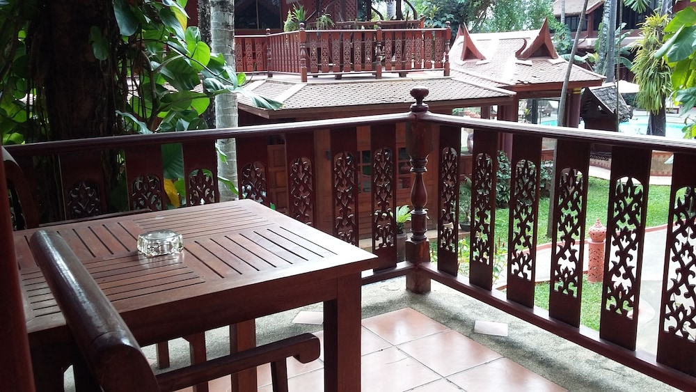 Lovely traditional thai style architecture, beautiful tropical garden nice pool good breakast and very near the Beach - but a GBP 70 Room deposit with no prior warning at booking stage - and although I was given a nice Room upgrade - really noisy aircon and a basic fridge that went noisy unless the aircon was on.... Also Rooms at the front some outside noise at night .... So still really nice - but some things they should work on ...