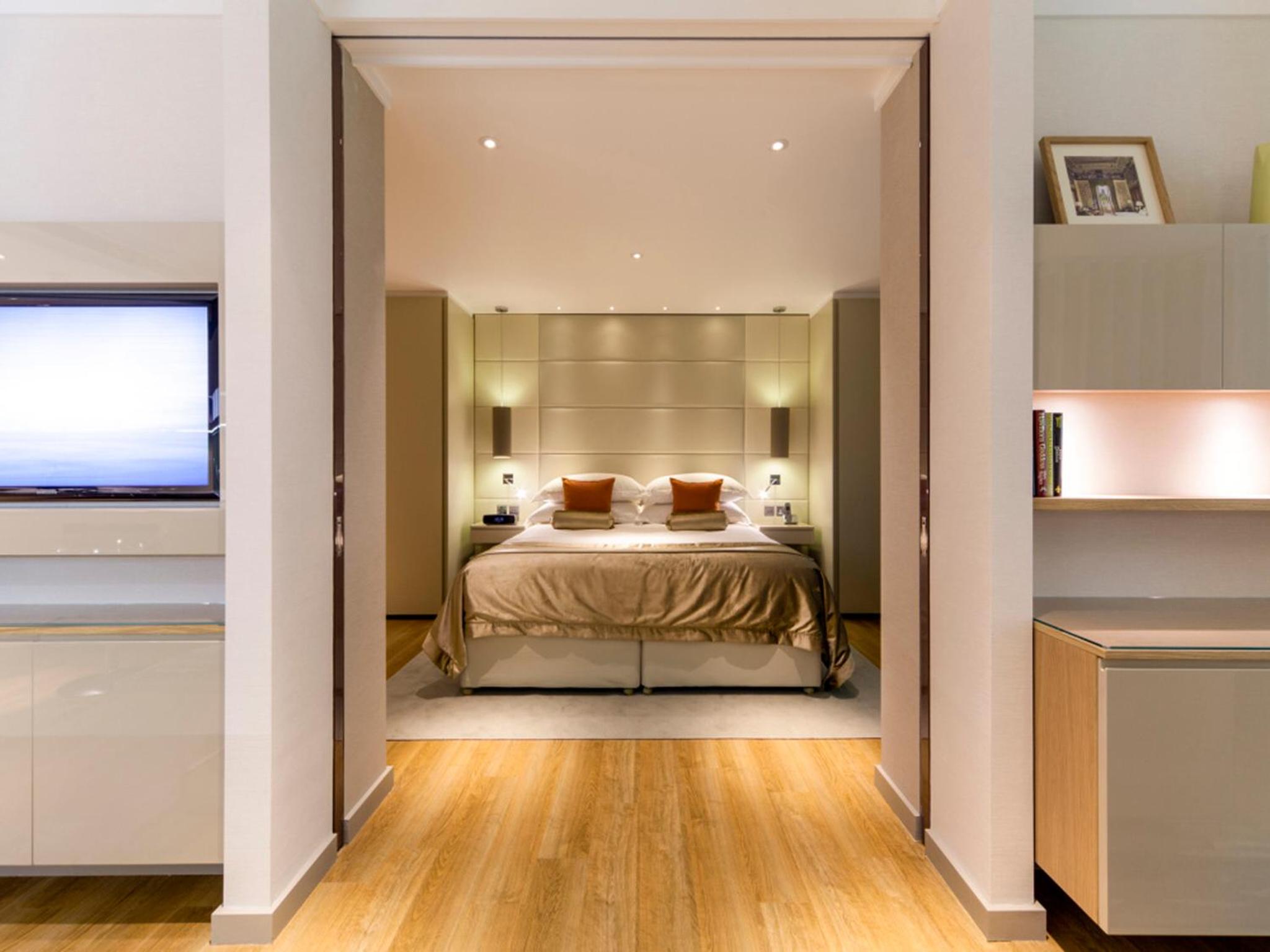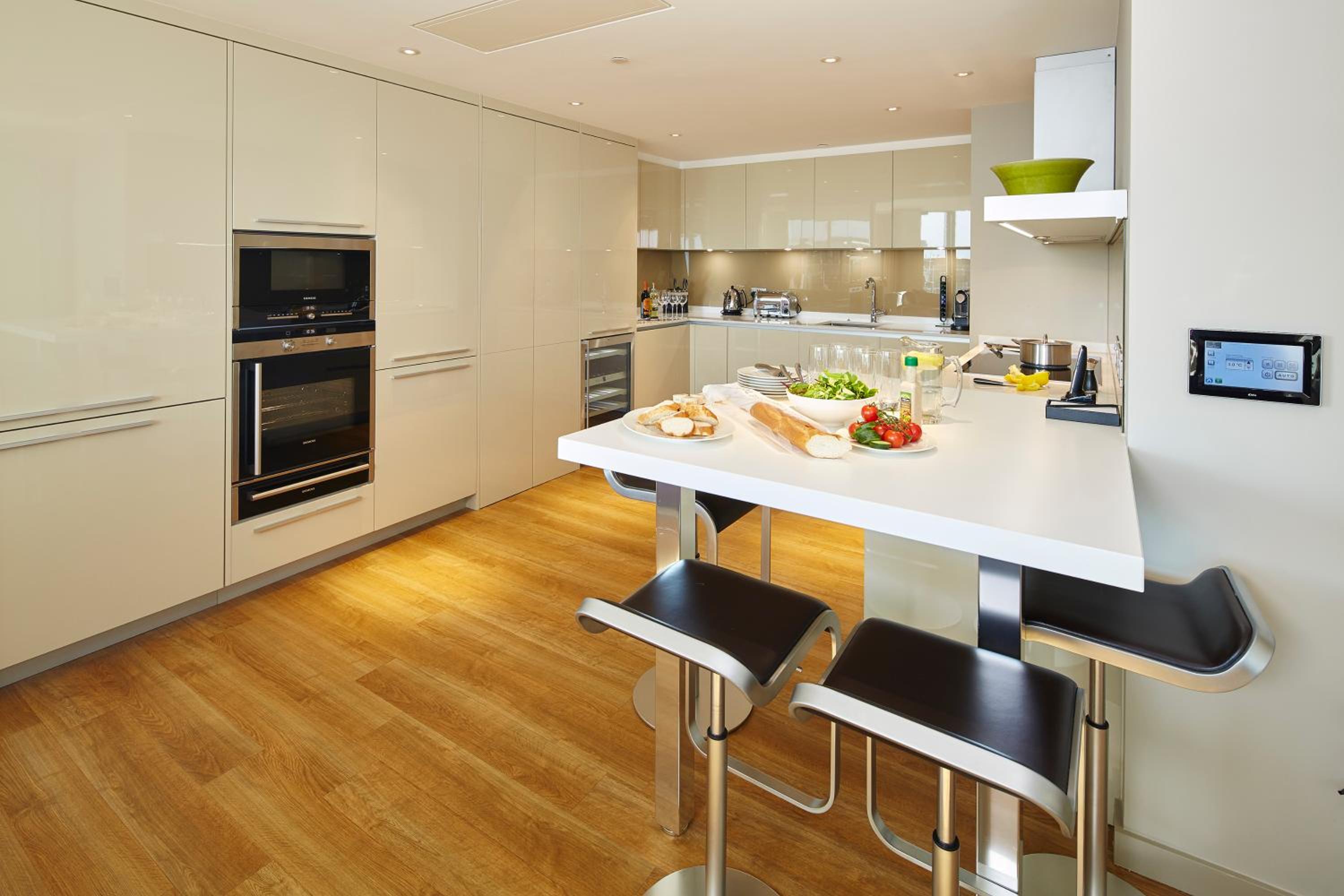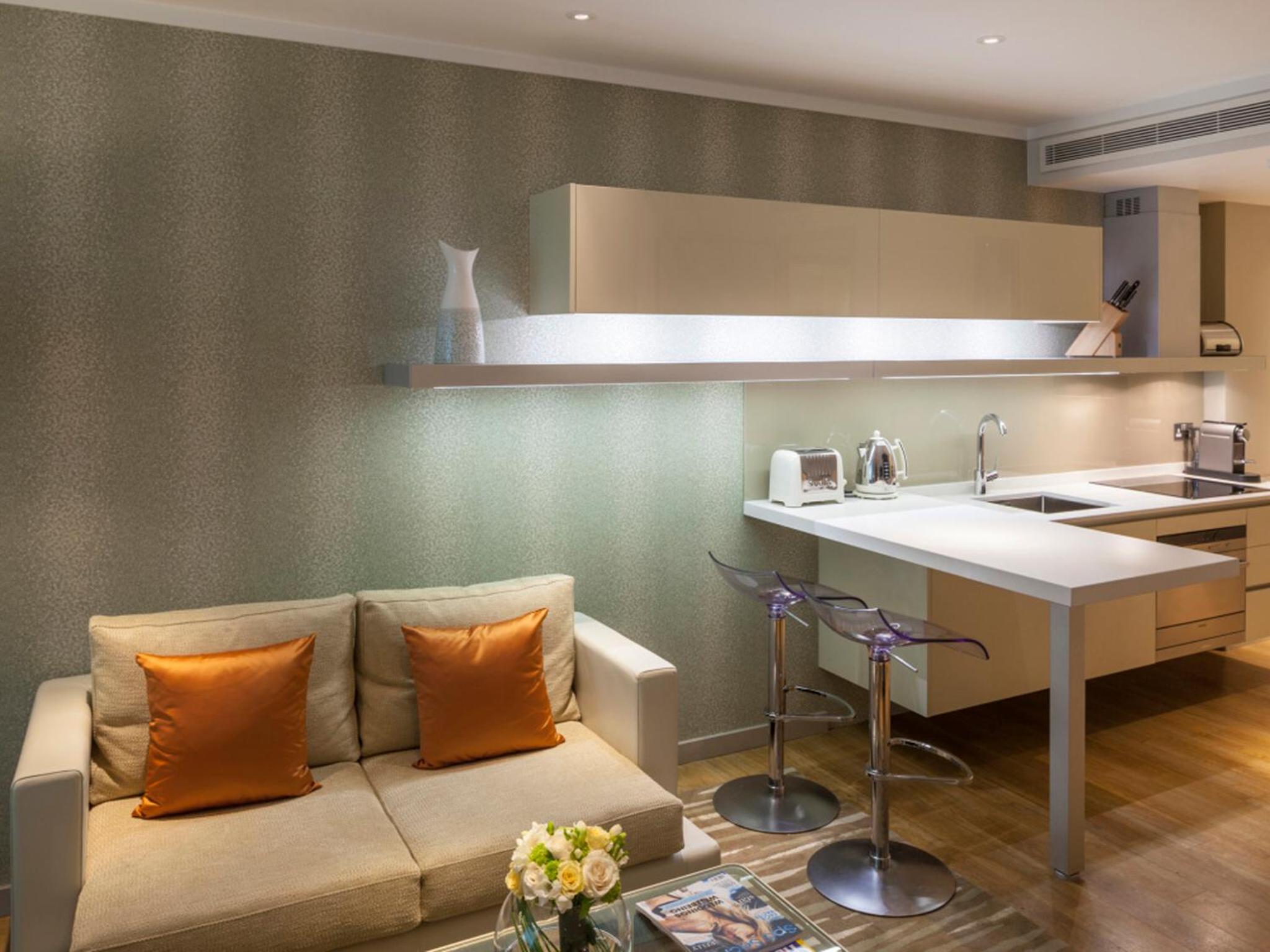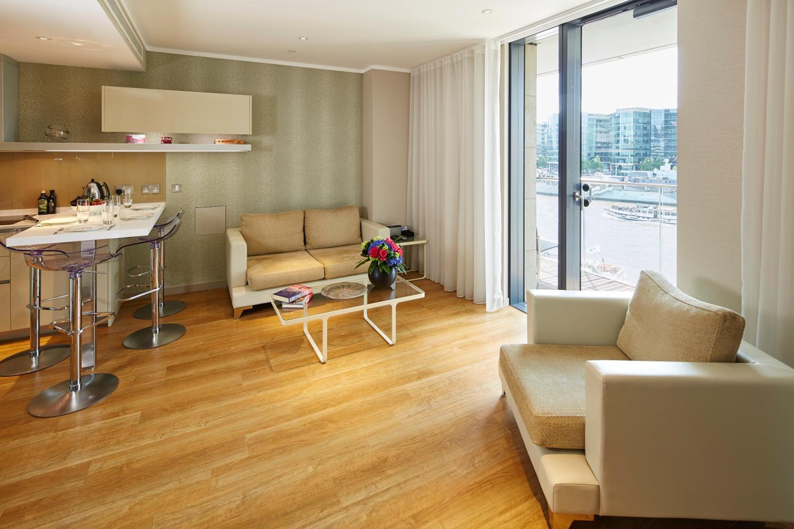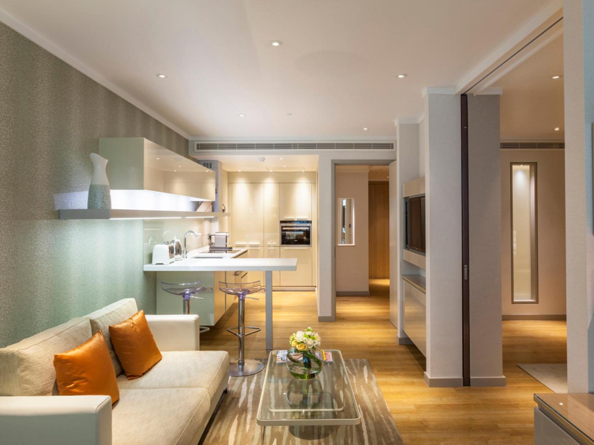 The apartments at Cheval Three Quays are designed with sleek and modern aesthetics, featuring clever lighting, shiny surfaces, and geometric shapes. Each apartment includes an open-plan kitchen & living room, a flat-screen TV, and an iPod dock. With a coffee machine, dishwasher, and microwave provided, guests can enjoy both convenience and style during their stay. Some apartments even offer breathtaking views of iconic London landmarks like Tower Bridge and City Hall.