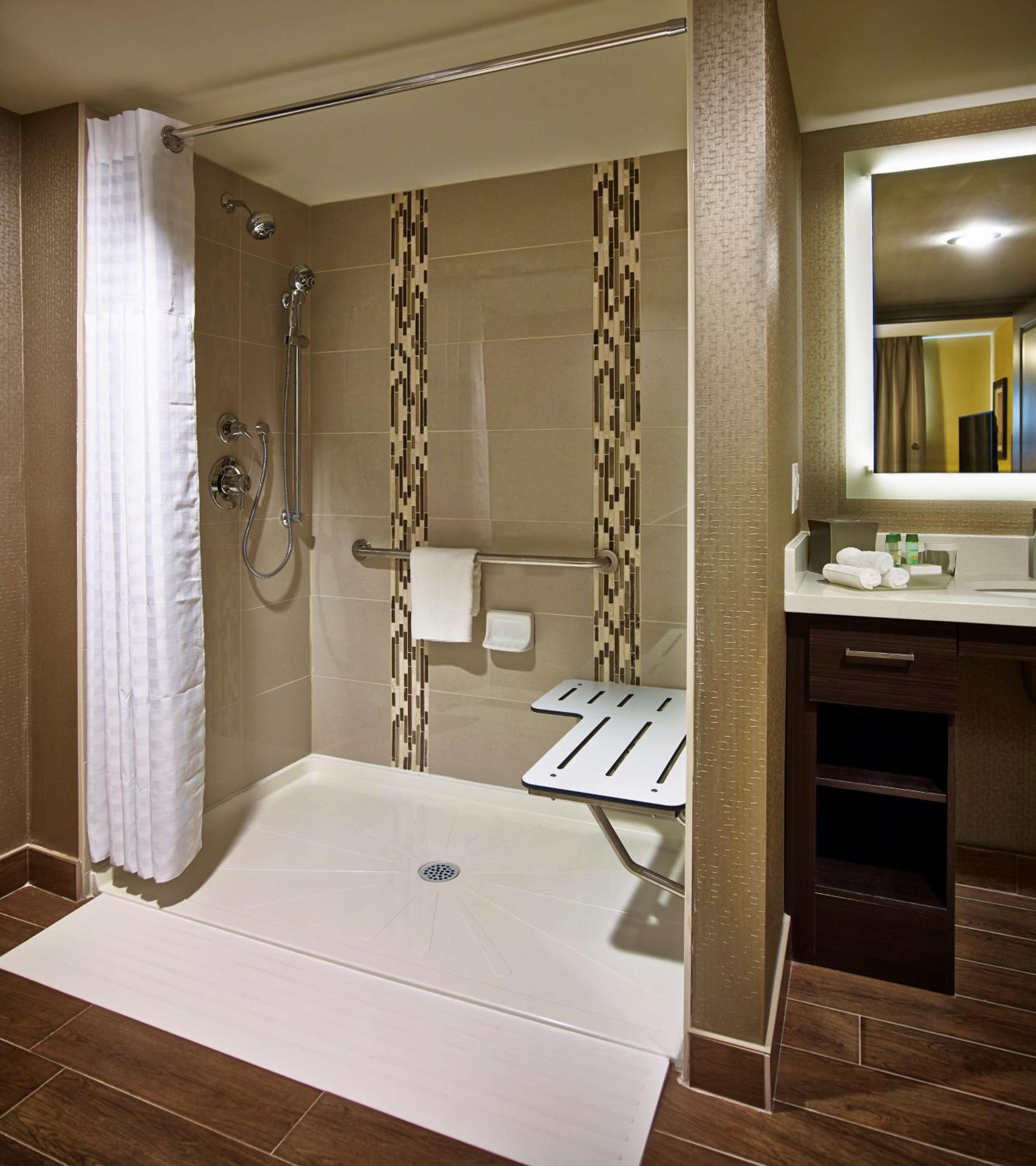 This hotel is located within walking distance of the TD Coliseum. The room is well appointed and includes a roomy shower, mid-sized kitchen with a full fridge, dishwasher, pots, dishes, etc. We loved the incredibly comfortable bed.