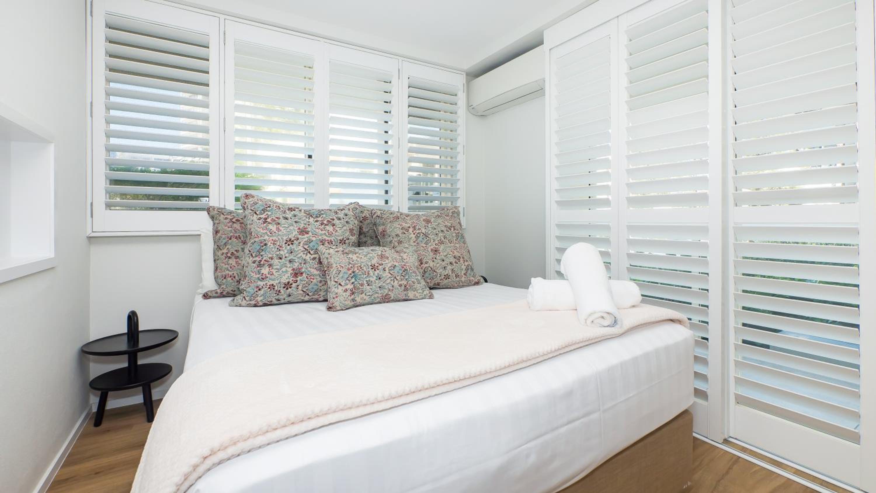 The unit was rather cheap feeling in materials. The bathrooms were dark and had no natural light or air. The bedrooms had no curtains to block out light or heat. Only fans in bedrooms despite listing A/C. There was one wall ac unit in living room only, didn't help cool the bedrooms where you sleep.