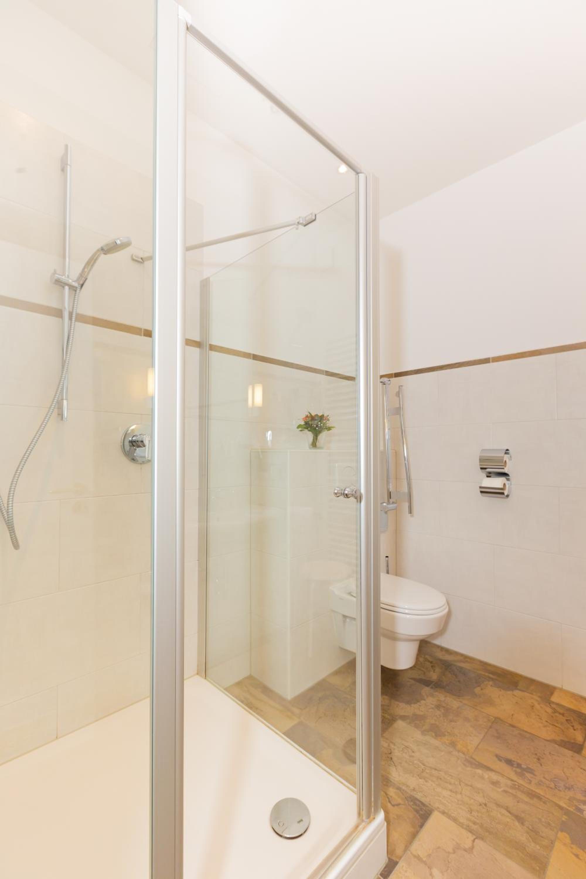 Es gibt Massageduschen. Auf Wunsch wurde die Sauna aufgeheizt.