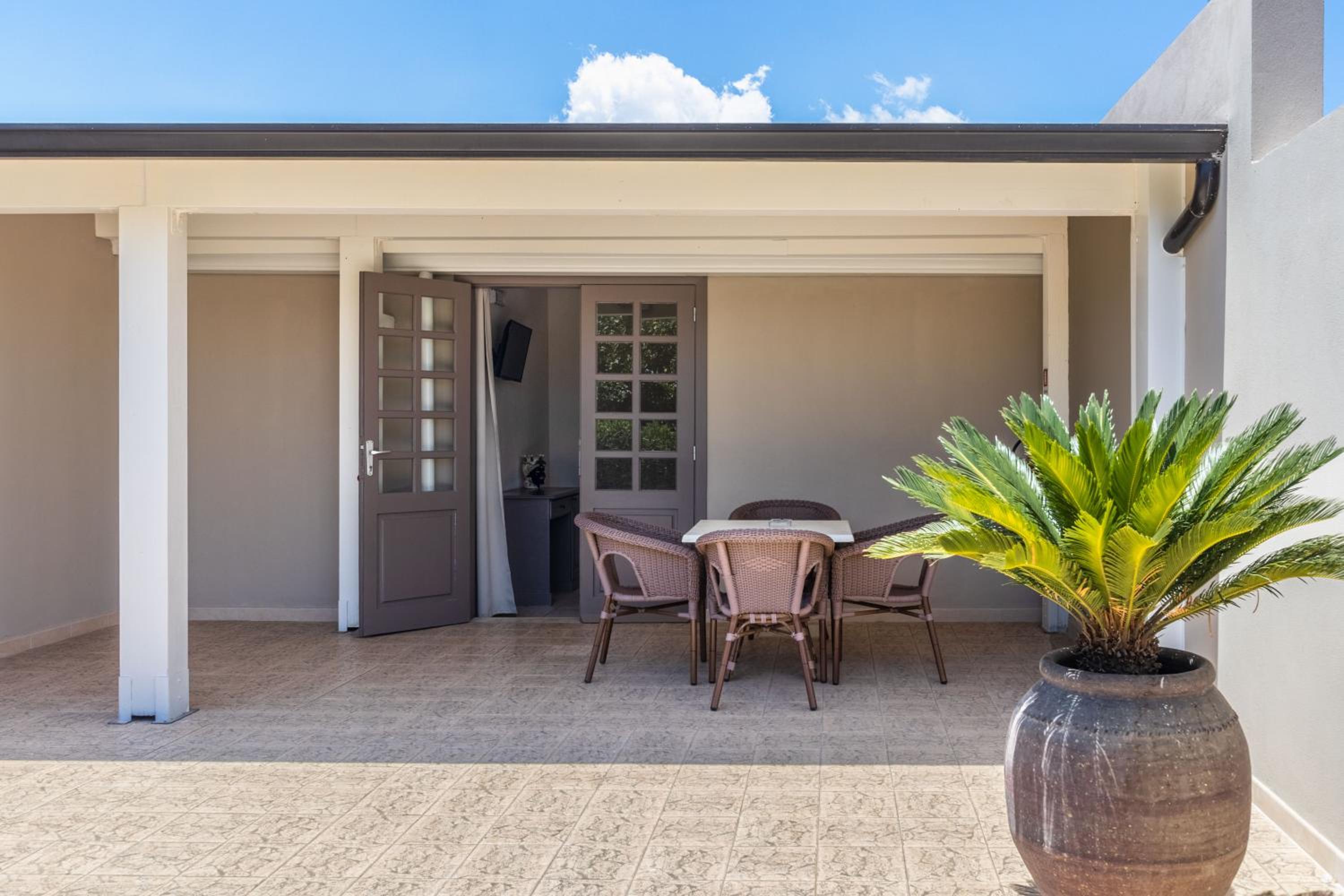 Indulge in the cozy ambiance of our rustic rooms featuring wood-panelled walls, wrought-iron beds, and picturesque views of the pool or garden.