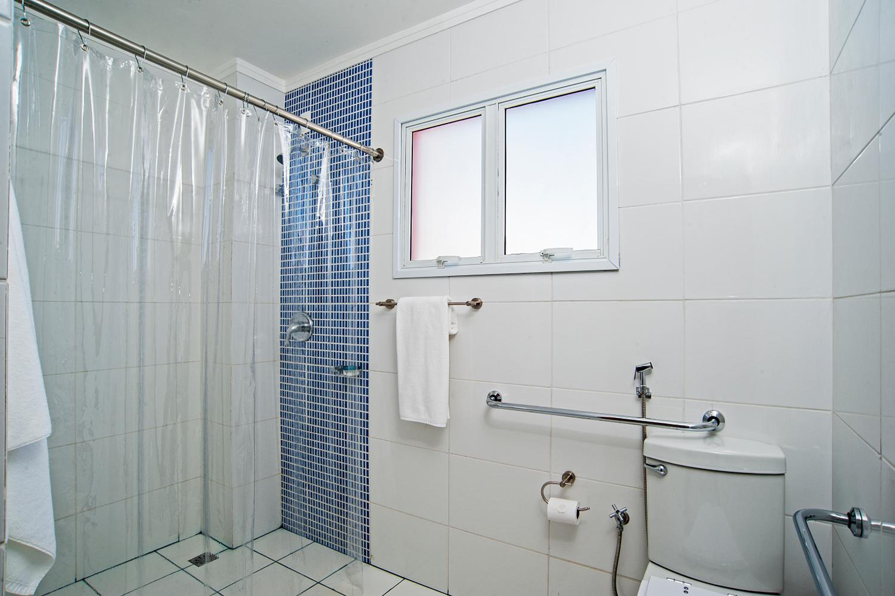 Porta do chuveiro quebrada, não fecha, banheiro apertado.