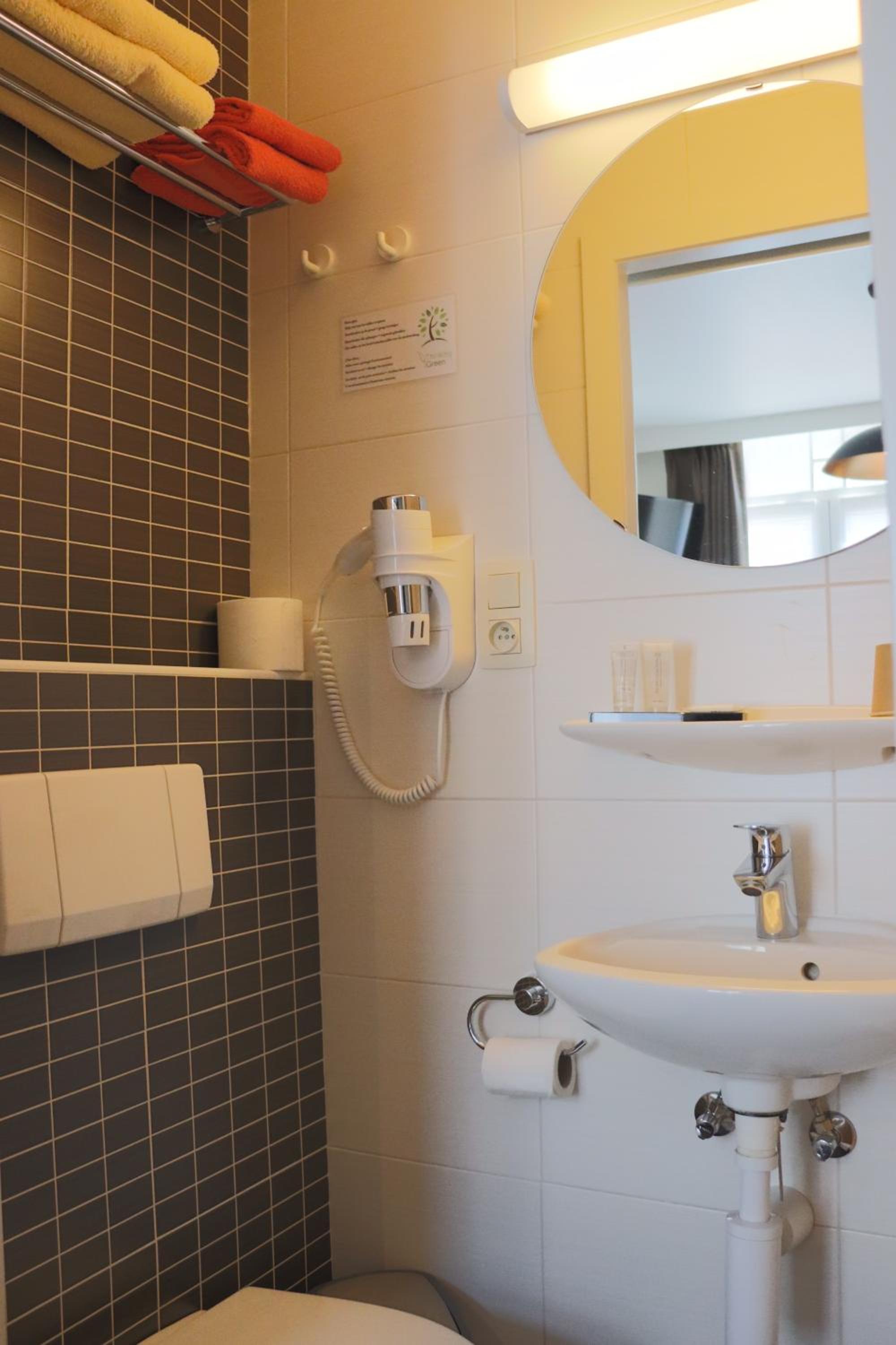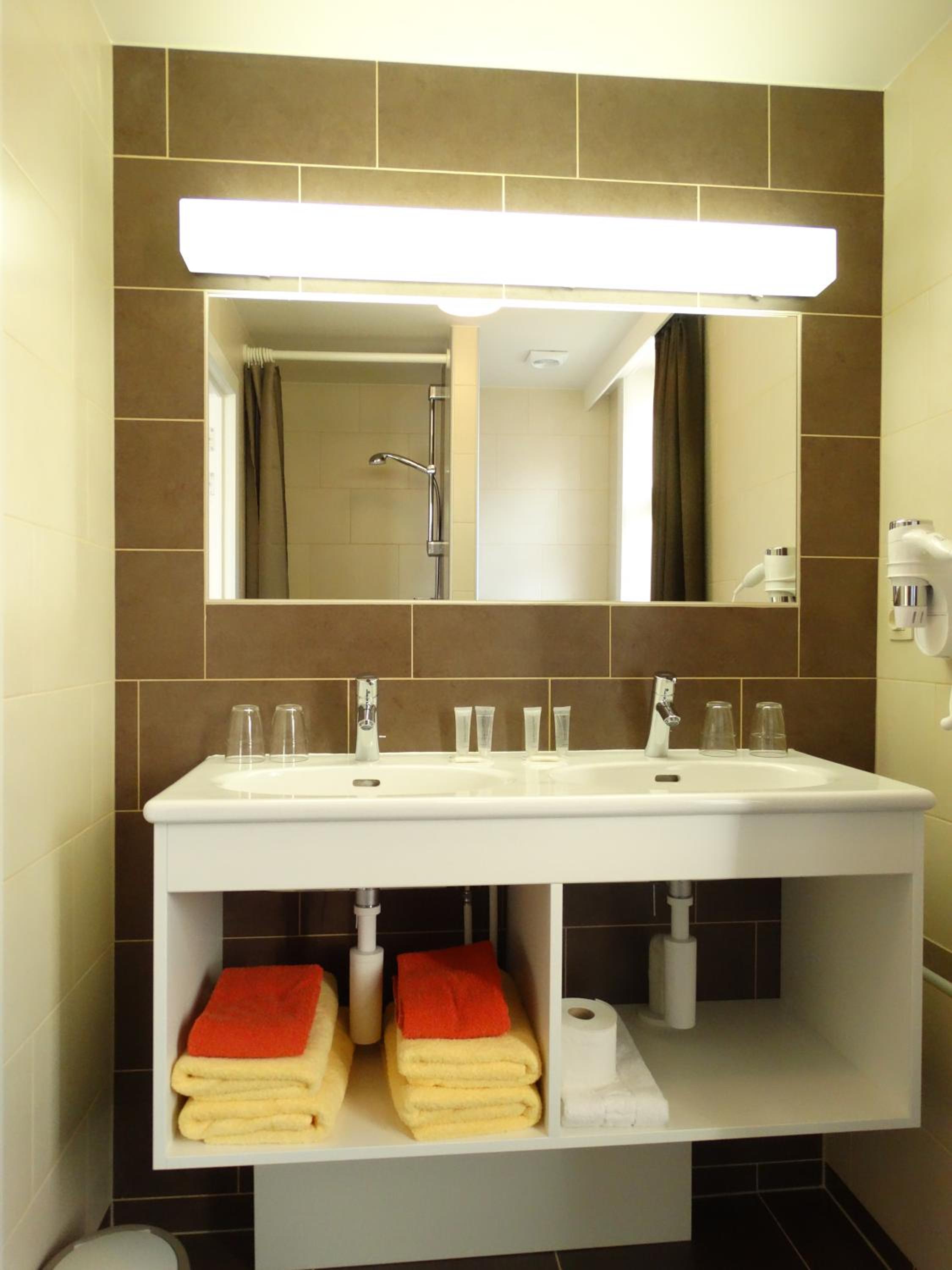 De badkamer op de kleine kamer is echt wel klein. De kamer zelf is perfect voor één persoon.
