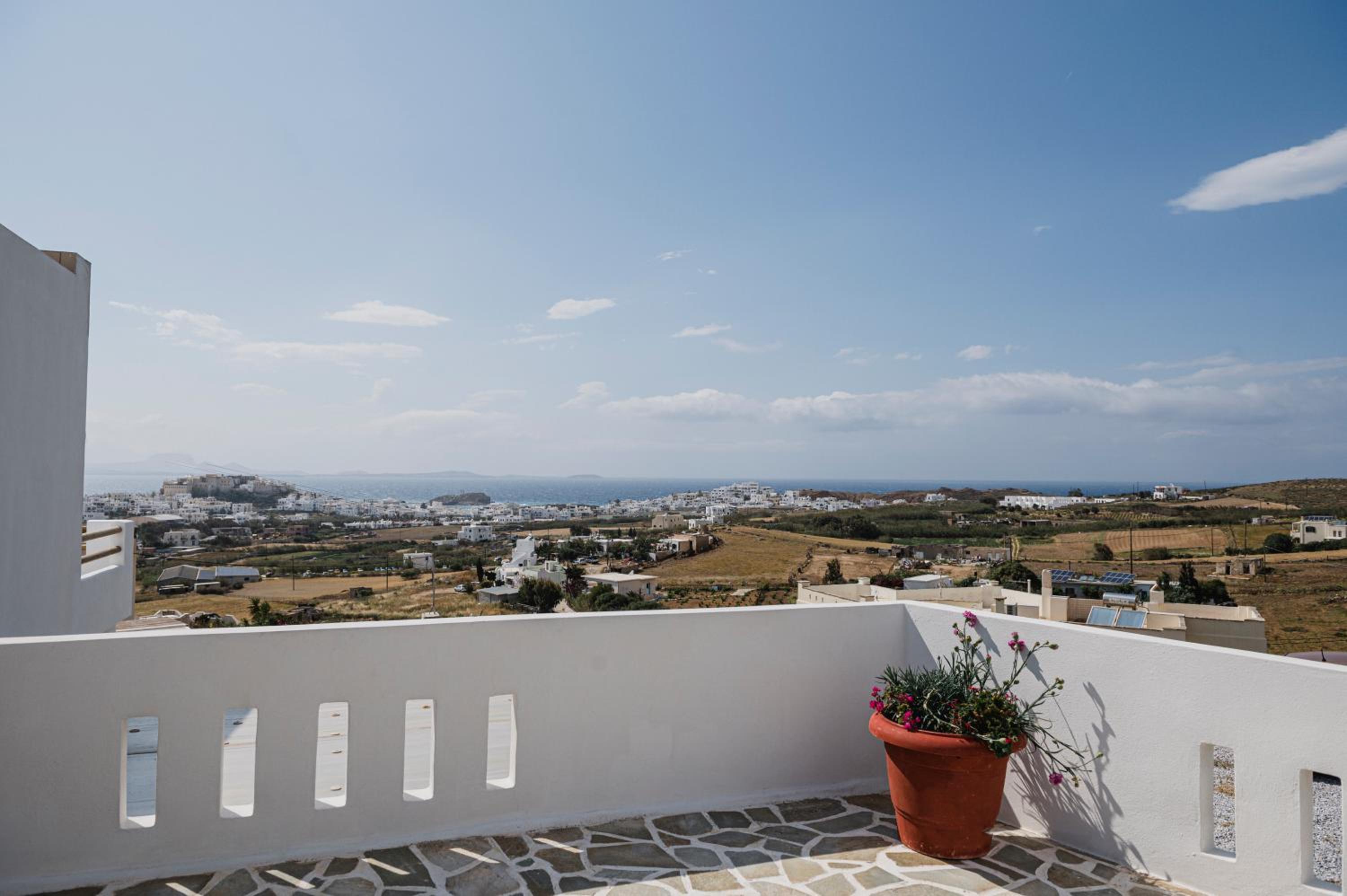 Indulge in the panoramic beauty of Naxos town and the sea from our quiet location in Agios Polycarpos. Relax on the spacious shared veranda and soak in the stunning vistas that surround you.