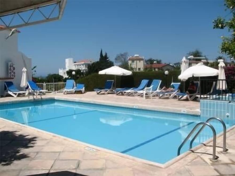 The pool area is smallish & there are plenty of sunbeds with a few more in the garden area. The pool bar wasn’t open whilst we were there but the lobby bar is open a few strides away. The food served at the hotel was very good indeed & fairly priced - I recommend the home made moussaka. Stavros, Stella & Sui provide friendly service & the bar prices are virtually the same as anywhere else in Polis. You can also put your food & drink on your room & pay at the end of your stay if preferred.