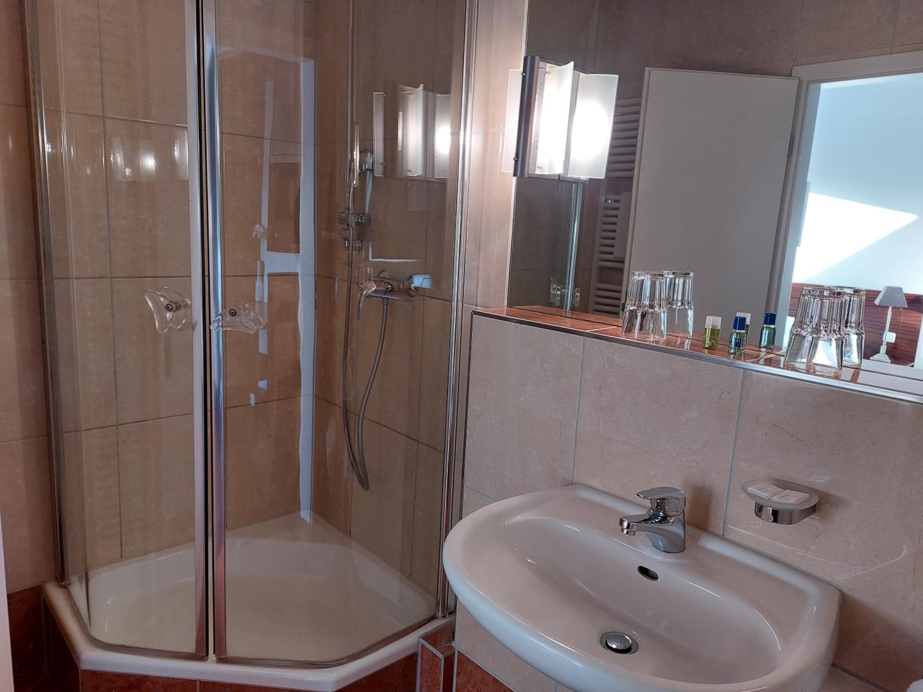 Das Bad hatte eine Badewanne wo das Duschen mittels einer aufgesetzten Wand stattfinden sollte. Dieses ist nicht zu empfehlen, da ansonsten das Wasser unter der Wand auf den Boden fließt. Der Einstieg der Wanne ist auch recht hoch. Die Temperatur des Wasser konnte nicht heiß eingestellt werden. Der Weg zum Zimmer war über mehrere Treppen erreichbar und schon recht lang. Zum Glück hatten wir nur wenig Gepäck.