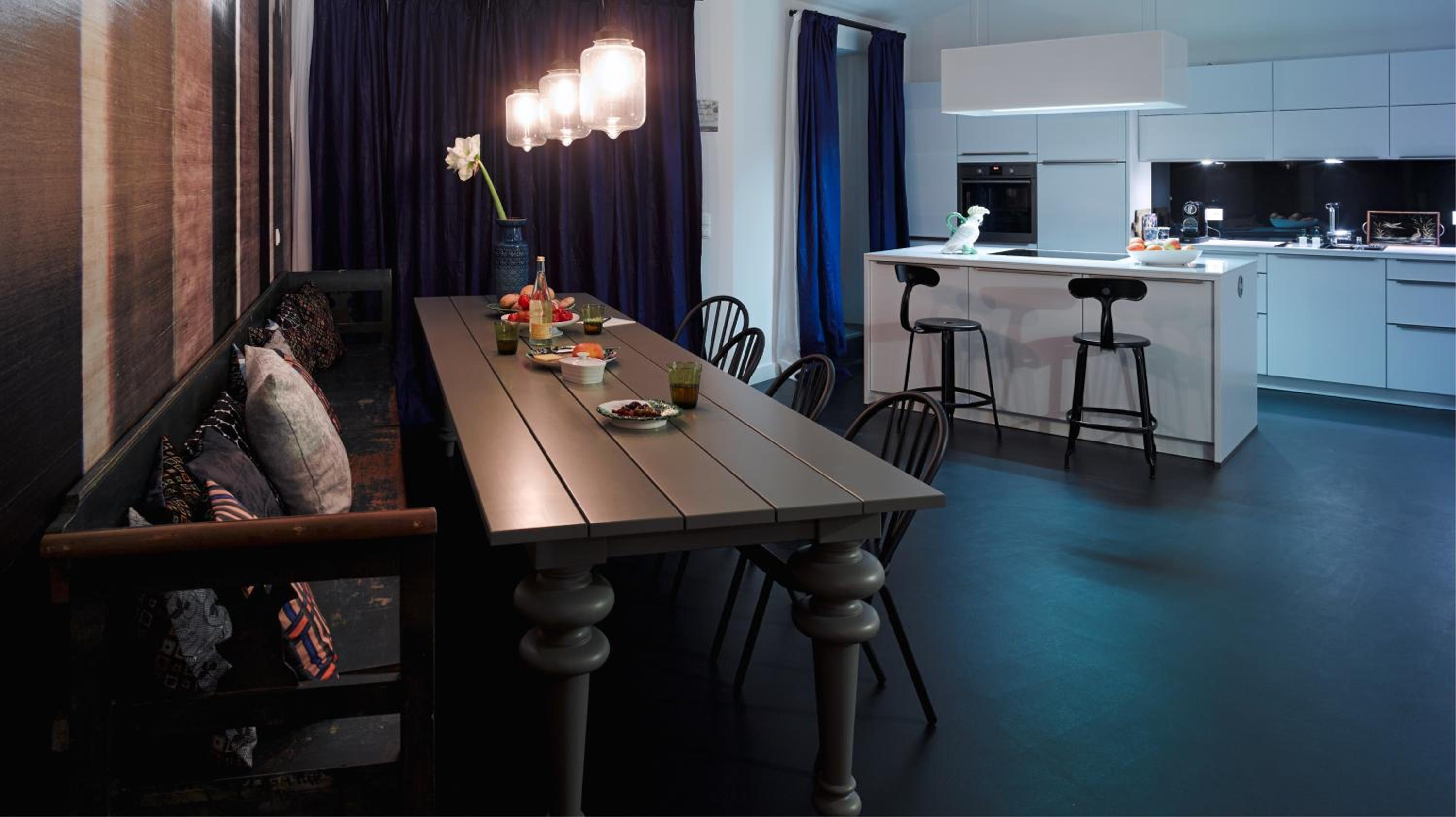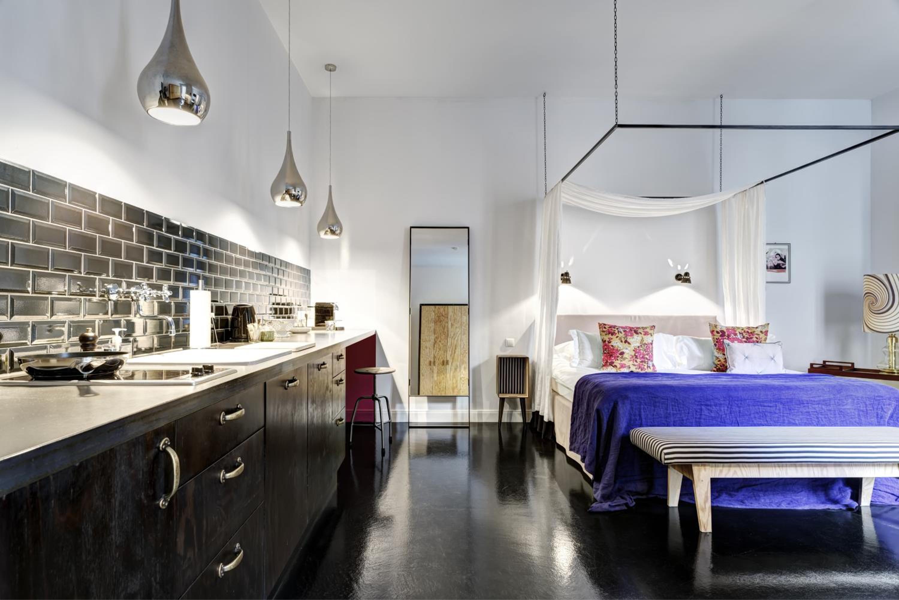 The Gorki Apartments offer a unique blend of famous design names, quirky flea-market items, and contemporary elements. Each apartment is individually furnished, providing a stylish and comfortable stay for guests.