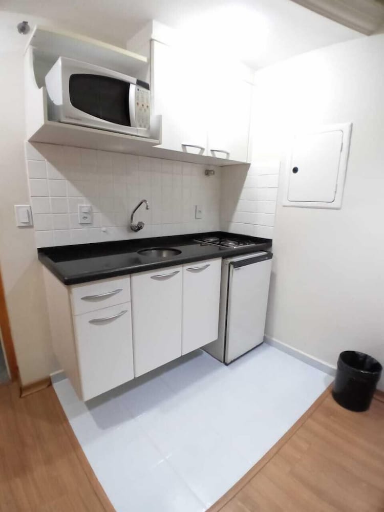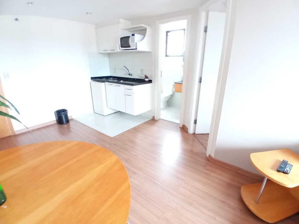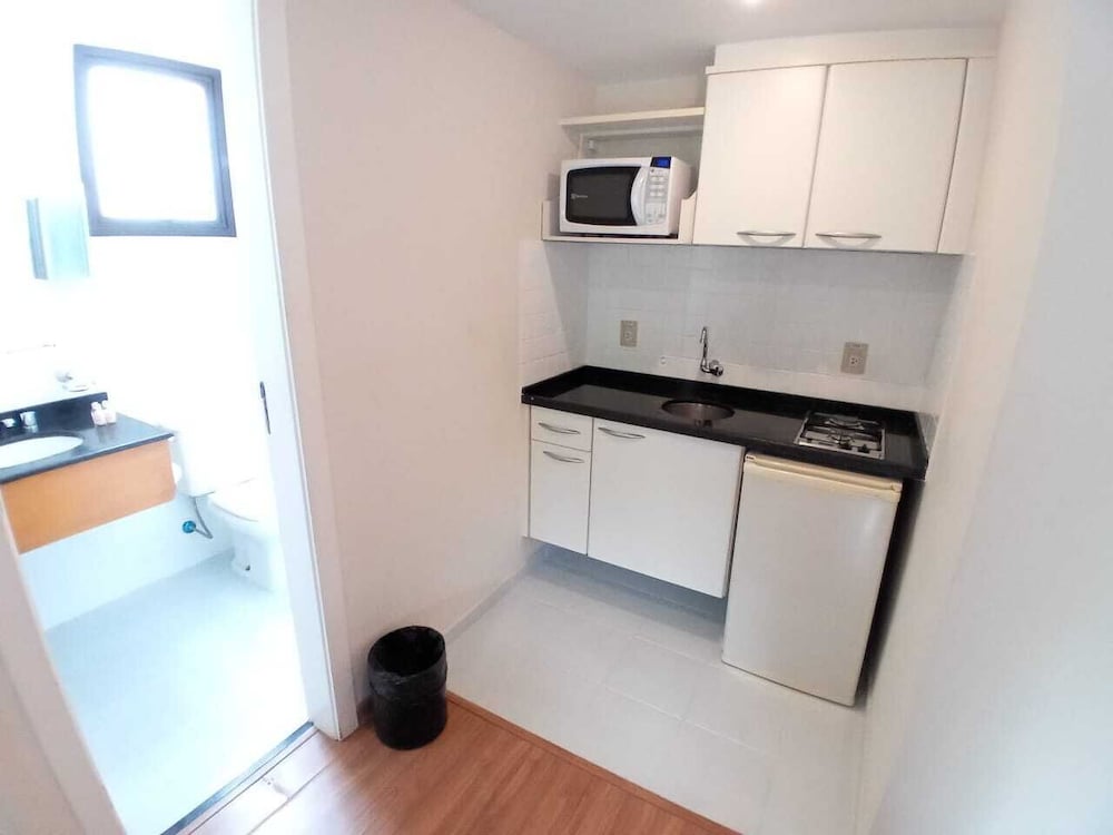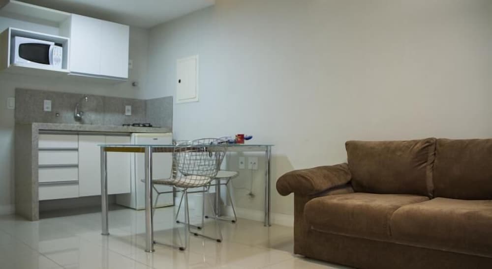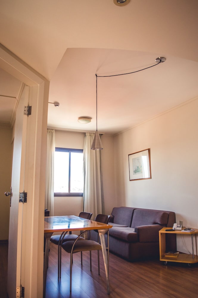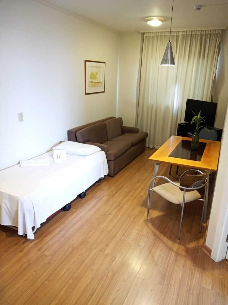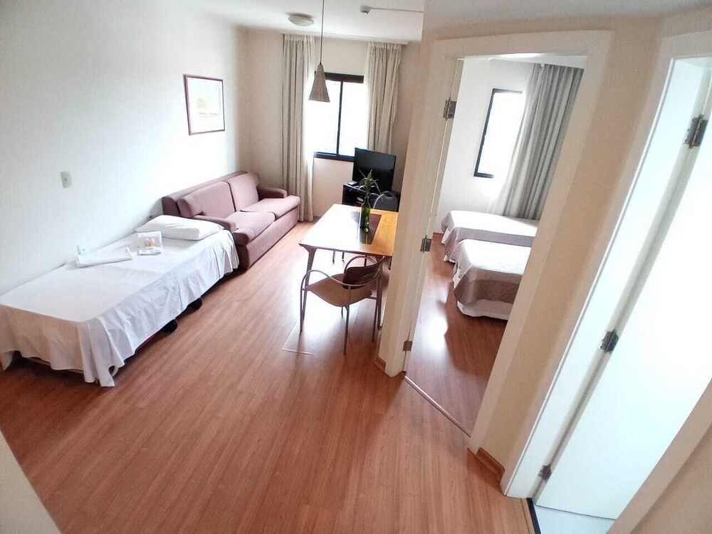Hospedagem muito boa. O apto. dispõe de sala-cozinha equipada com utensílios, inclusive um útil micro-ondas. Ducha de banho ótima. Quarto com 2 camas de solteiro boas, mas estreitas, preferia a TV na sala. Café da manhã tem o essencial e, importante, tudo bem feitinho. No geral, seria recomendável uma renovada no apto, mas a diária cobrada é justa. Funcionários da recepção, Yuri e Ian, atenciosos e prestativos. Localização privilegiada.