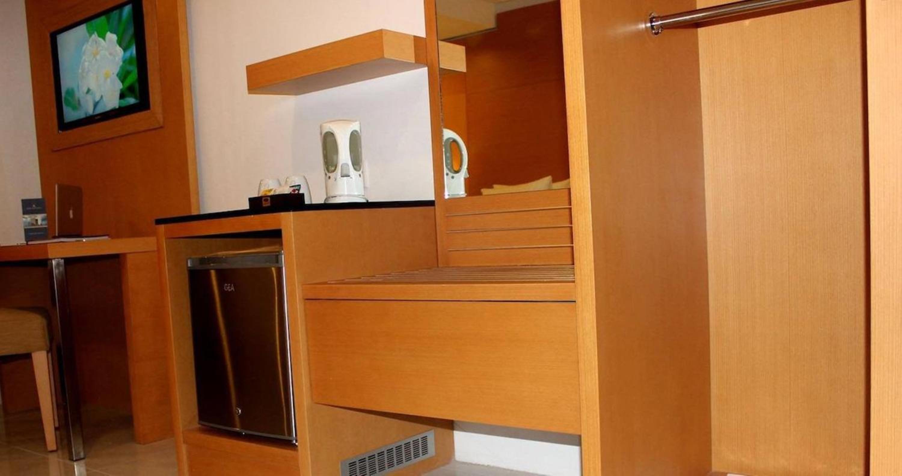 air conditioning, seating area, bathroom, free toiletries, hairdryer, shower, flat screen TV, cable channels, electric kettle, mini-bar, refrigerator