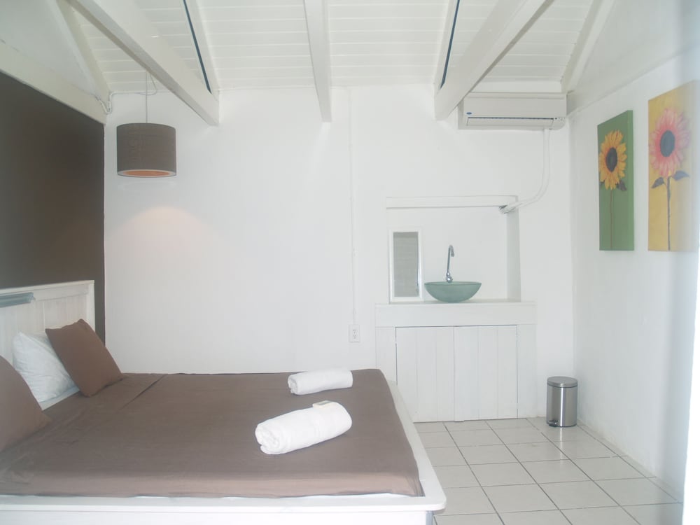We stayed for a week in January, in the large half-timbered room in the website pictures. Never turned on the AC, as there is almost always a tradewind. When the wind stops, the windmills stop and there can be a brownout. Nothing fancy about this place, but we loved it. Flowers everywhere, a delightful staff, and Jan Francke painting his watercolors. We had the pool to ourselves, but come the evening, the locals poured in, as the restaurant is reputed to be the best on the island. After our first dinner we decided this was a rare treat and we ate there every night except one. Truly superb.