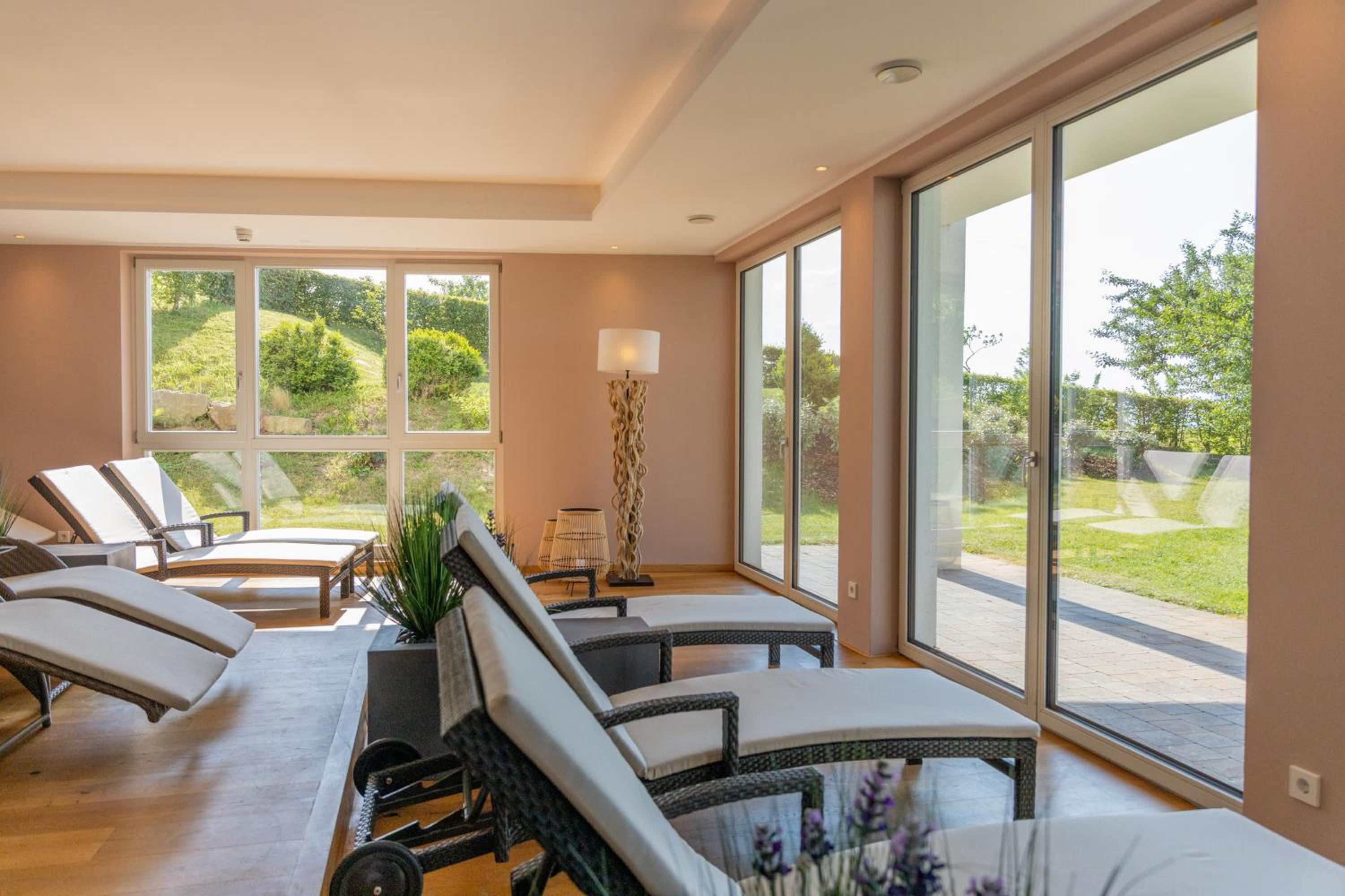 Unwind in the wellness area featuring various saunas and a steam bath, or bask in the sun on the tranquil lawn. Perfect for hikers and nature enthusiasts, this idyllic retreat also provides easy access to nearby attractions for memorable day trips.