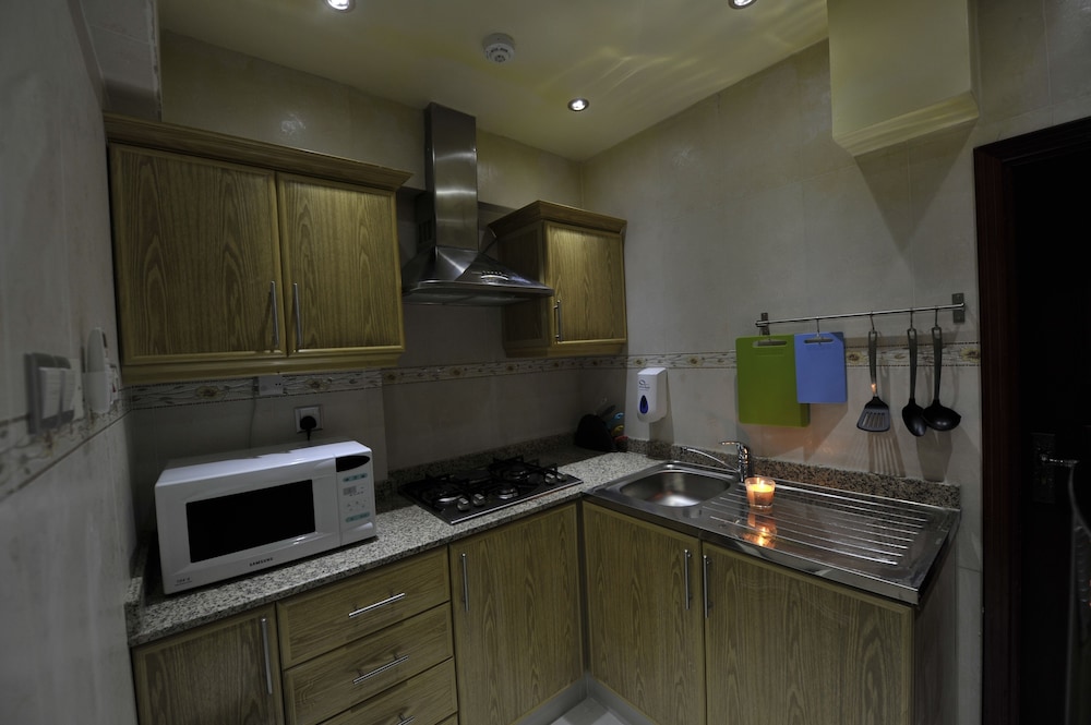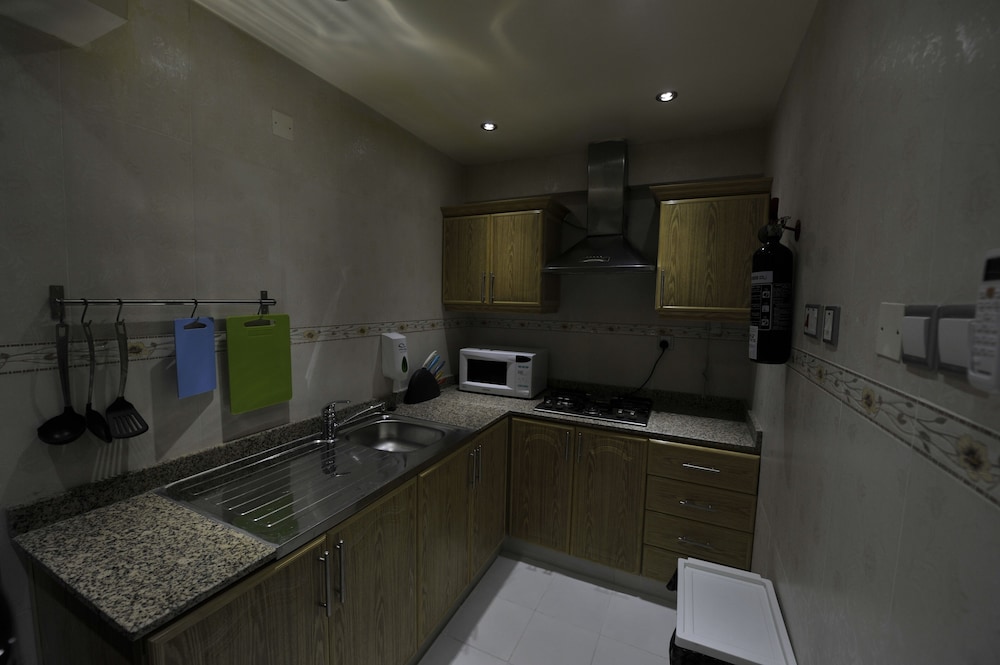 The main problem with the Oman Palm Suites is that it doesn't have an address! So it isn't picked up on maps, which means a) it takes a very long time to find it and b) taxi drivers have never heard of it. The accommodation was clean, but very tired (broken patched up bathroom door, lamps with no bulbs, sockets that don't work). But it's relatively cheap for the area. No idea what the picture in the listing is.
