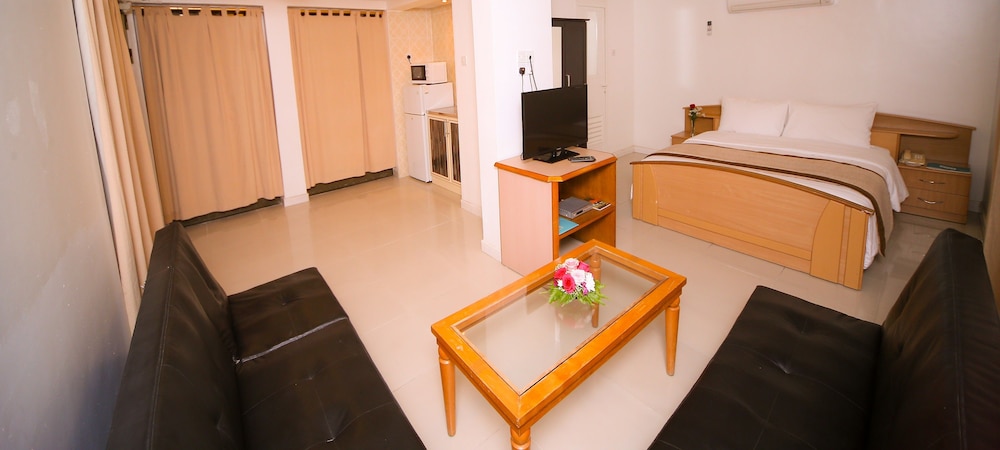 We love spending time at Sandy Beach Hotel. We recommend the apartment rooms, nice half fridge, hot kettle, plates, glasses and a sink. Plenty of closet space, great balcony and sitting area. Close to beach.