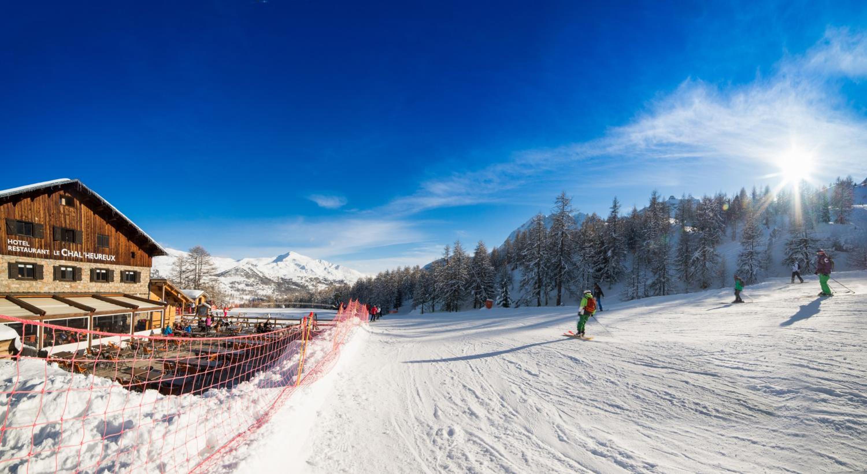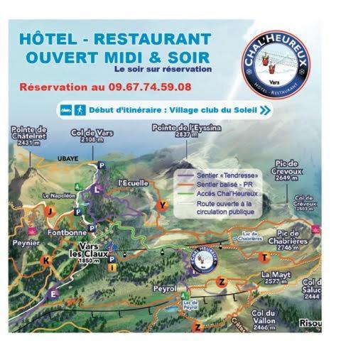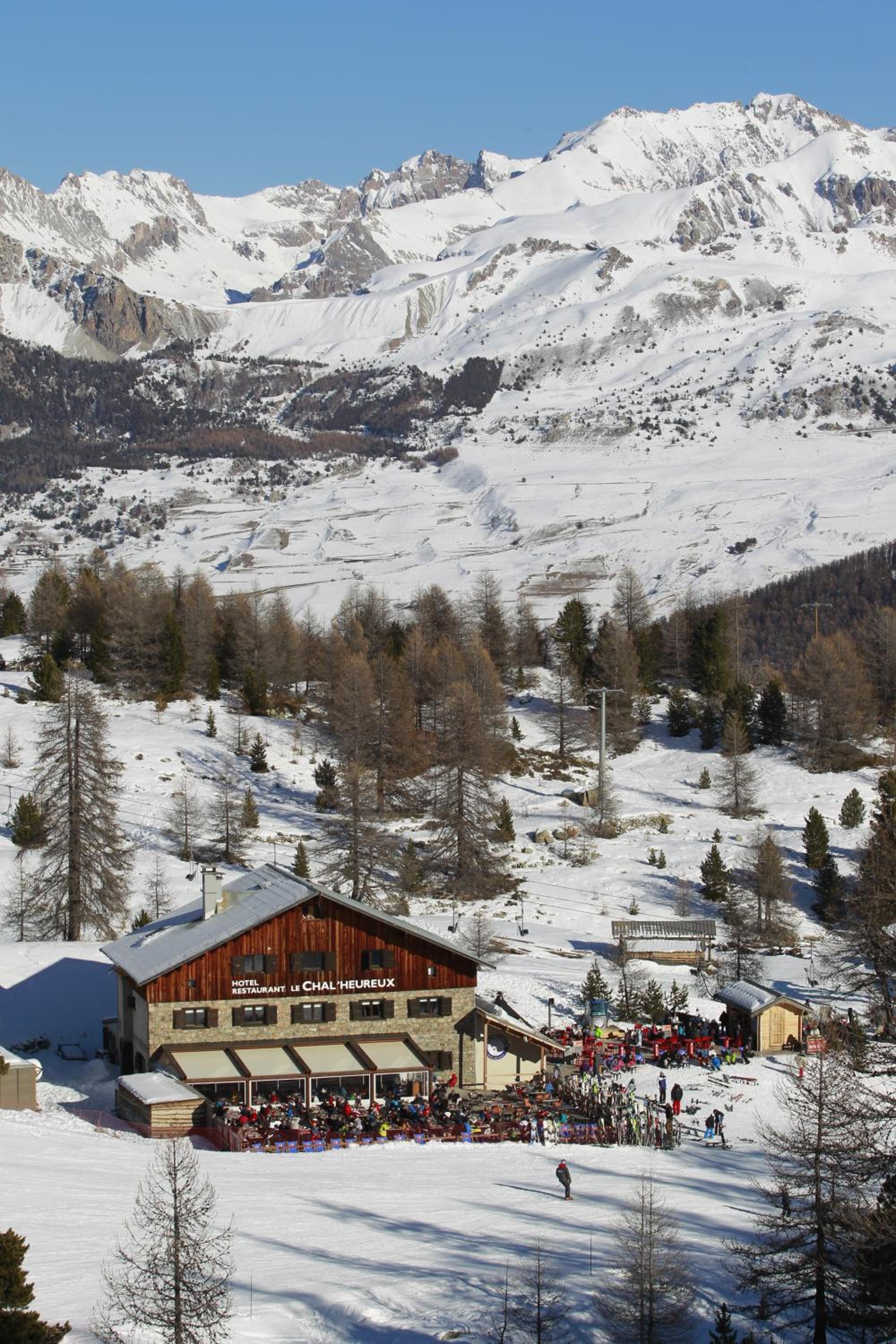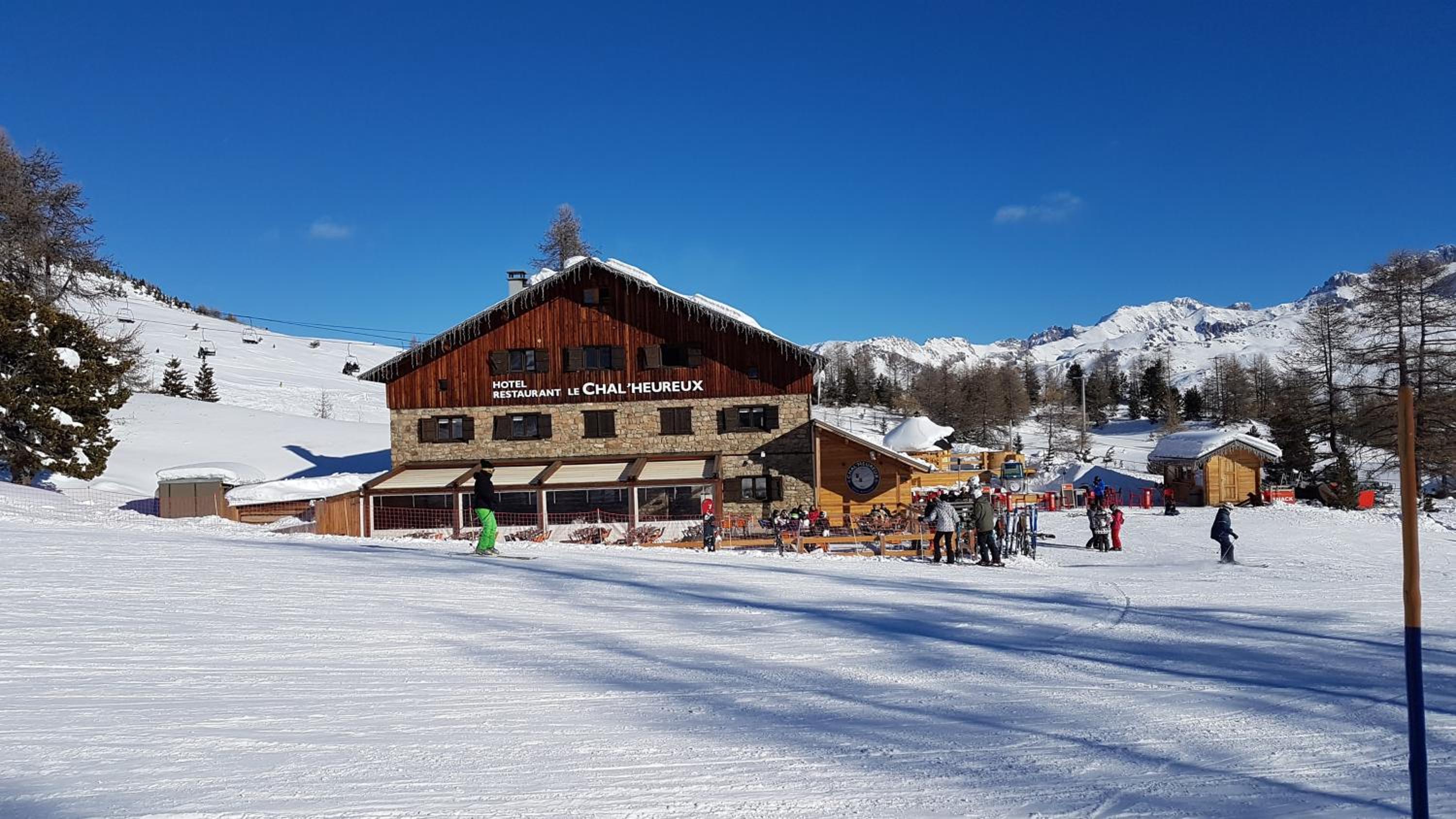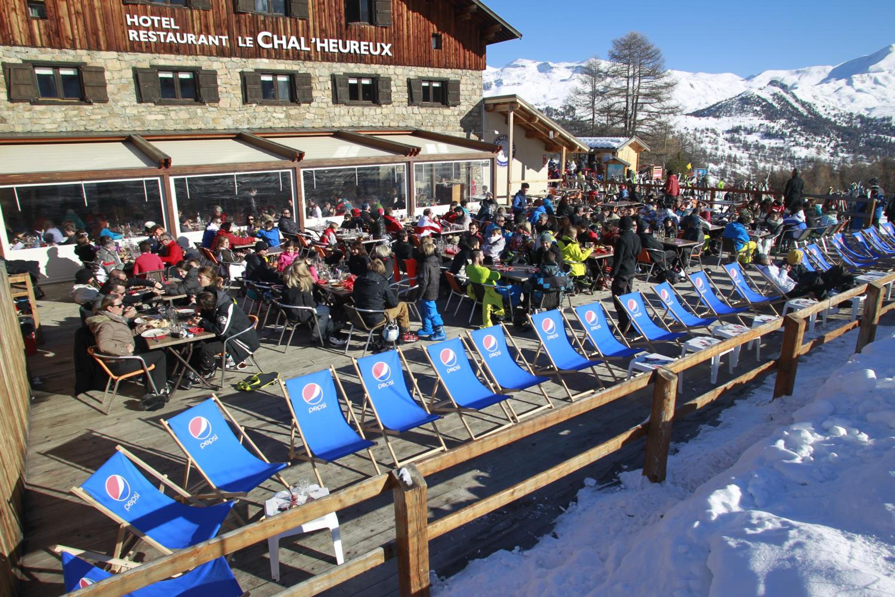 Hotel restaurant le Chal'heureux, nestled in Vars ski resort domain at 2100 metres, provides convenient ski-to-door access. The heated terrace and panoramic mountain views from the restaurant offer a picturesque dining experience.