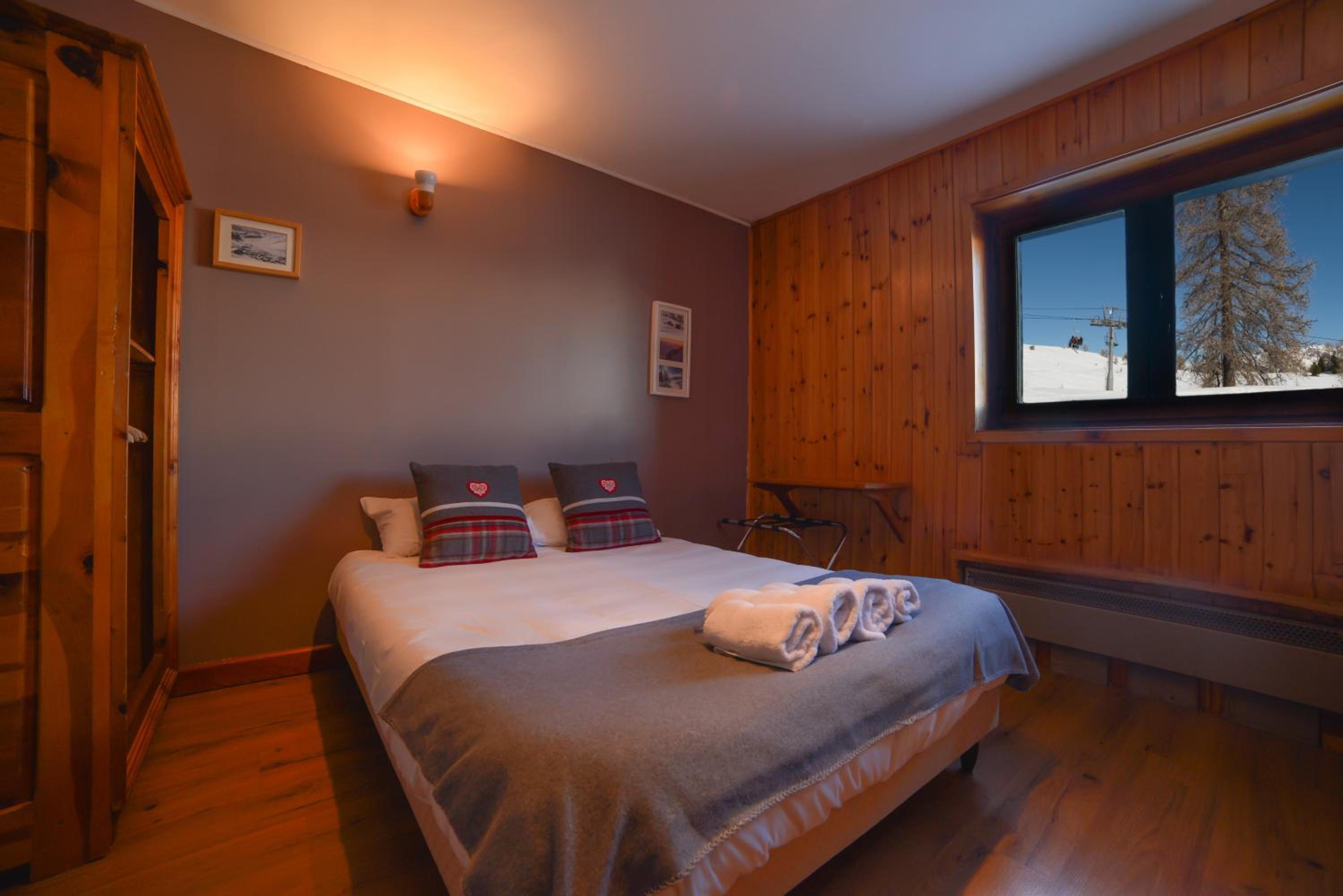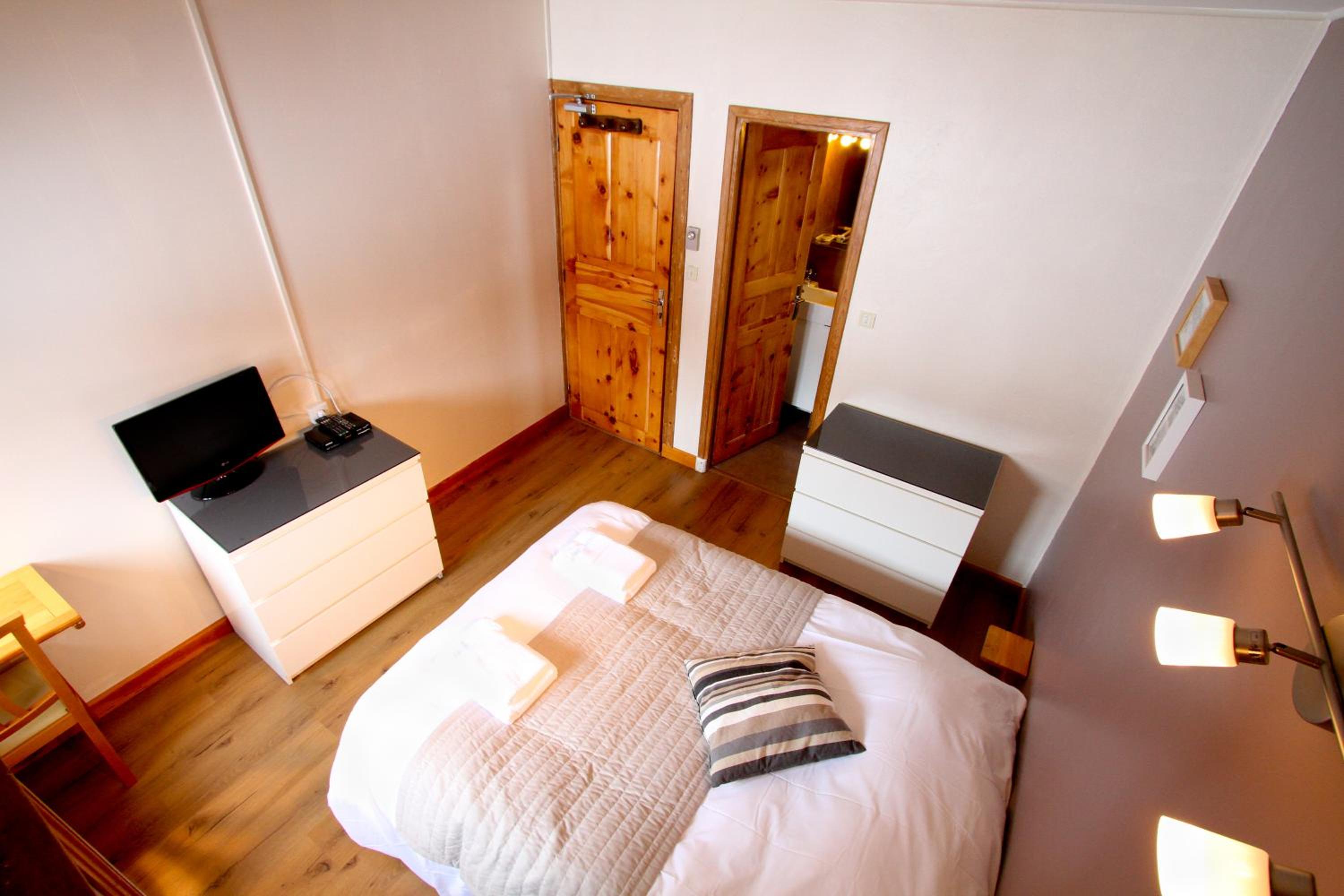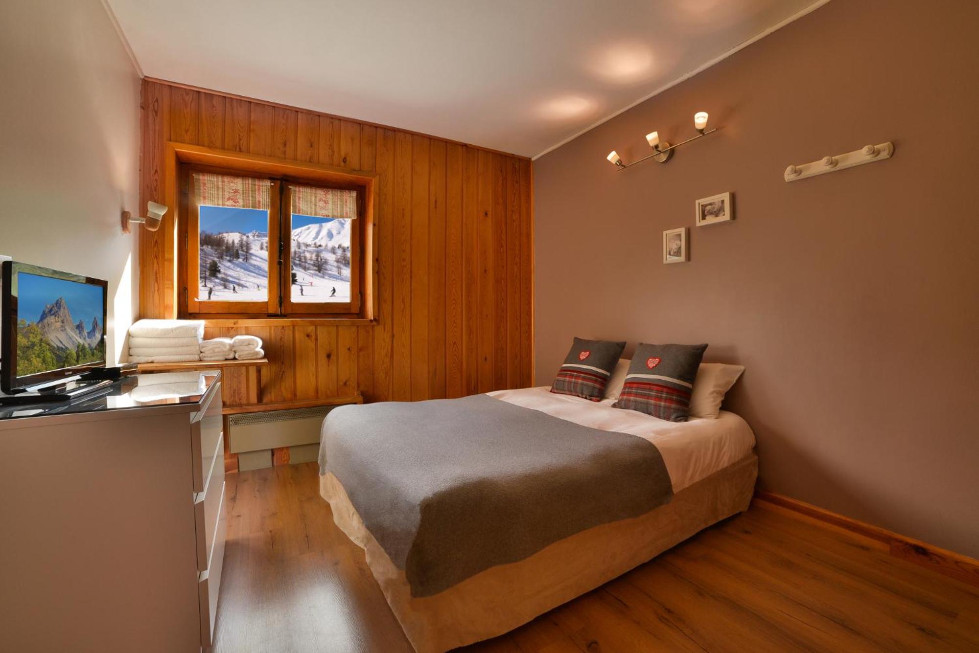Experience a modern and cozy stay in the wooden-furnished rooms at Chal'heureux. Each room is equipped with amenities like a flat screen TV, free Wi-Fi, and a private bathroom, ensuring a comfortable retreat after a day of skiing.