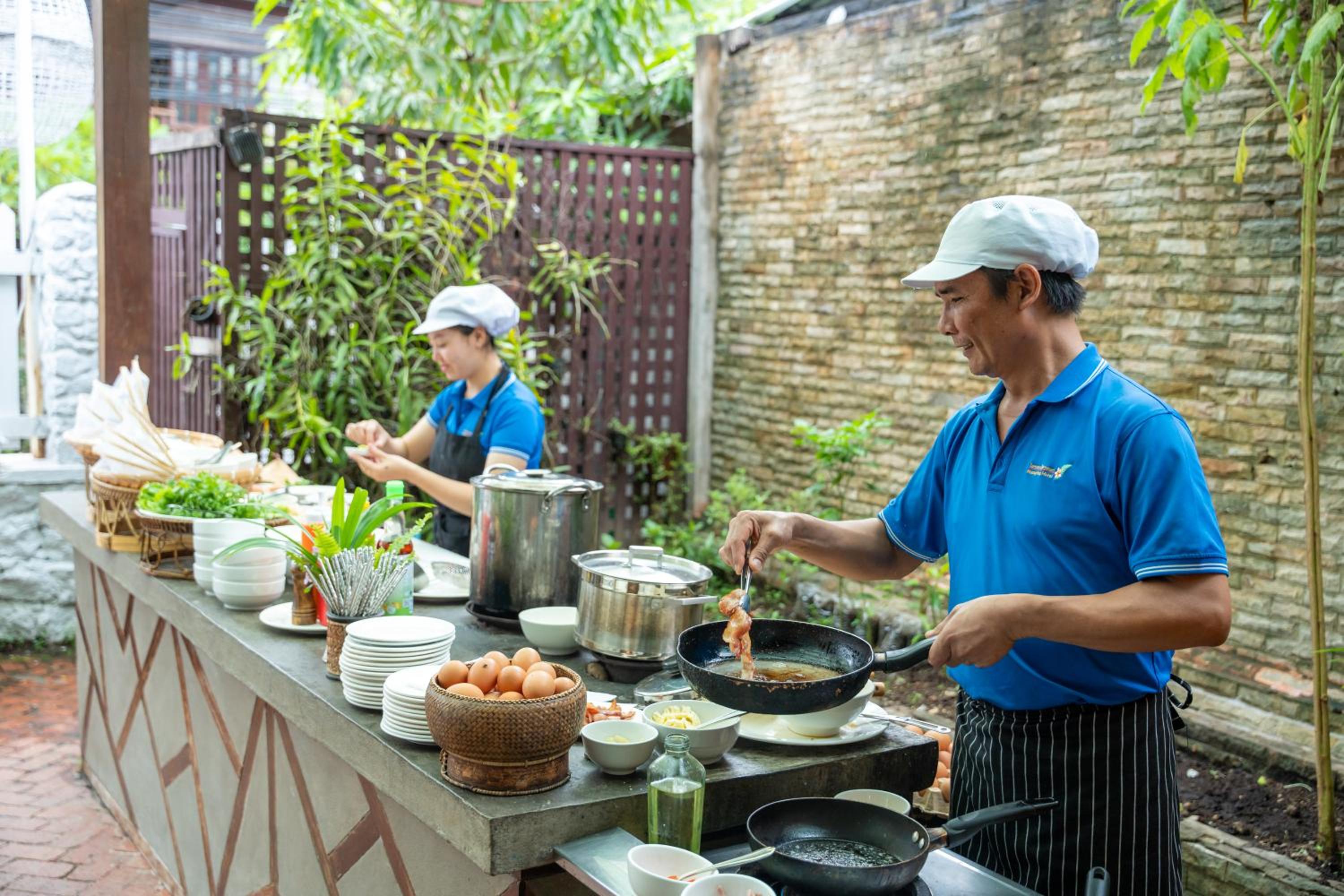 Experience the vibrant culture of Laos in the colourfully decorated rooms featuring traditional fabrics and modern amenities like a balcony, DVD player, and flat-screen TV. Enjoy picturesque courtyard or pool views during your stay.
