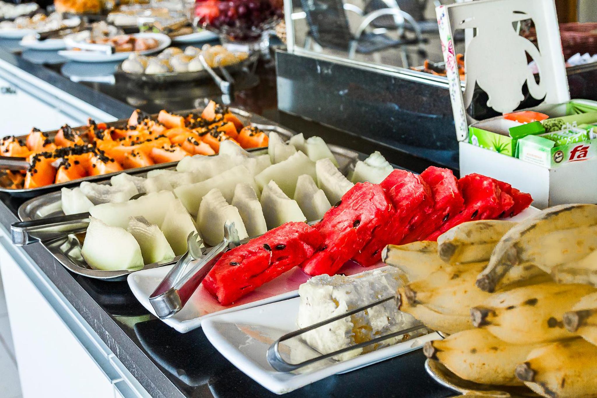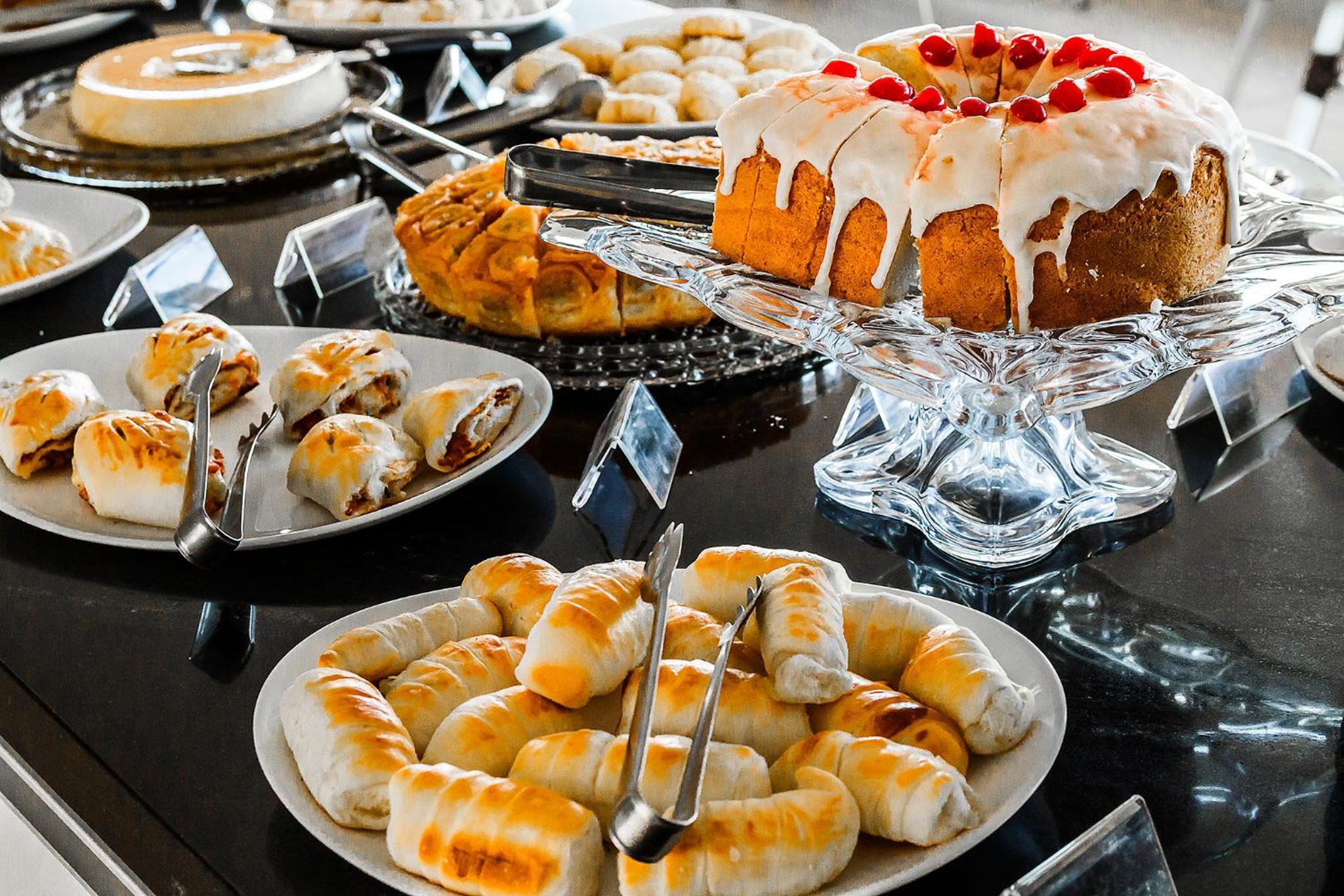 O café da manhã estava bom pela variedades, gostei disso.