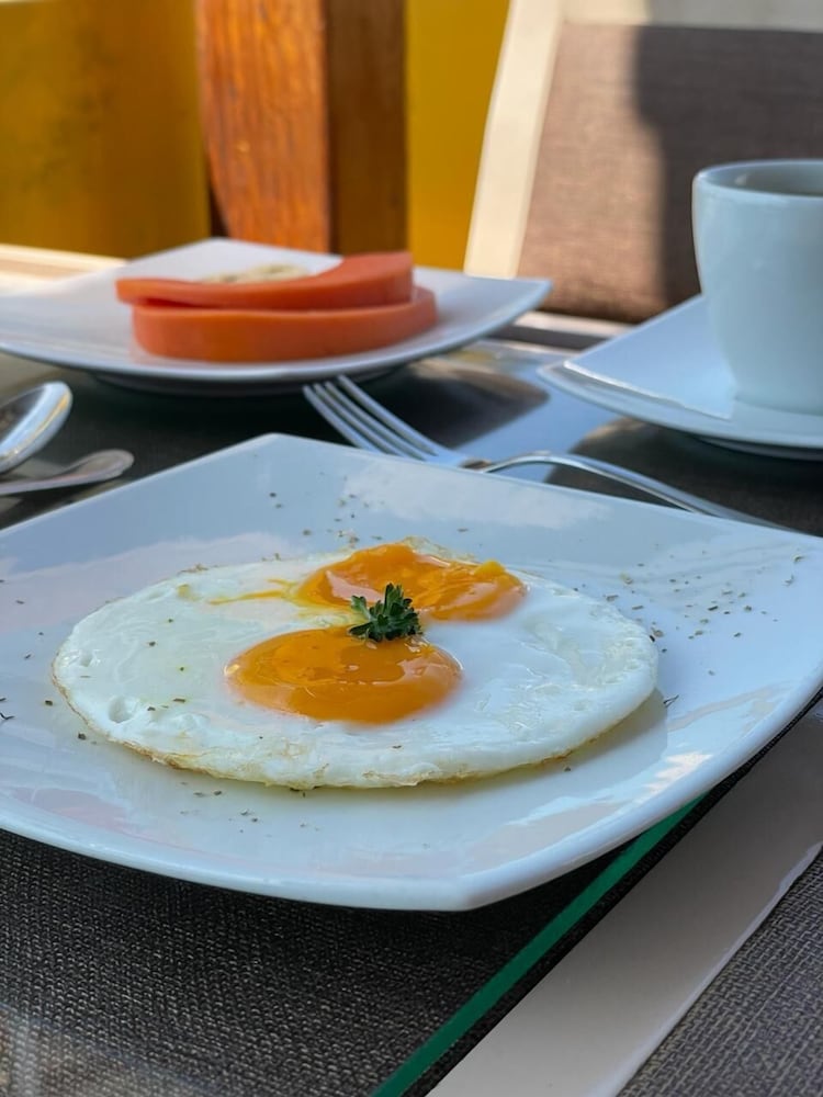 O café da manhã, rozoável. Mas como estava em dieta, tinha fruta, café, e sempre faziam um omelete maravilhoso.