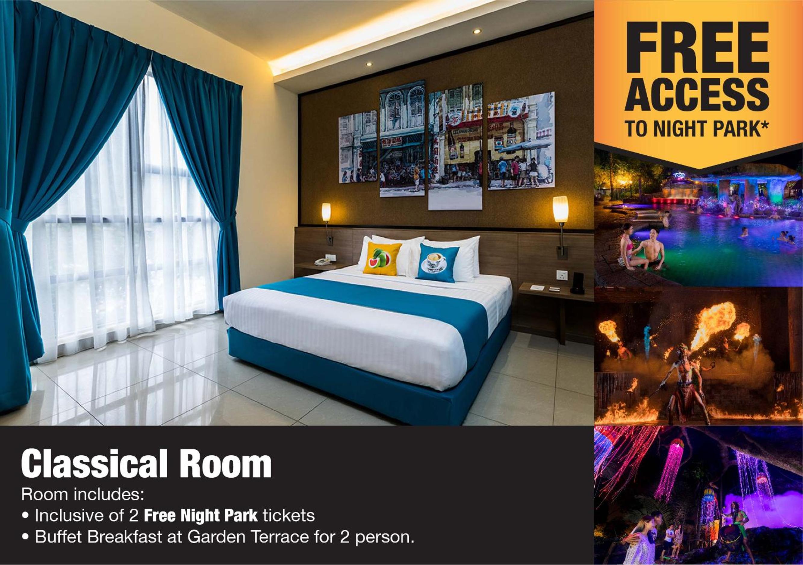From 1st January 2023, a tourist tax of RM 10 per room per night is applied to all foreign guests. This tax is not included in the room rate and must be paid upon check-in. Guests with a valid Malaysian Identity Card or valid permanent residents MY PR Card are exempted. Please note that the theme park is closed on Tuesdays, with the exception of local public holidays and local school holidays.
