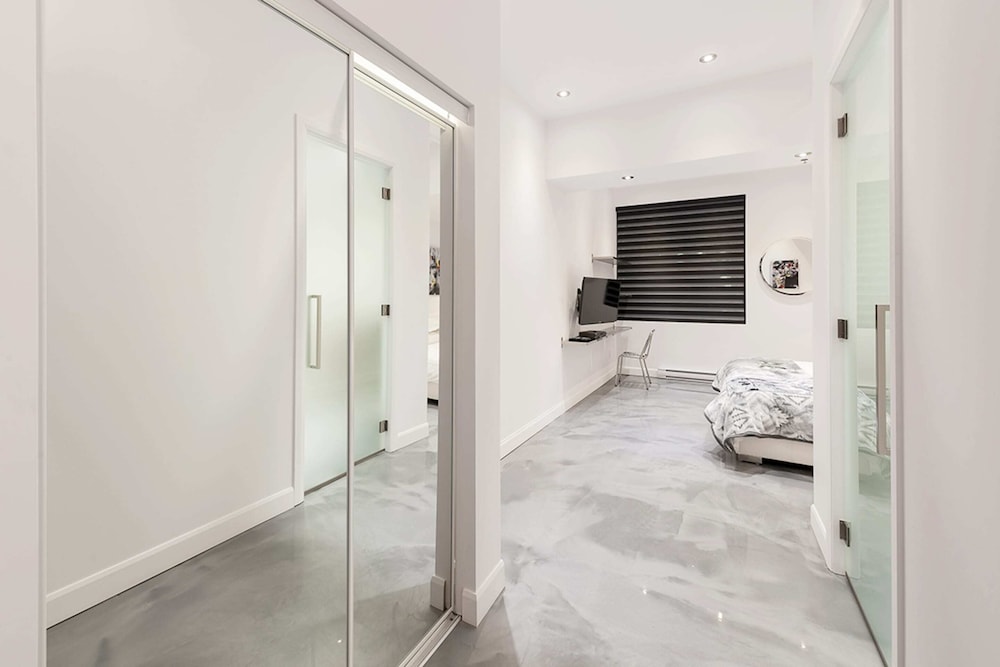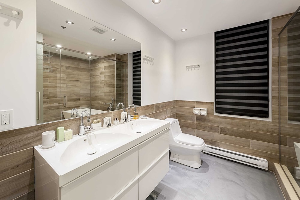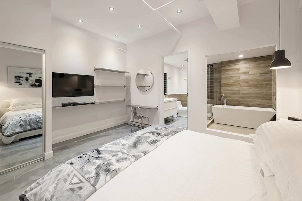 It's a very spacious penthouse 4BR/5bath space that is right in the heart of downtown Montreal. The living room has a huge TV (at least 70"), a massive kitchen and a Sonos sound system.