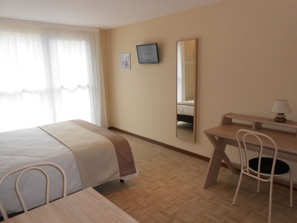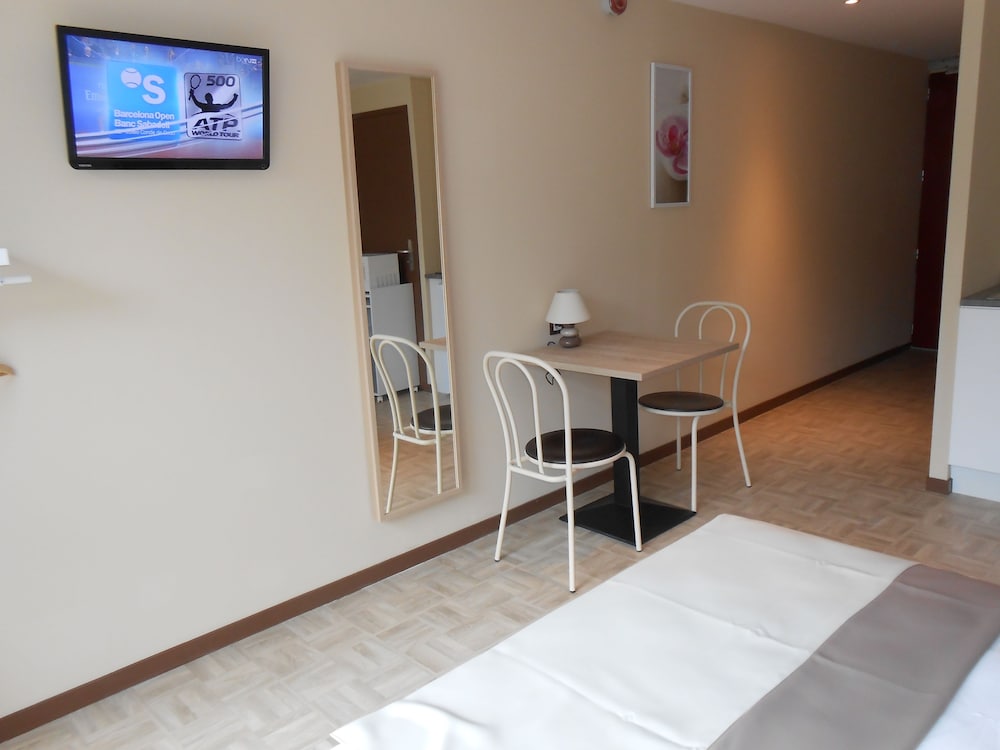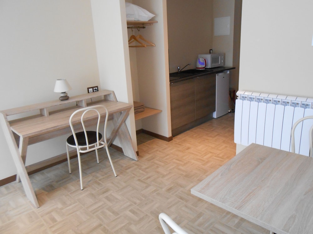 Chambre pratique avec le coin cuisine. Un peu petite pour 4. Idéal en voiture car parking et proche de l'autoroute.