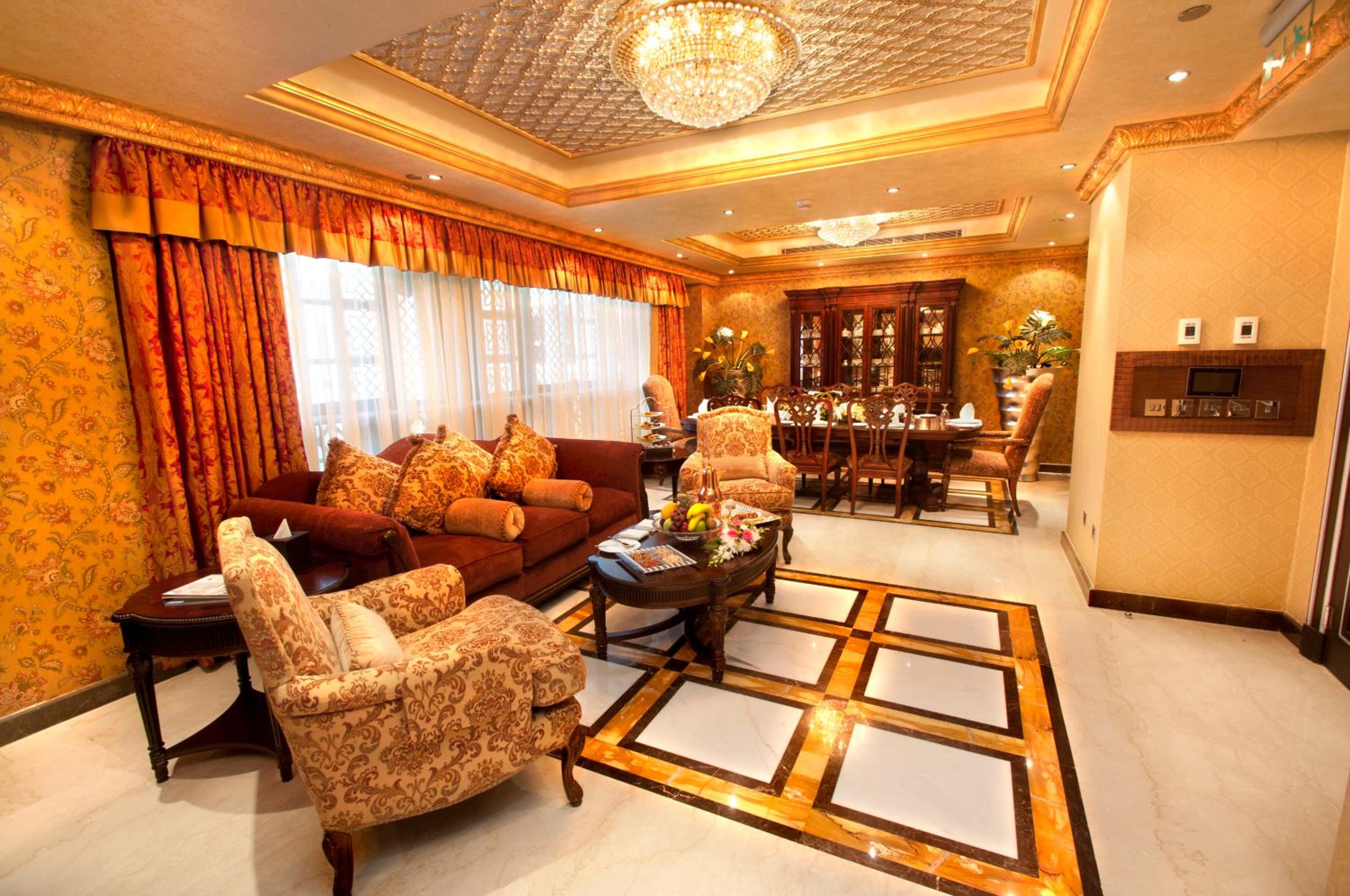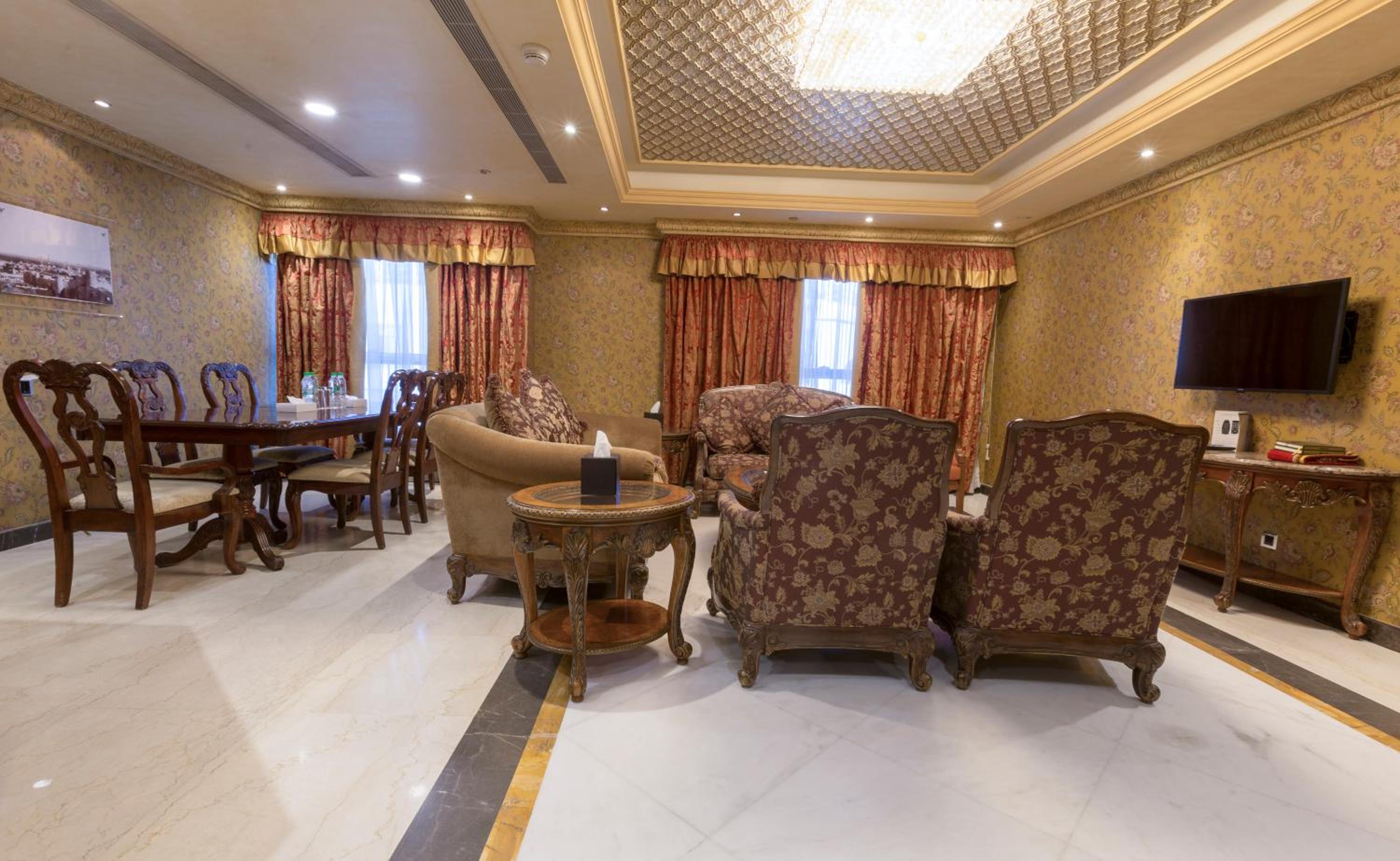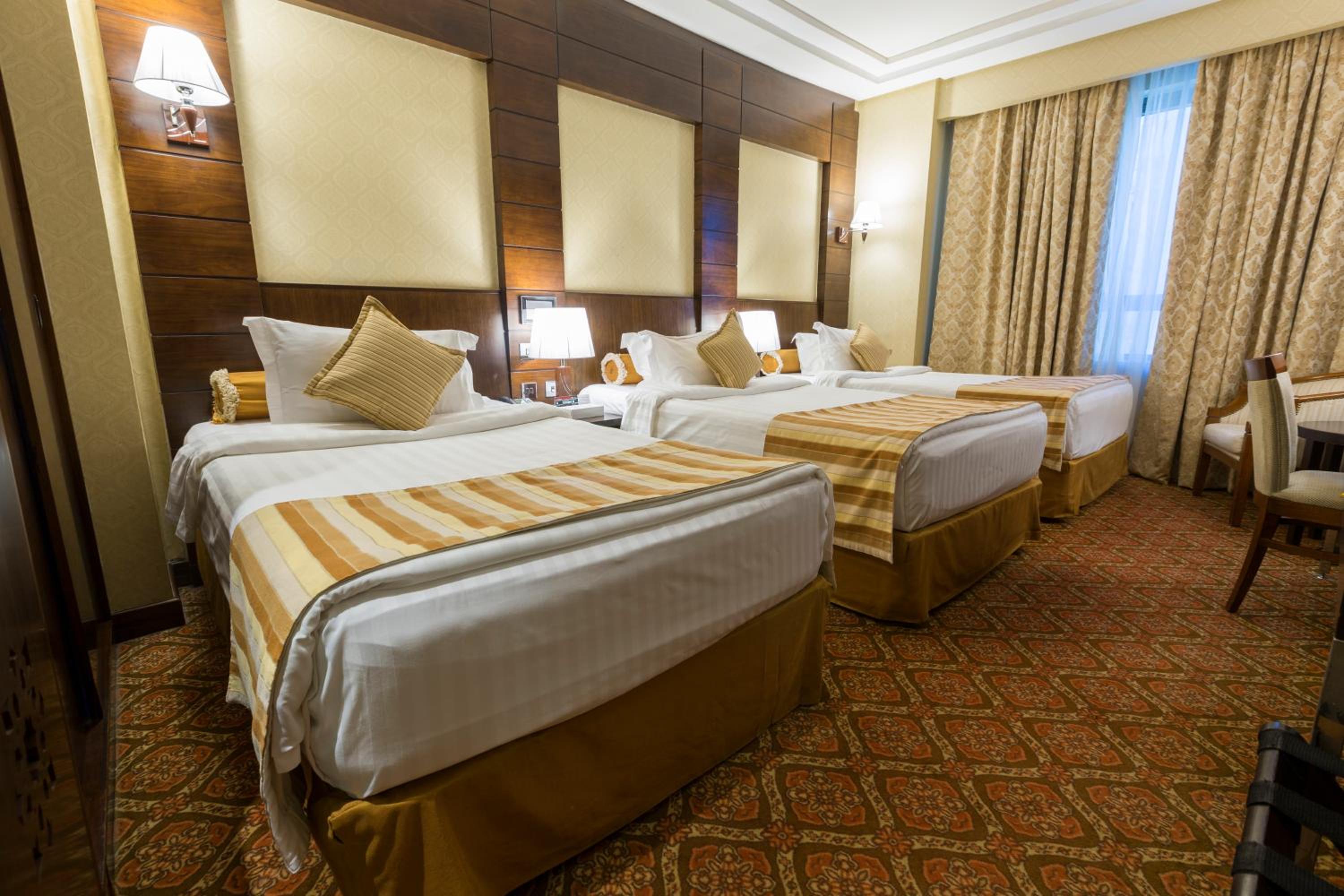 Indulge in luxuriously decorated rooms with a balcony at the Ruve Al Madinah Hotel, strategically located just 200 meters from Haram. Each room features wooden furniture, warm orange tones, a flat-screen TV, work desk, and minibar. Some rooms even offer a separate living room with a dining area.