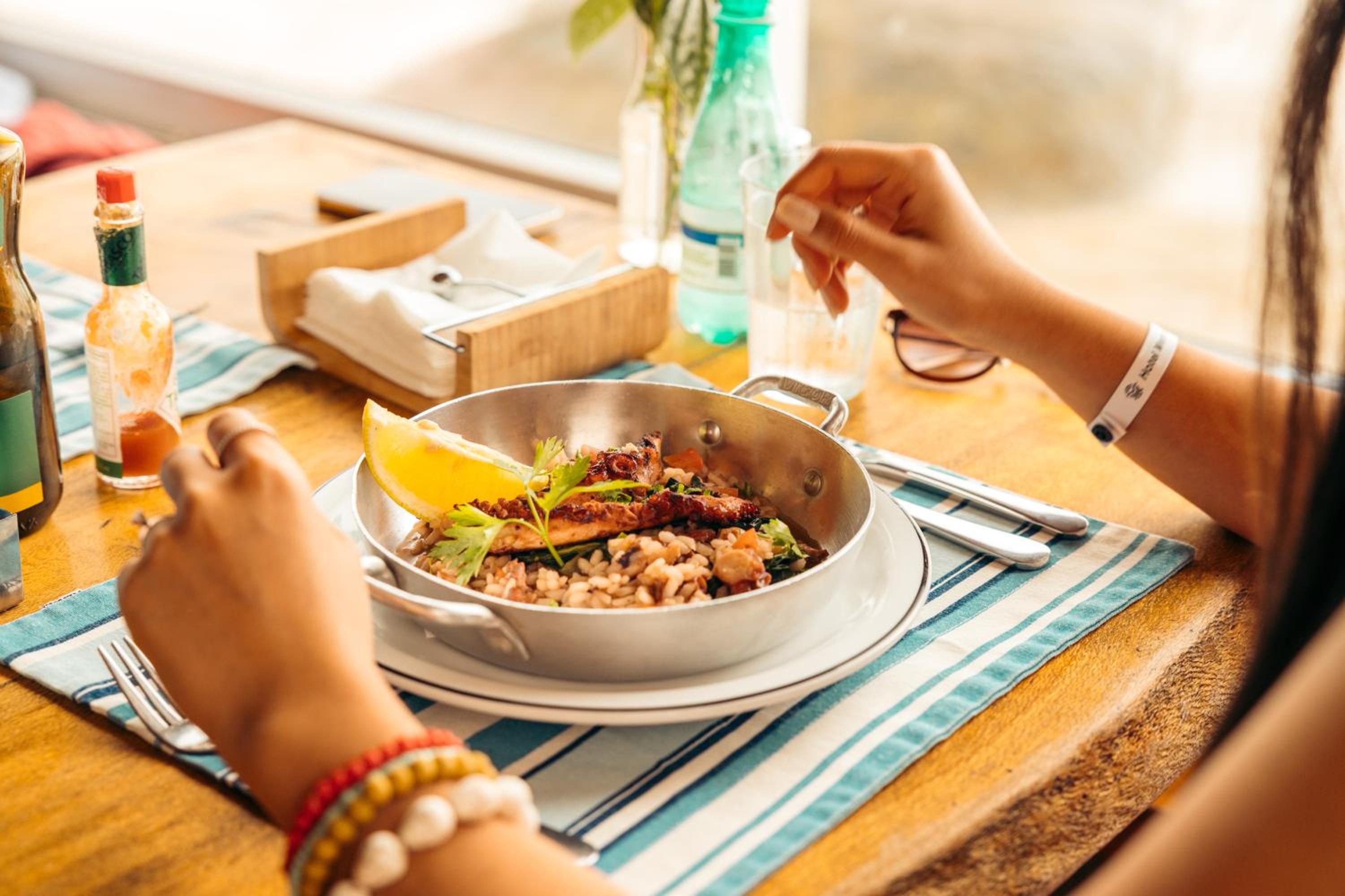 Piscinas e restaurante.