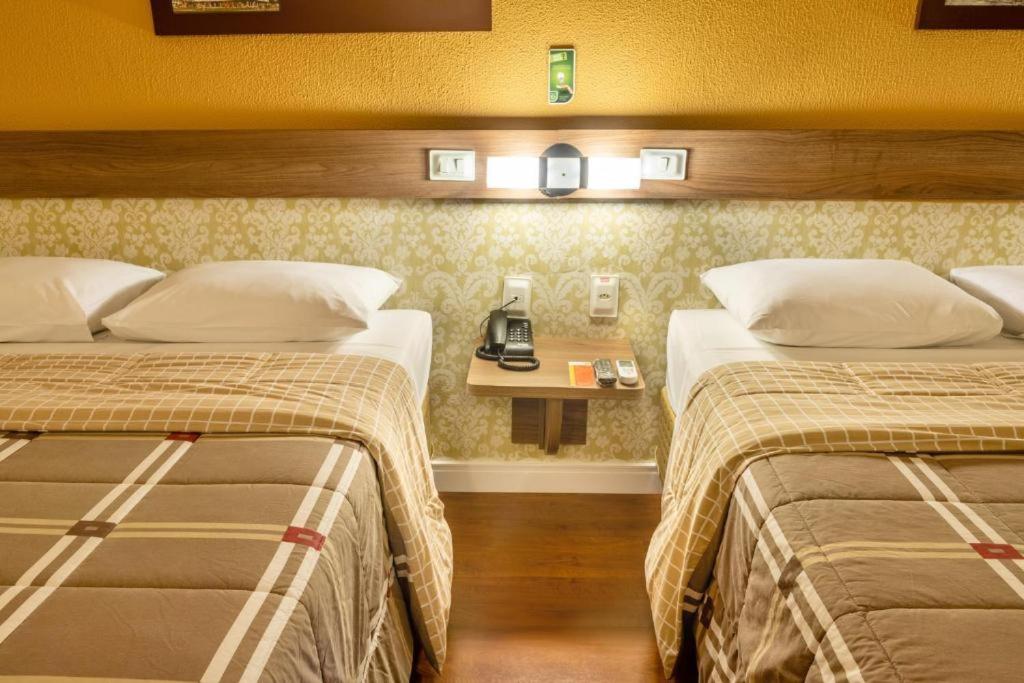 Duas camas de casal de bom tamanho, quarto espaçoso. Café da manhã regular, com o essencial. Estacionamento fácil, que chega direto no elevador.