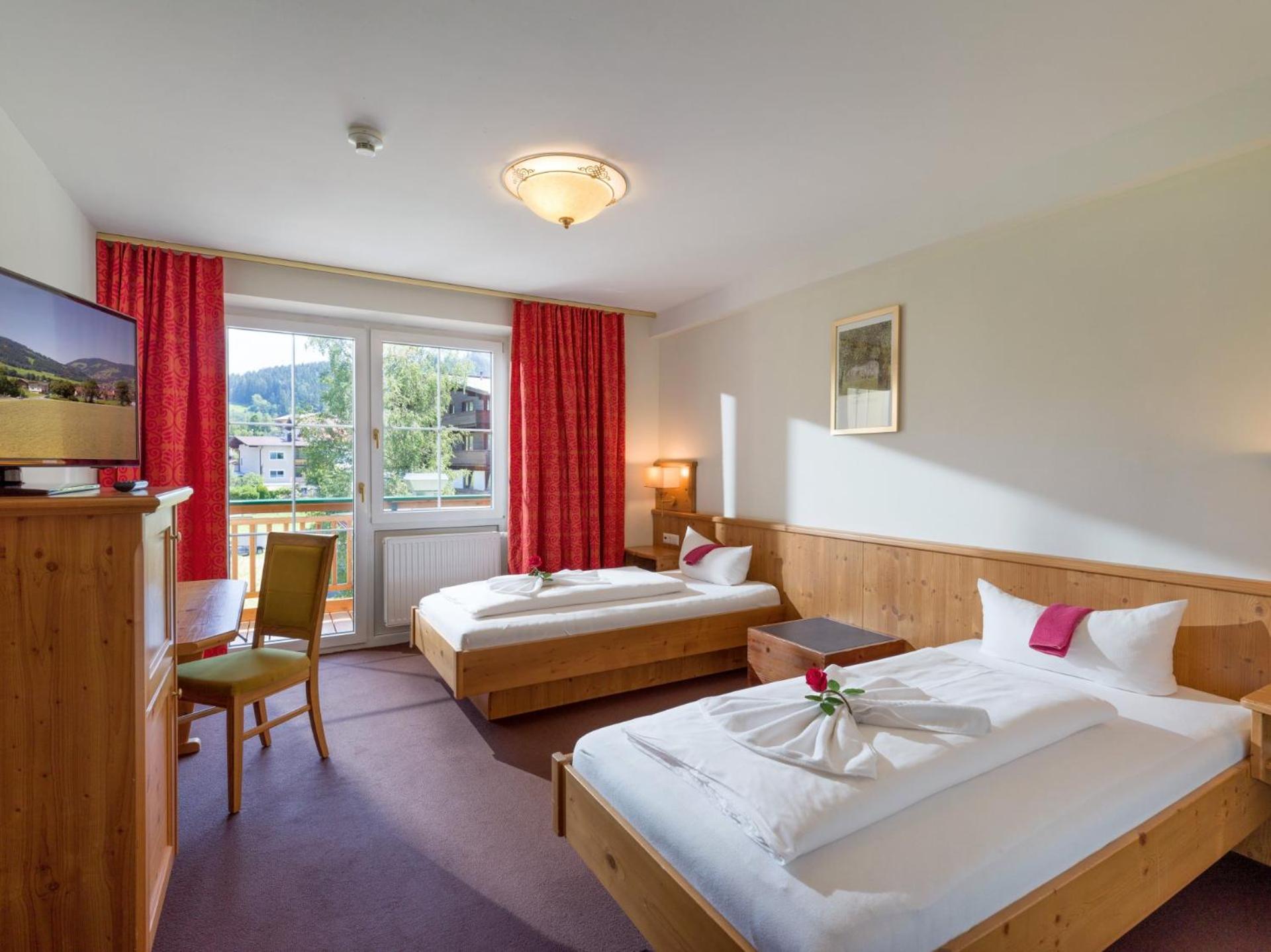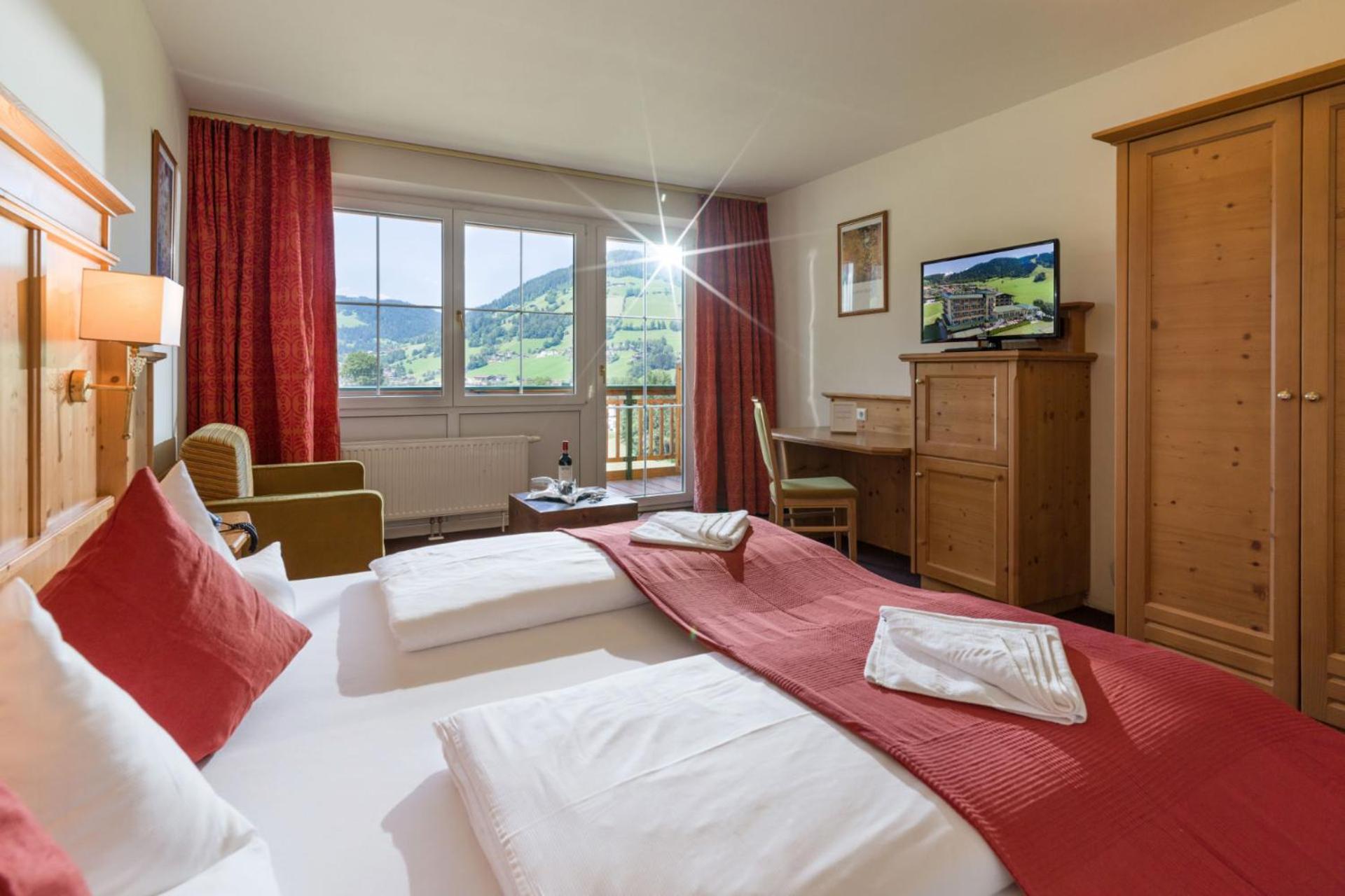 Luxurious Amenities: Hotel Harfenwirt offers an indoor pool, sauna, and hot tub for guests to unwind after a day on the slopes. The spacious rooms, furnished in a traditional Tyrolean style, provide a cozy retreat with modern amenities including flat-screen TVs and balconies.